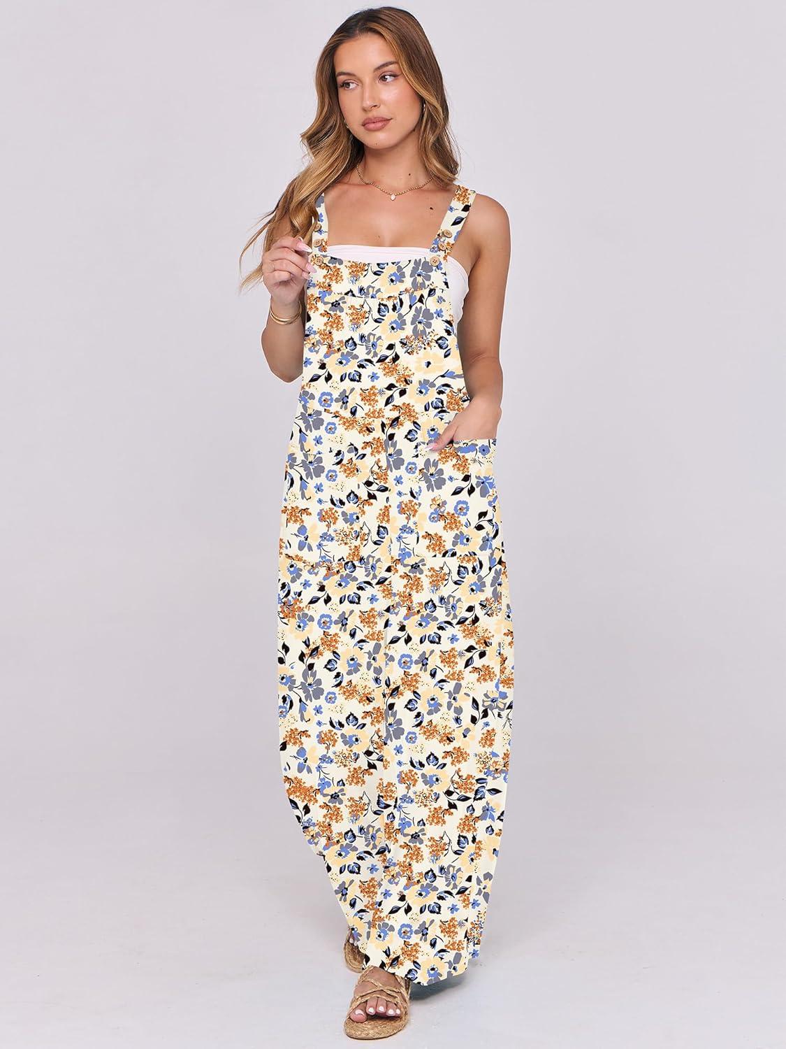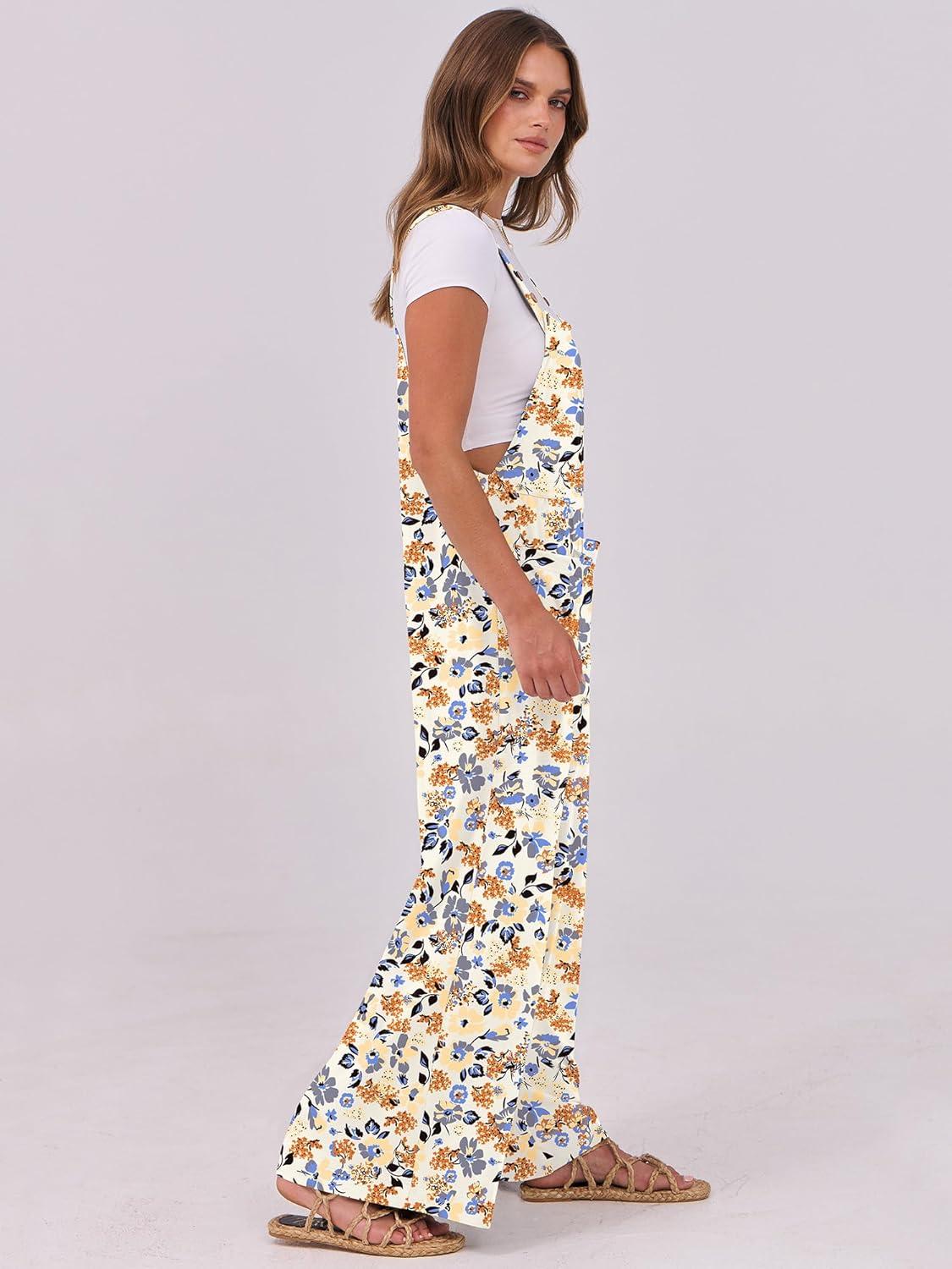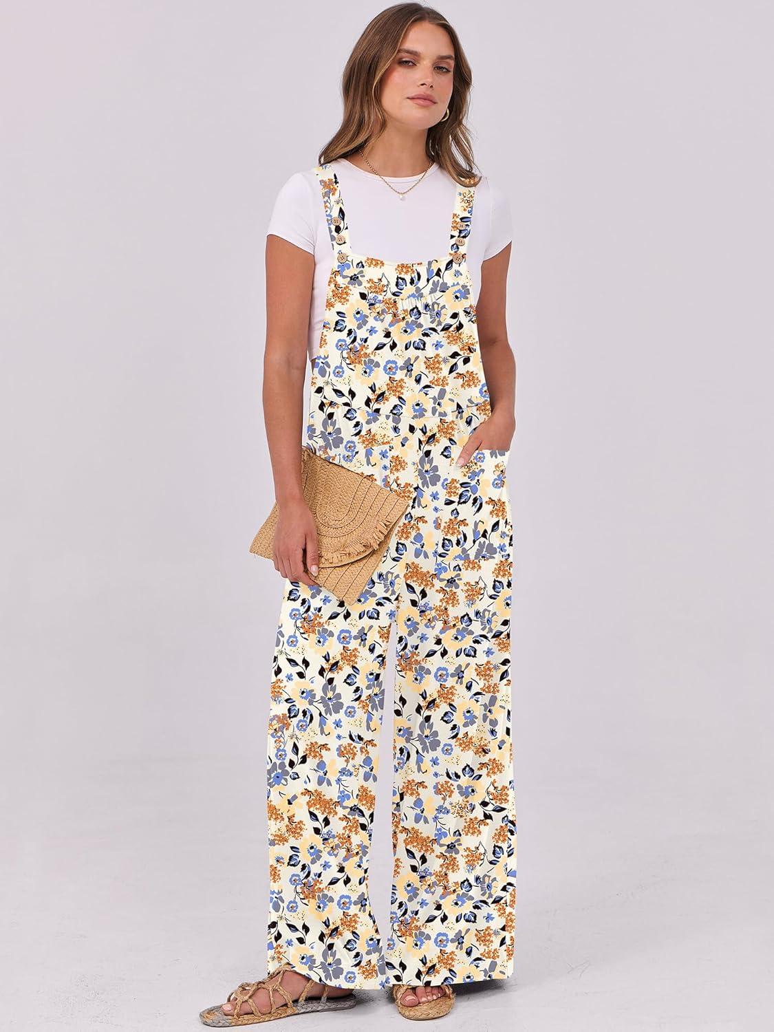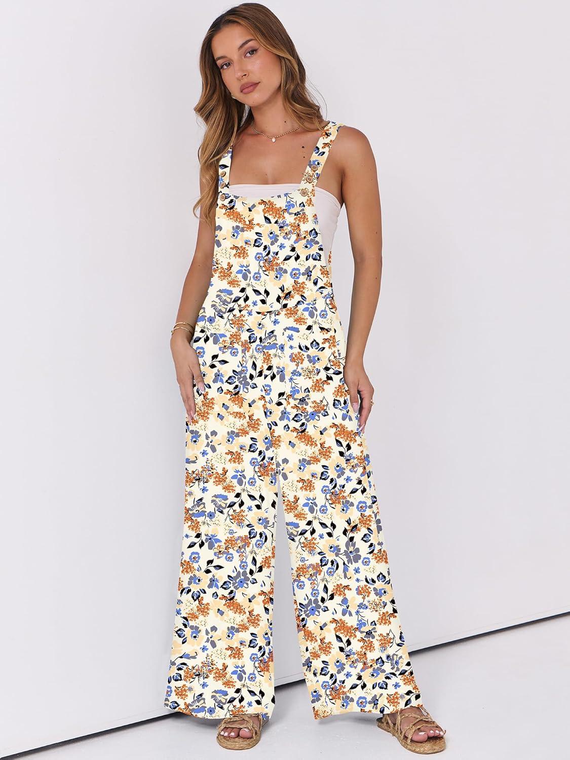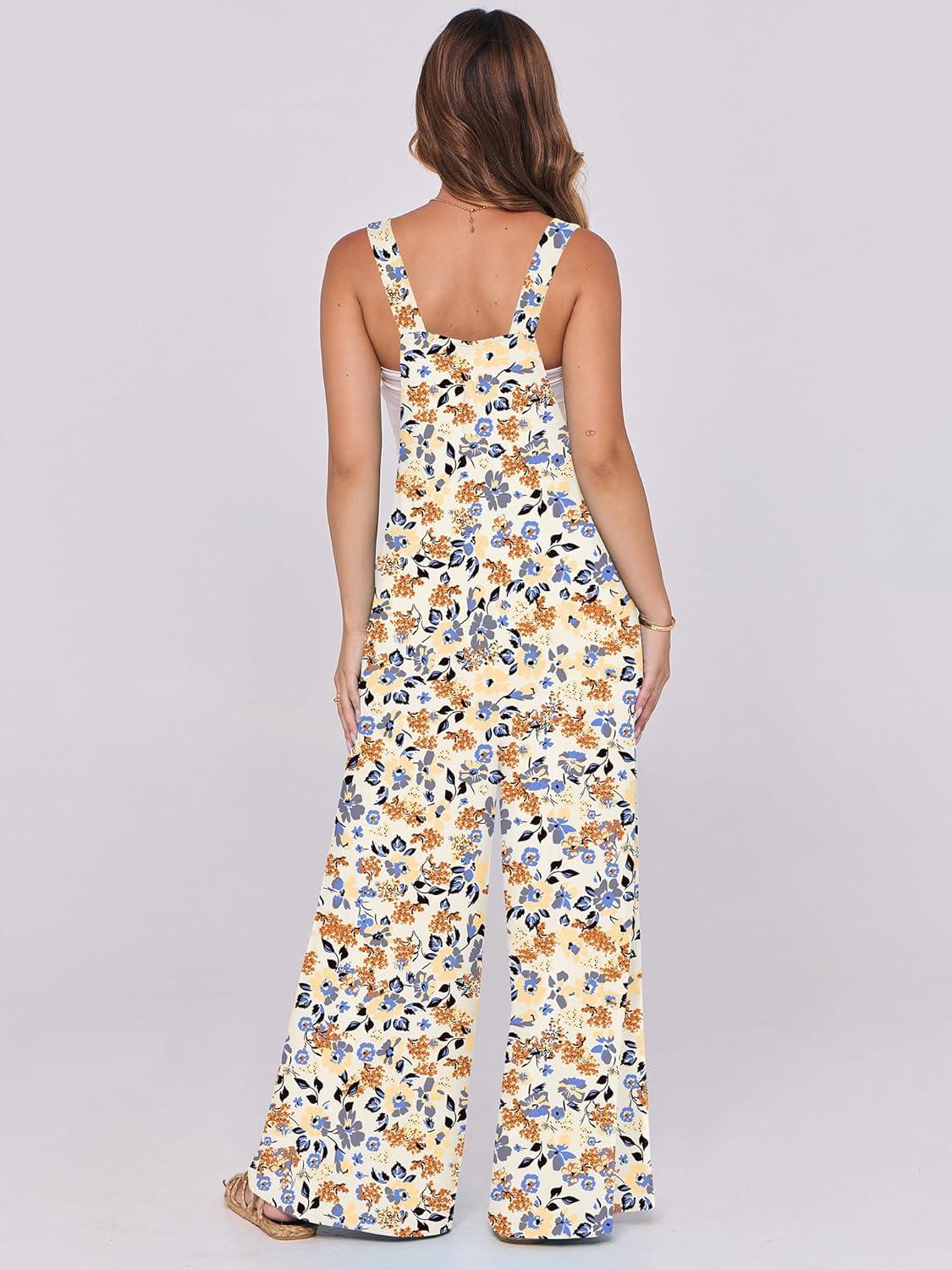 ANRABESS Women Jumpsuits Overalls Wide Leg Casual Baggy Romper Boho Loose Bib Jumpers Sleeveless Straps 2025 Summer Outfits(Beige Floral)