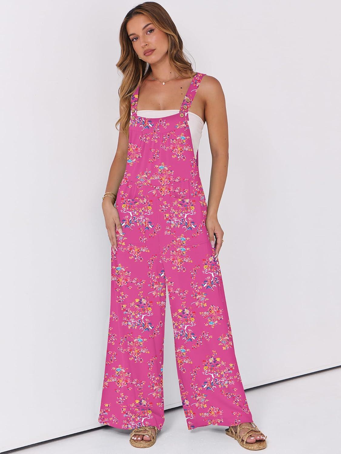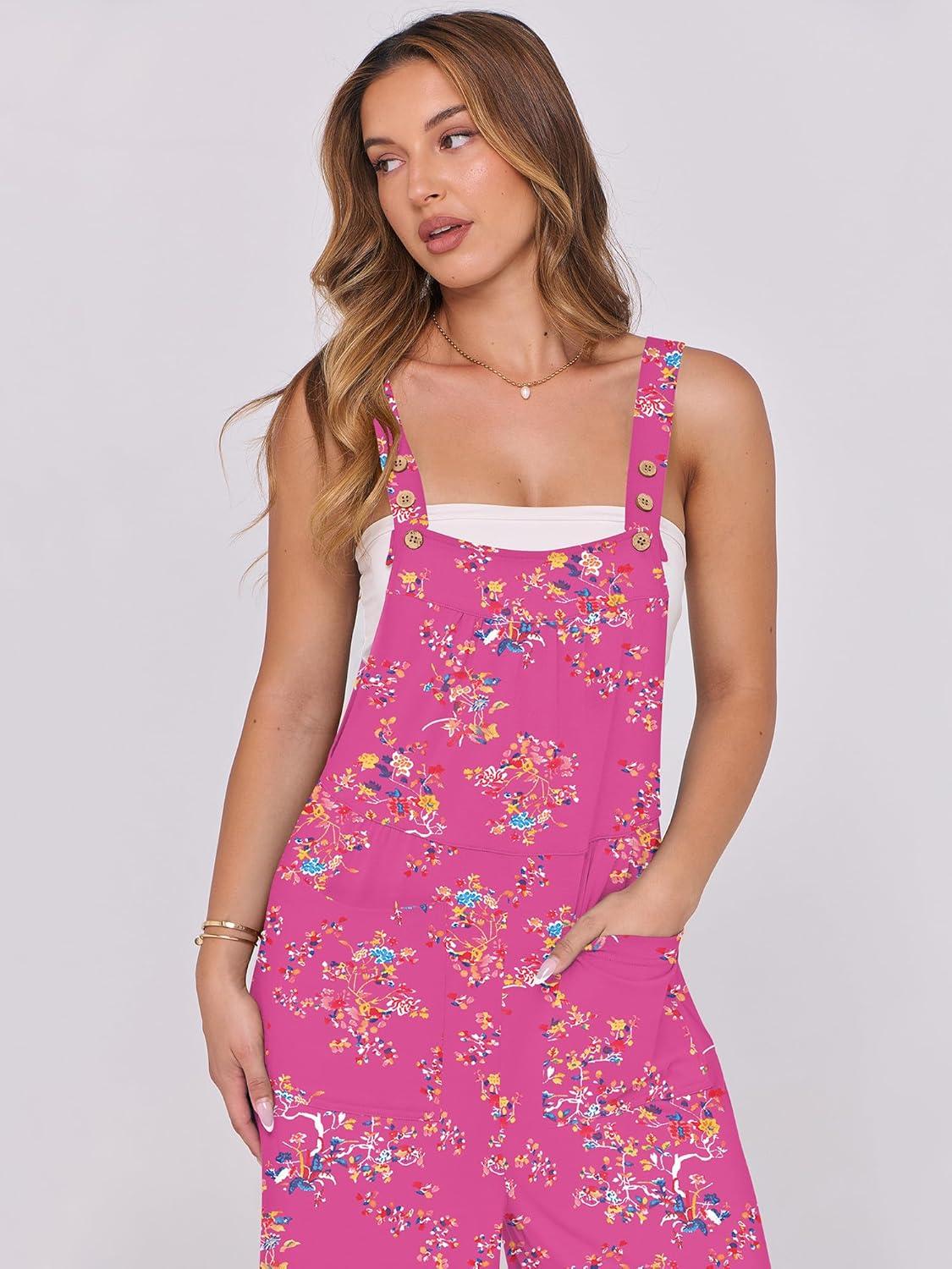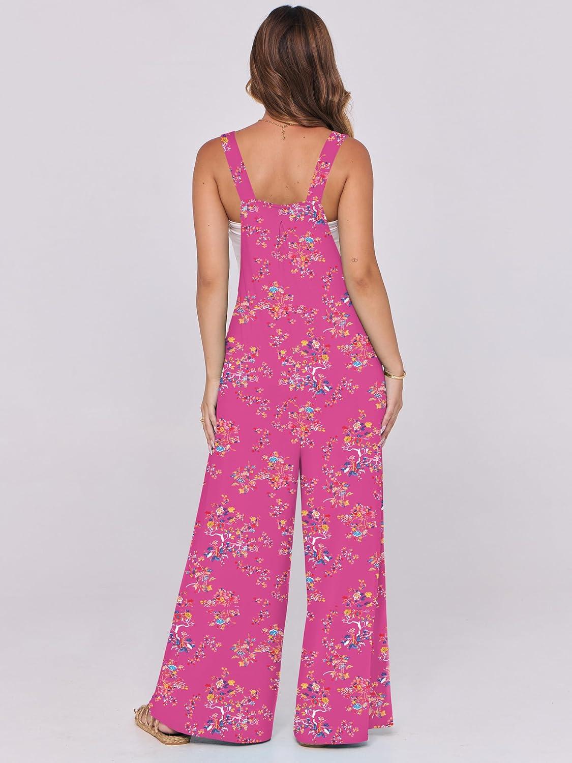 ANRABESS Women Jumpsuits Overalls Wide Leg Casual Baggy Romper Boho Loose Bib Jumpers Sleeveless Straps 2025 Summer Outfits(Hot Pink Floral)
