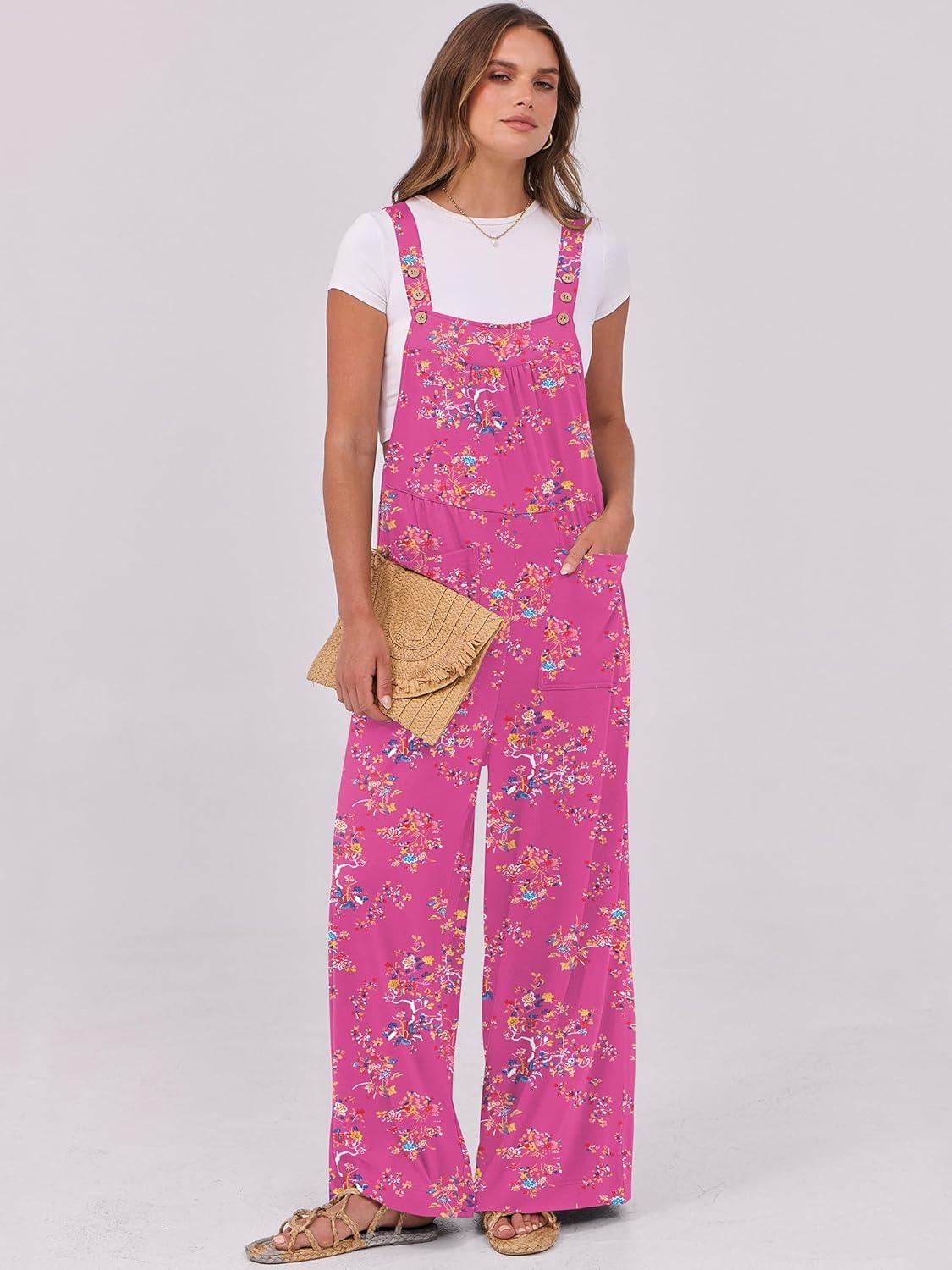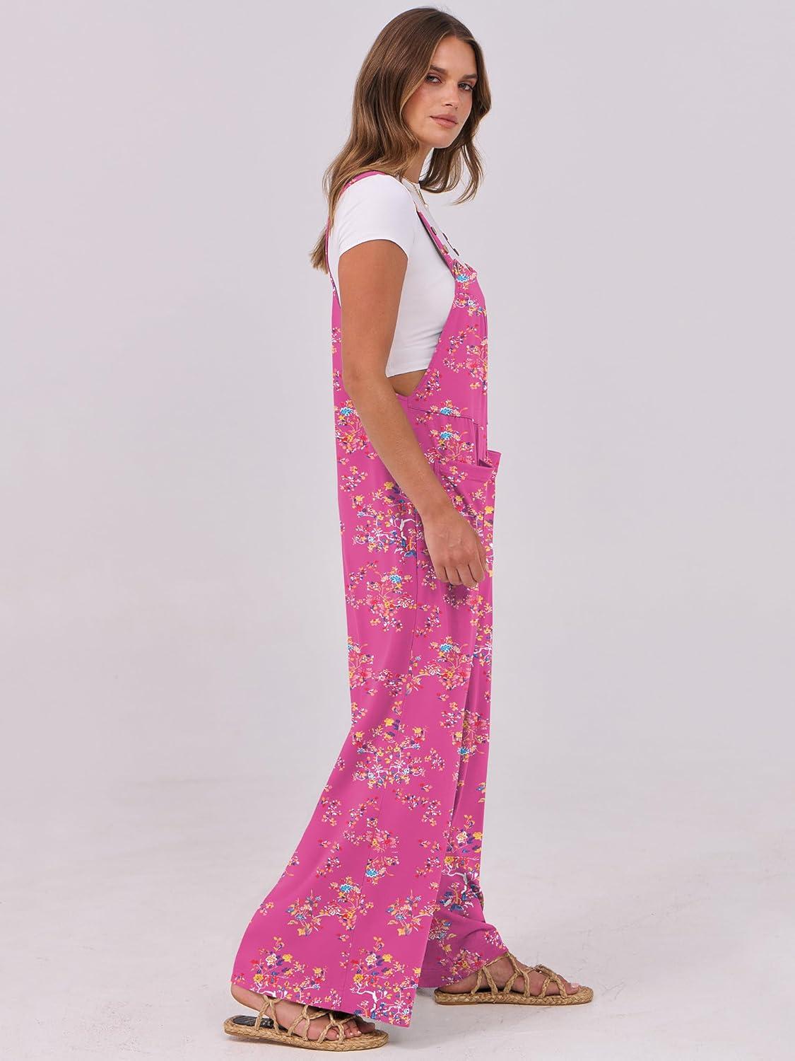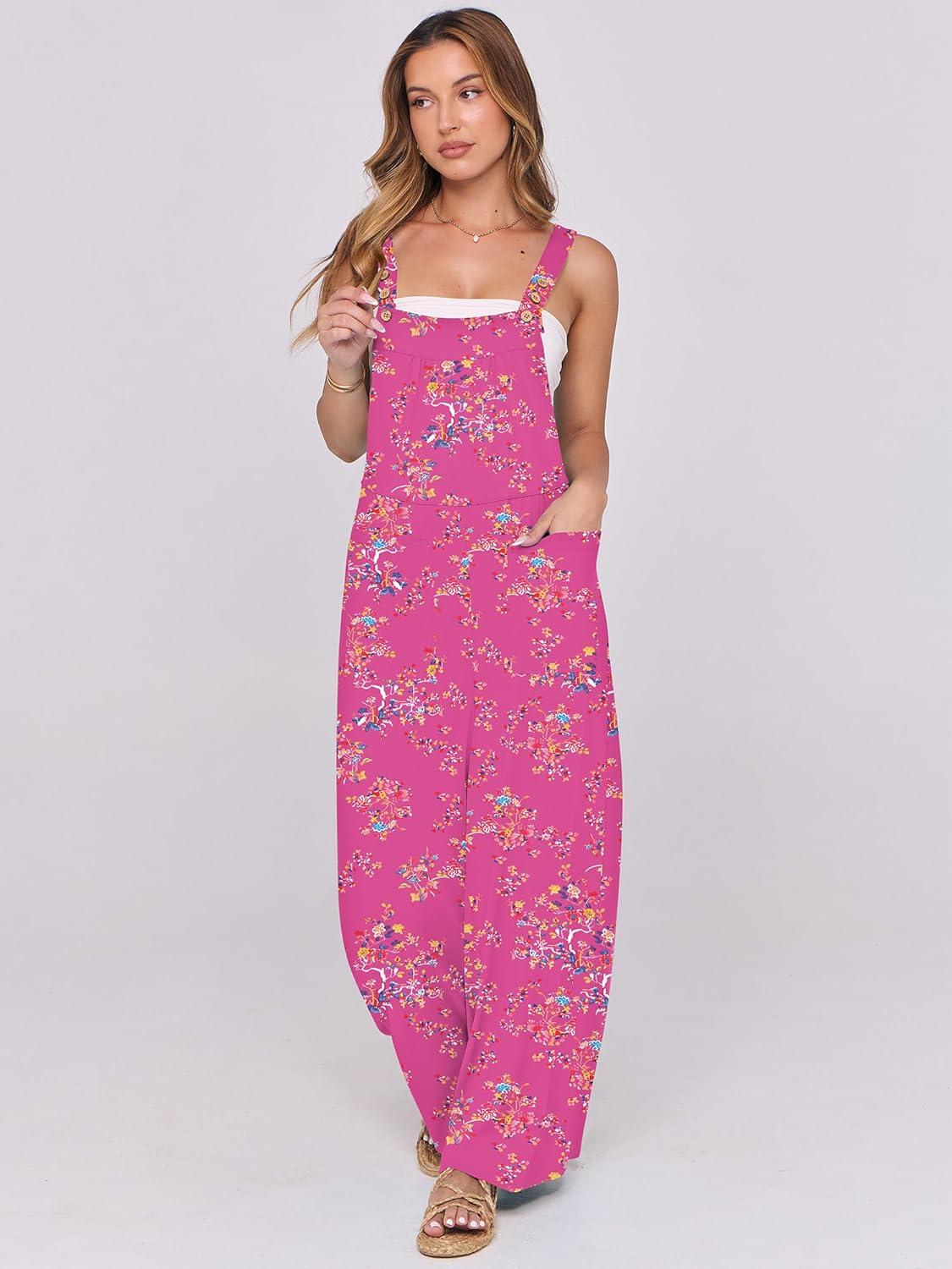 ANRABESS Women Jumpsuits Overalls Wide Leg Casual Baggy Romper Boho Loose Bib Jumpers Sleeveless Straps 2025 Summer Outfits(Hot Pink Floral)