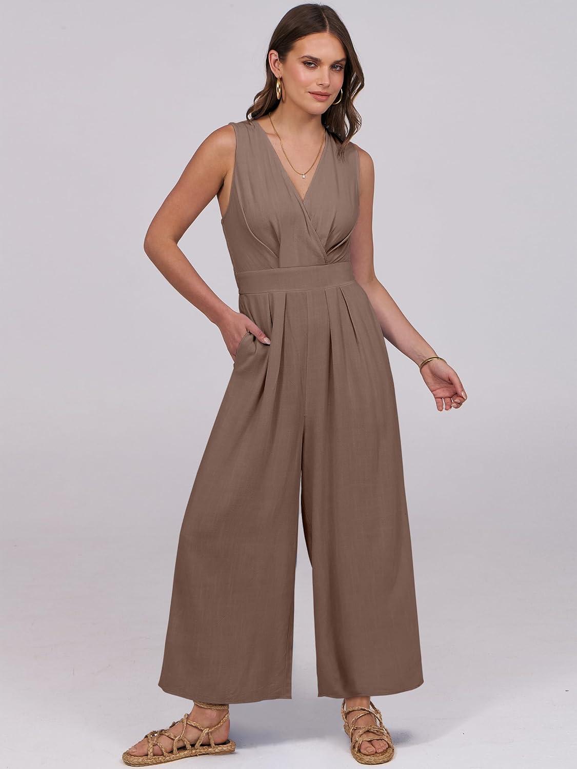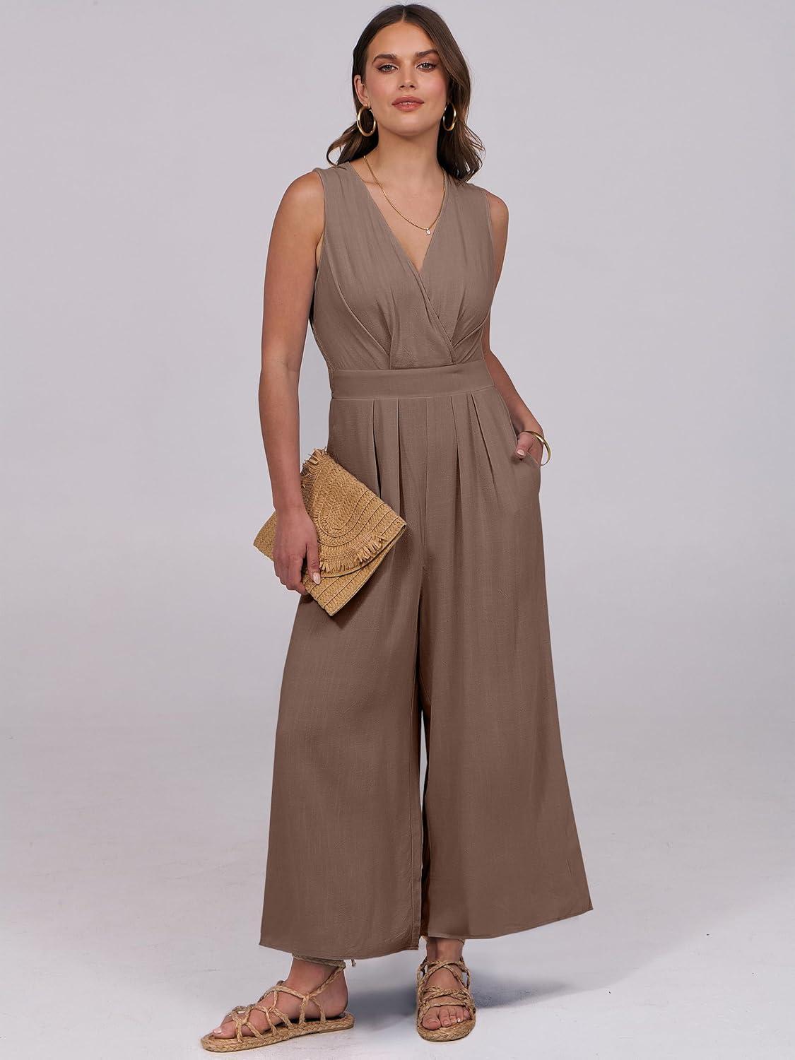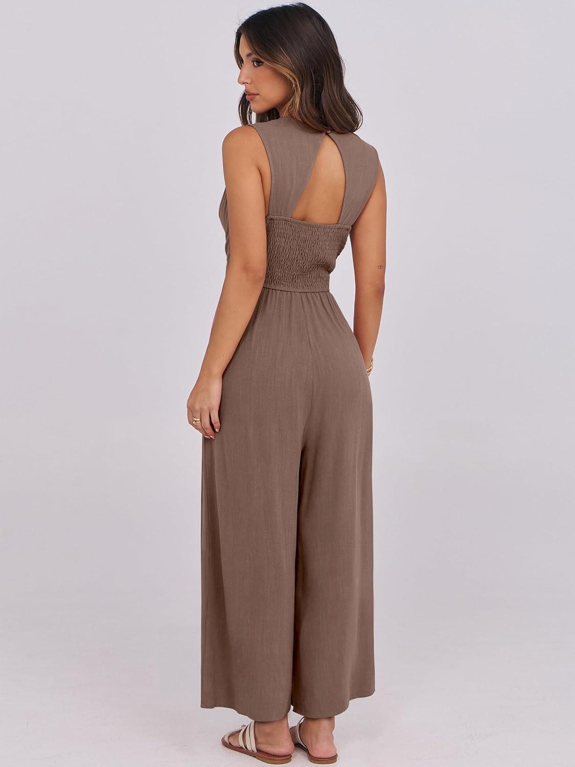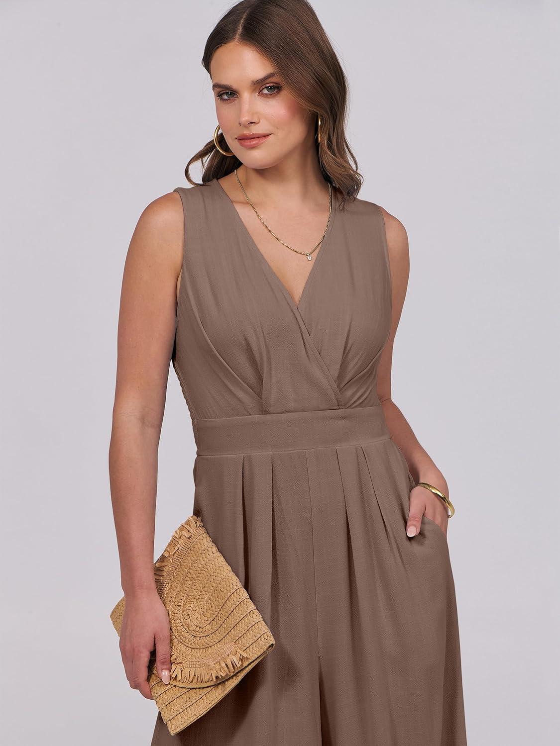 ANRABESS Women Jumpsuits Sleeveless V Neck Elegant Dressy Casual Backless One Piece Pants Romper 2025 Summer Outfits(Brown)