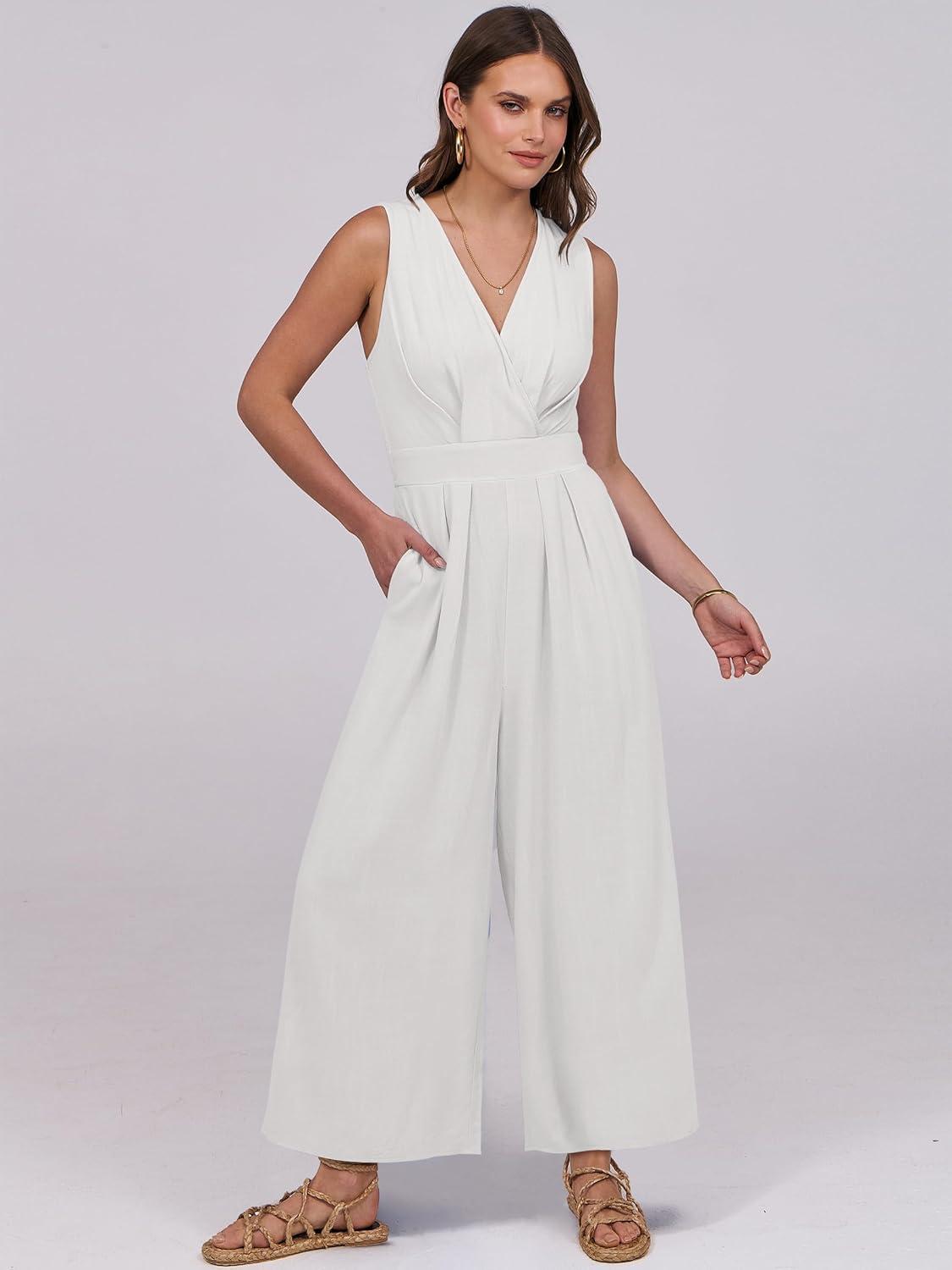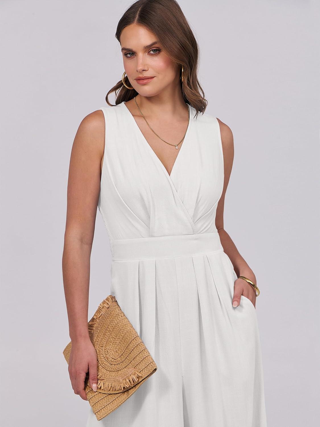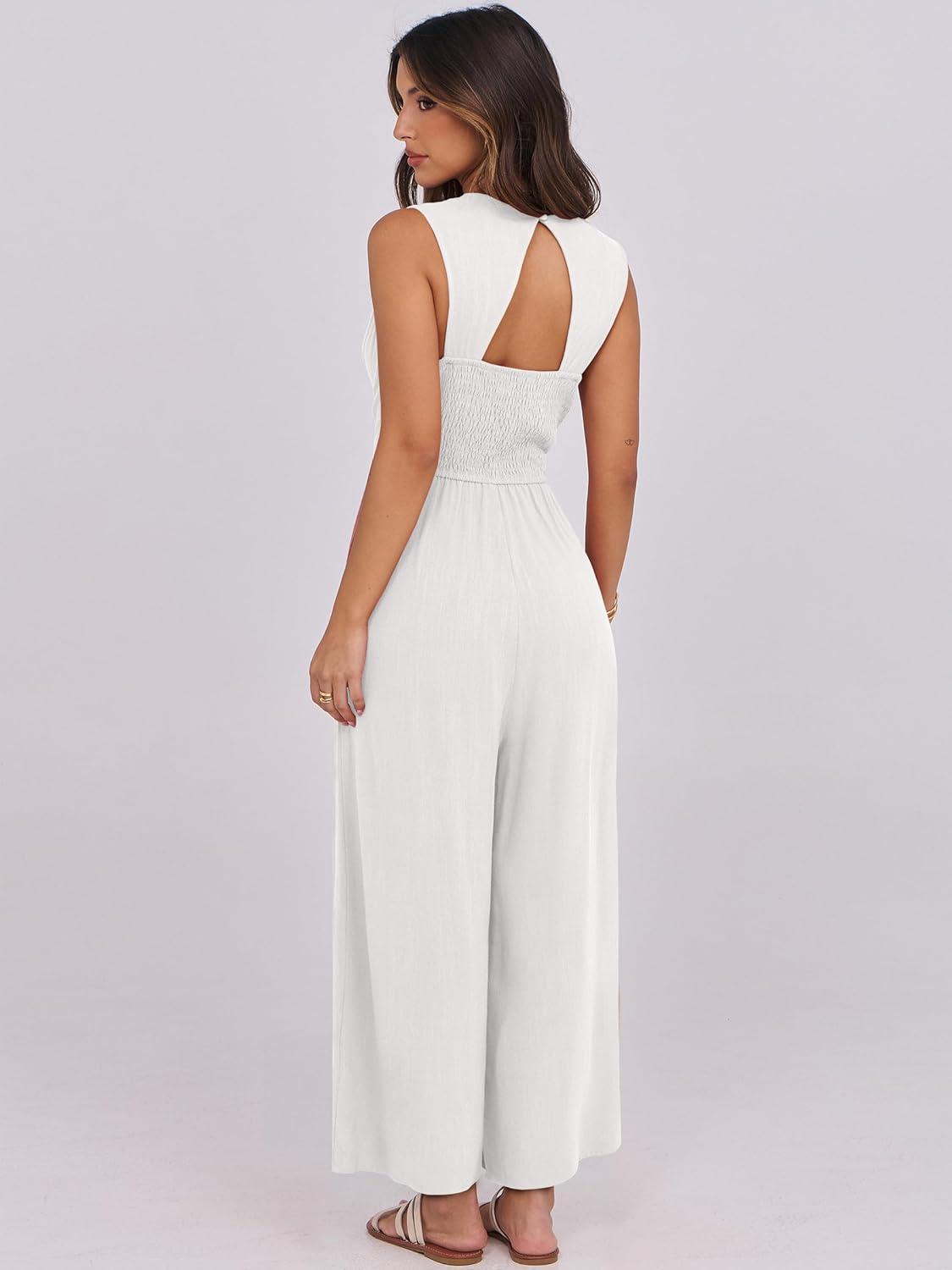 ANRABESS Women Jumpsuits Sleeveless V Neck Elegant Dressy Casual Backless One Piece Pants Romper 2025 Summer Outfits(White)