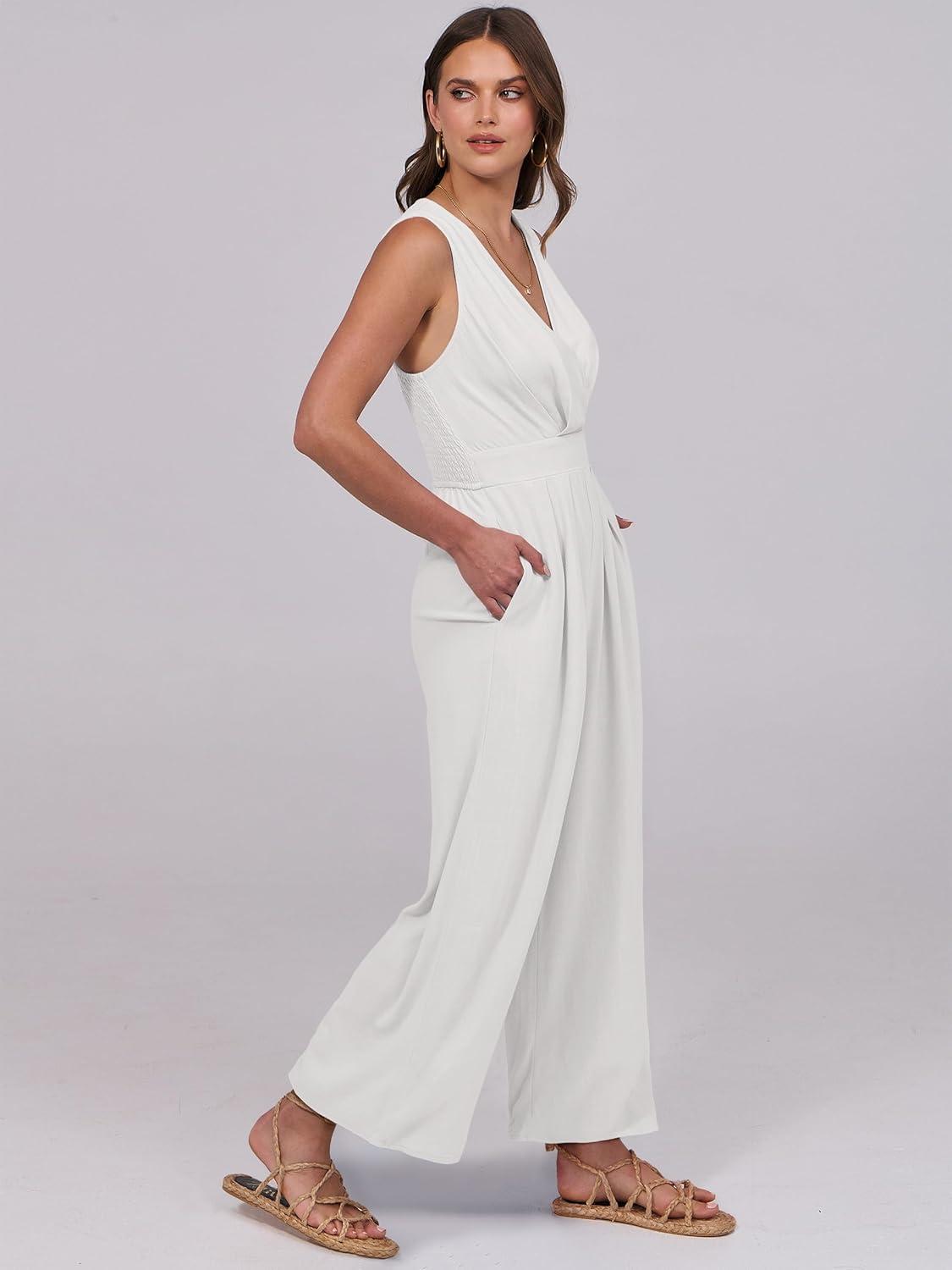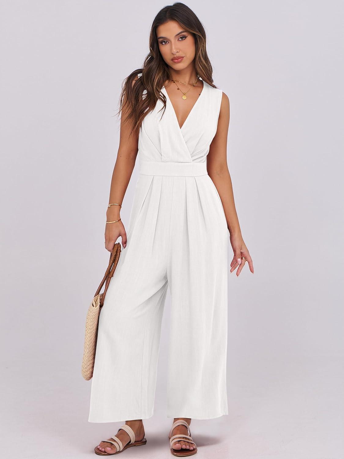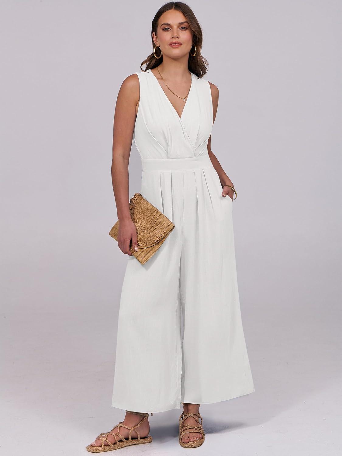 ANRABESS Women Jumpsuits Sleeveless V Neck Elegant Dressy Casual Backless One Piece Pants Romper 2025 Summer Outfits(White)