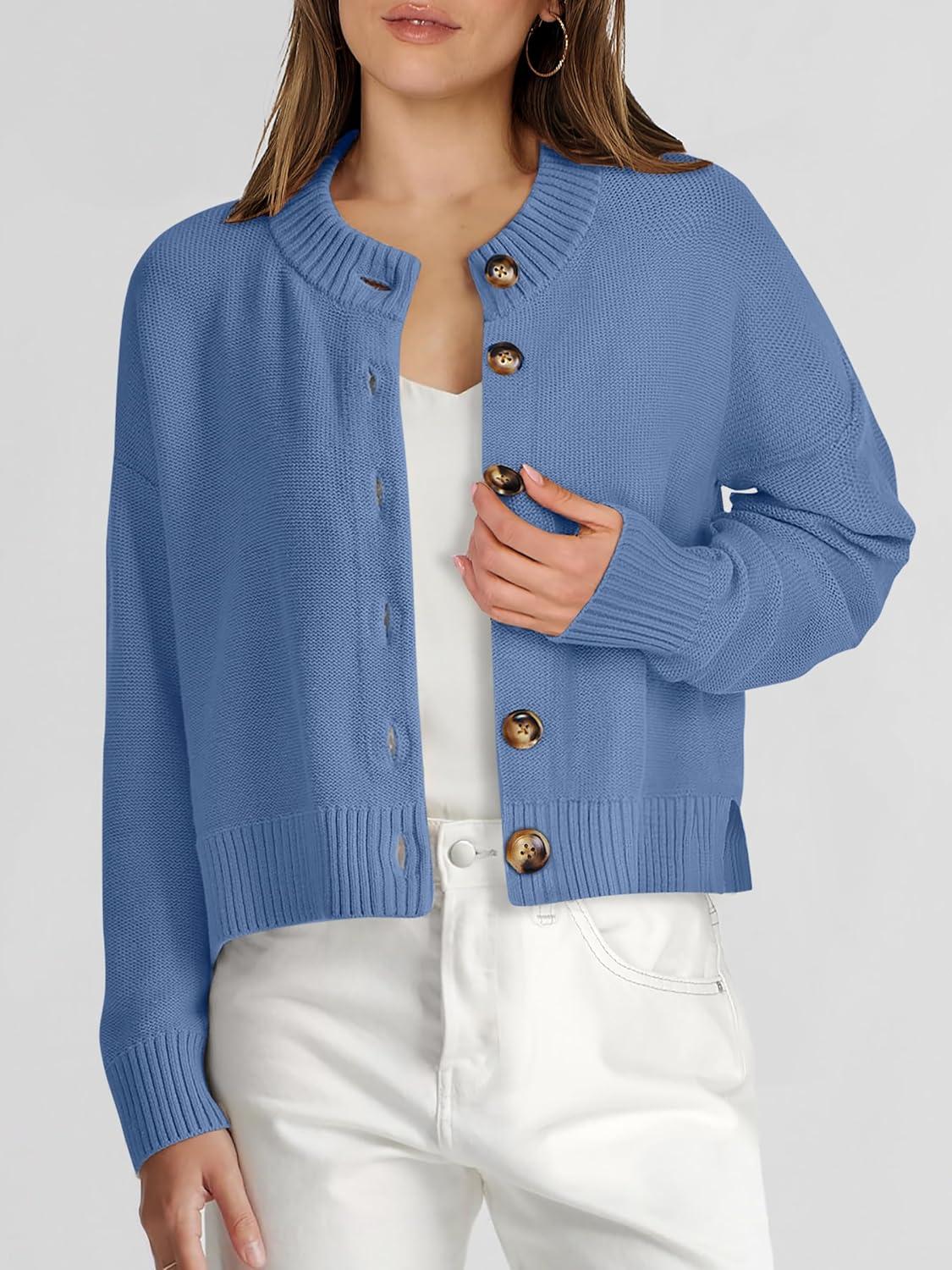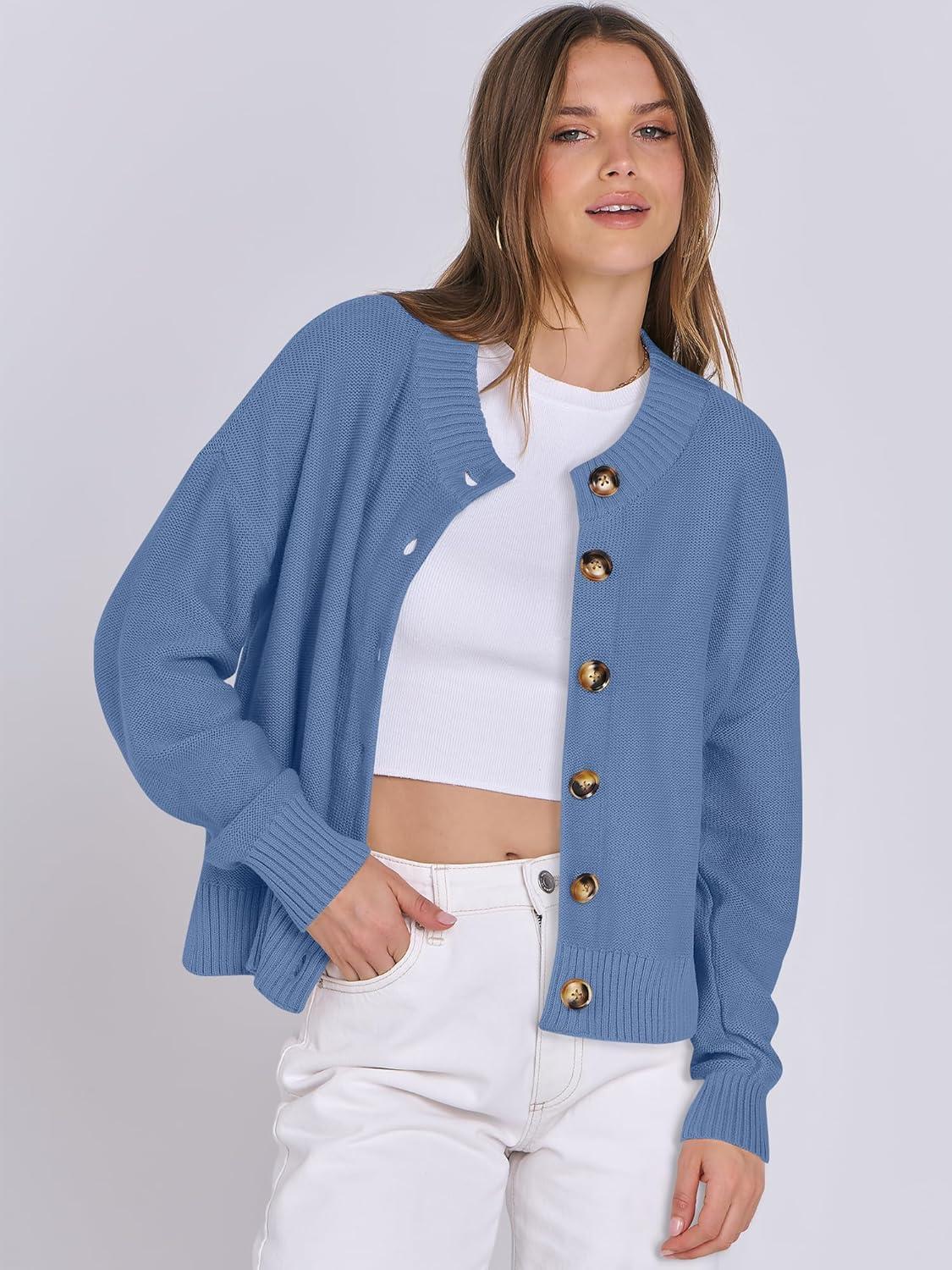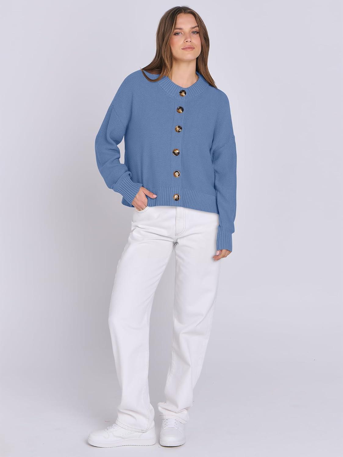 ANRABESS Women Knit Cardigans Sweater Open Front Button Down Long Sleeve Cropped Lady Jacket Outwear 2025 Fall Outfits(Denim Blue)