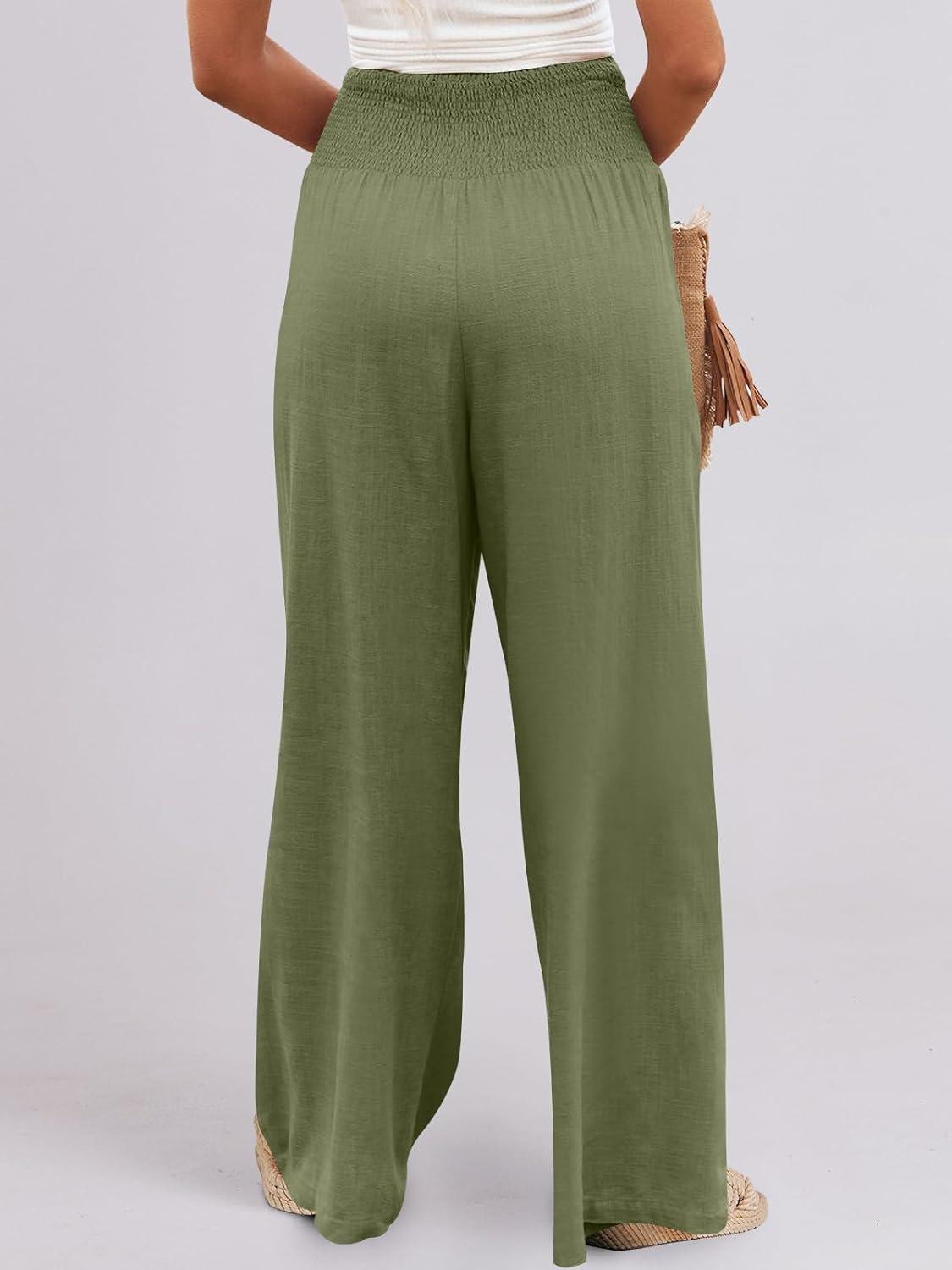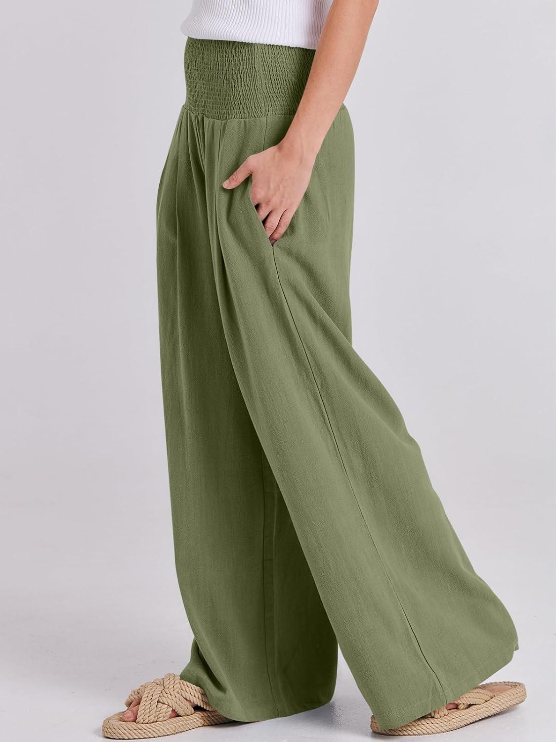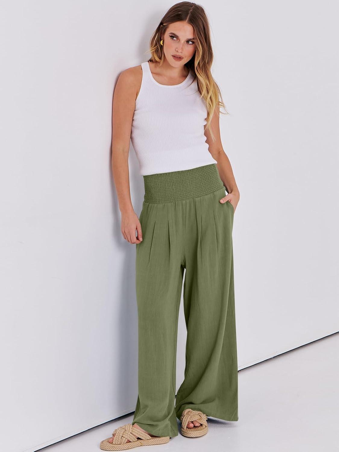 ANRABESS Women Linen Palazzo Pants Summer Boho Wide Leg High Waist Casual Lounge Pant 2025 Beach Travel Vacation Outfits(Army Green)