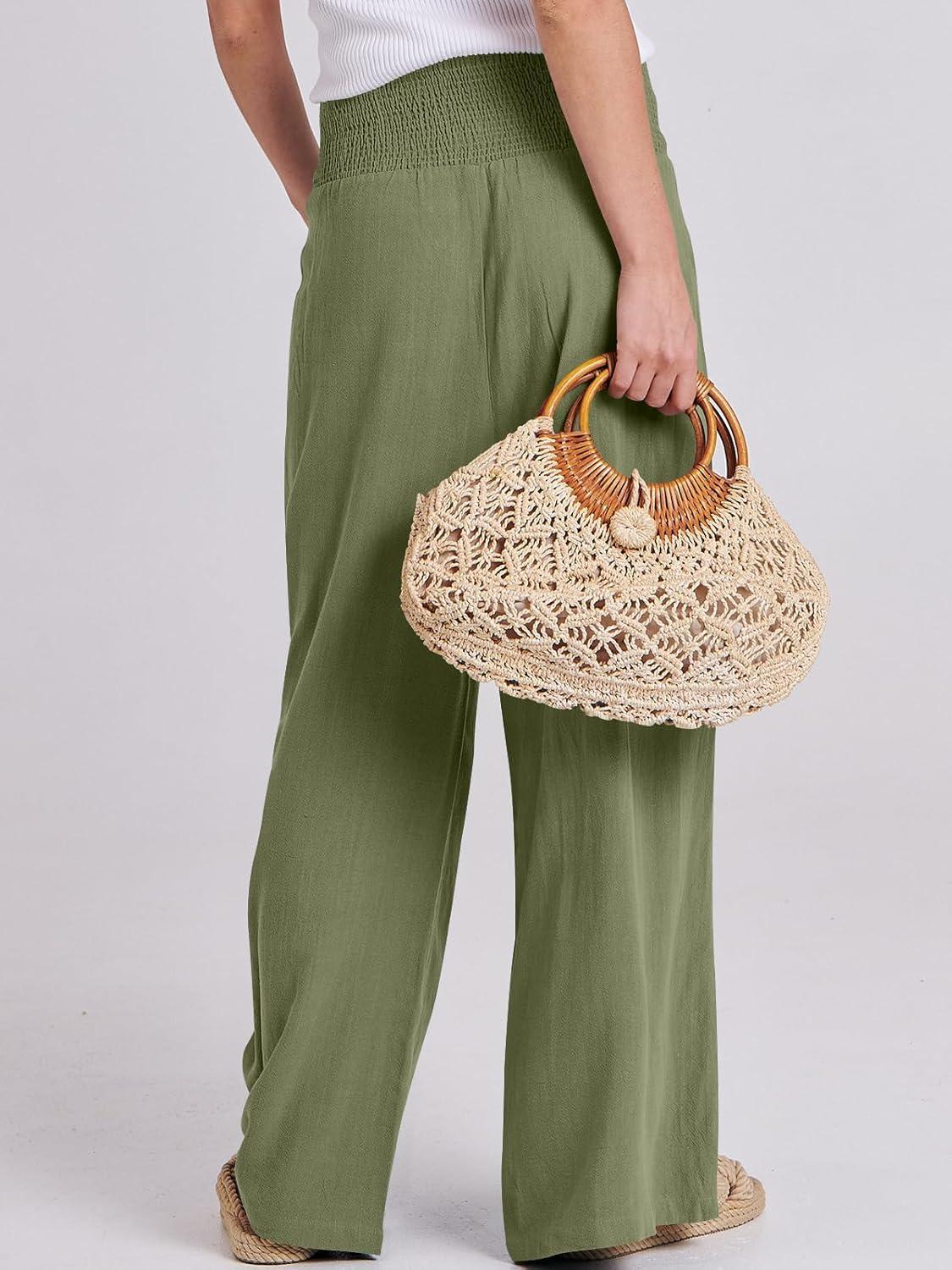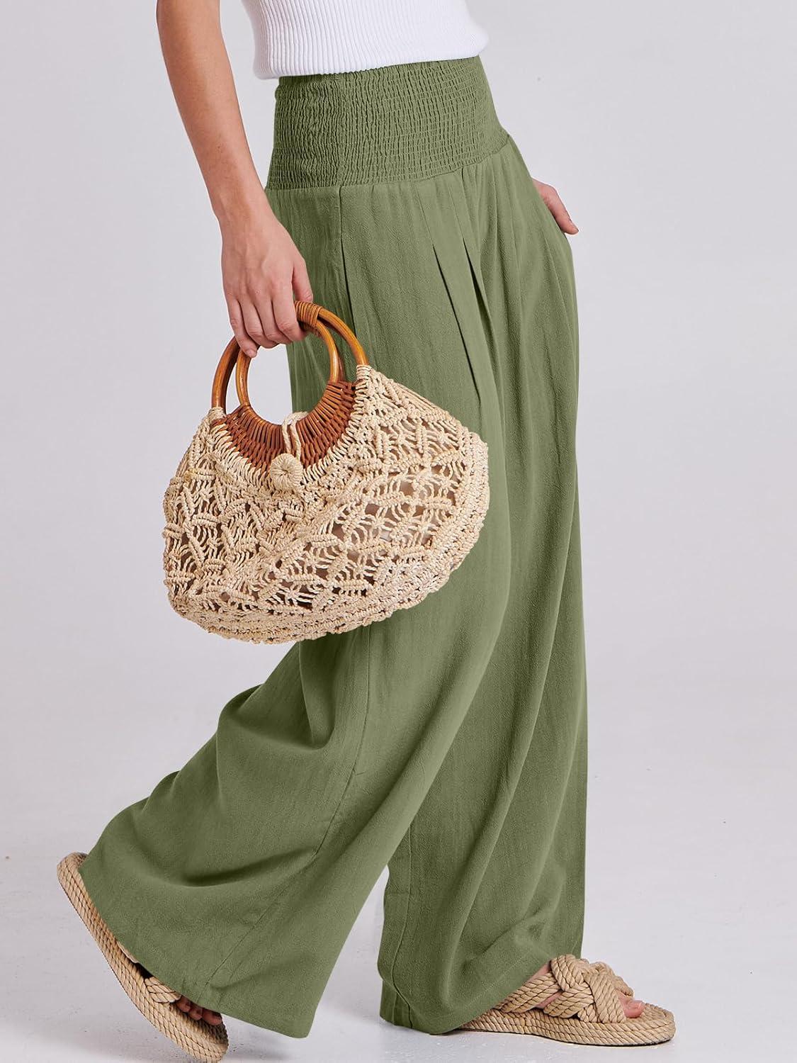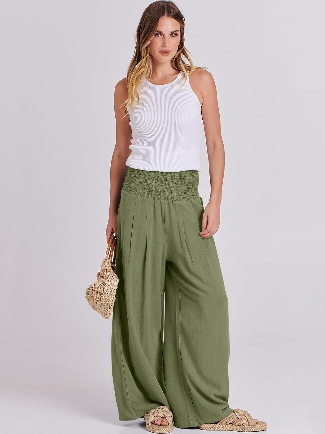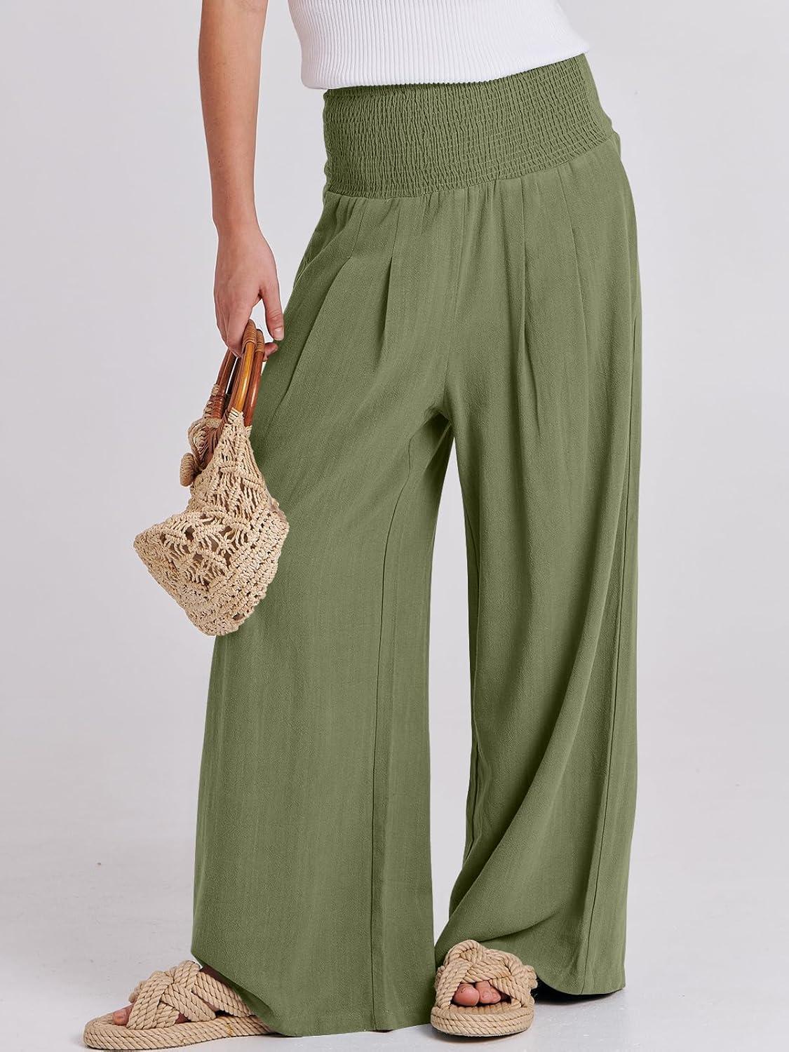 ANRABESS Women Linen Palazzo Pants Summer Boho Wide Leg High Waist Casual Lounge Pant 2025 Beach Travel Vacation Outfits(Army Green)