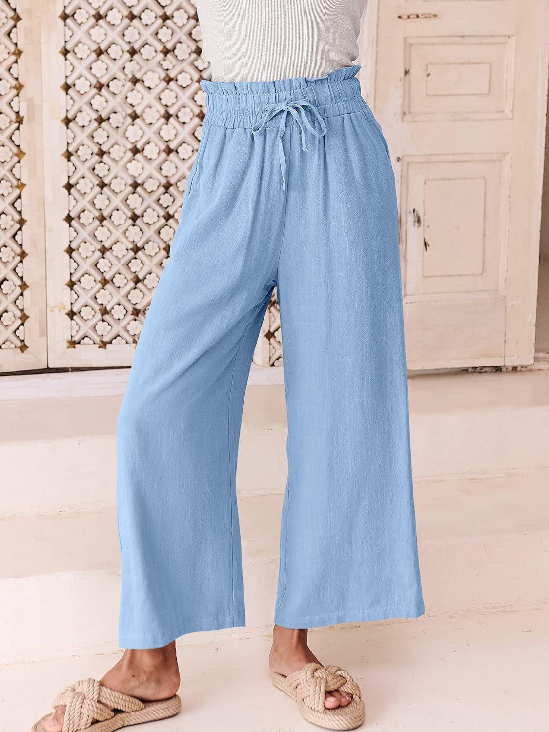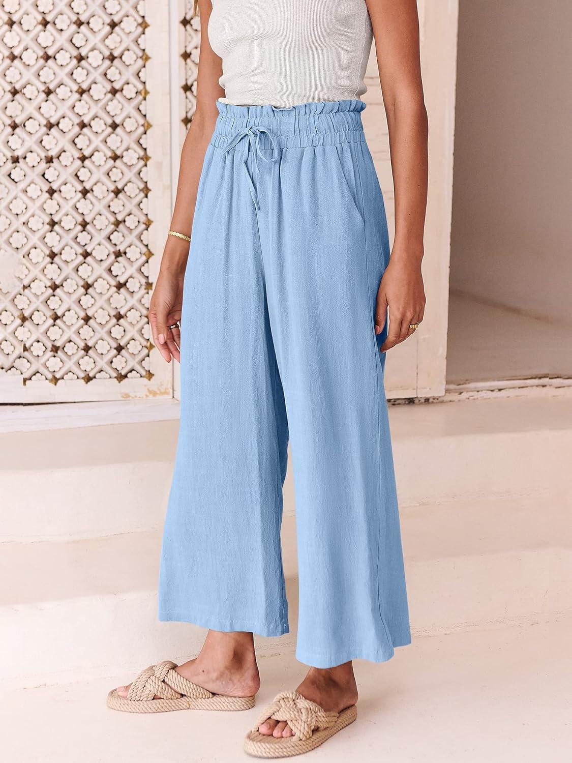 ANRABESS Women Linen Pants Casual Loose High Waist Boho Wide Leg Cropped Palazzo Beach Pants Summer Outfits 2025 Trendy(Sky)