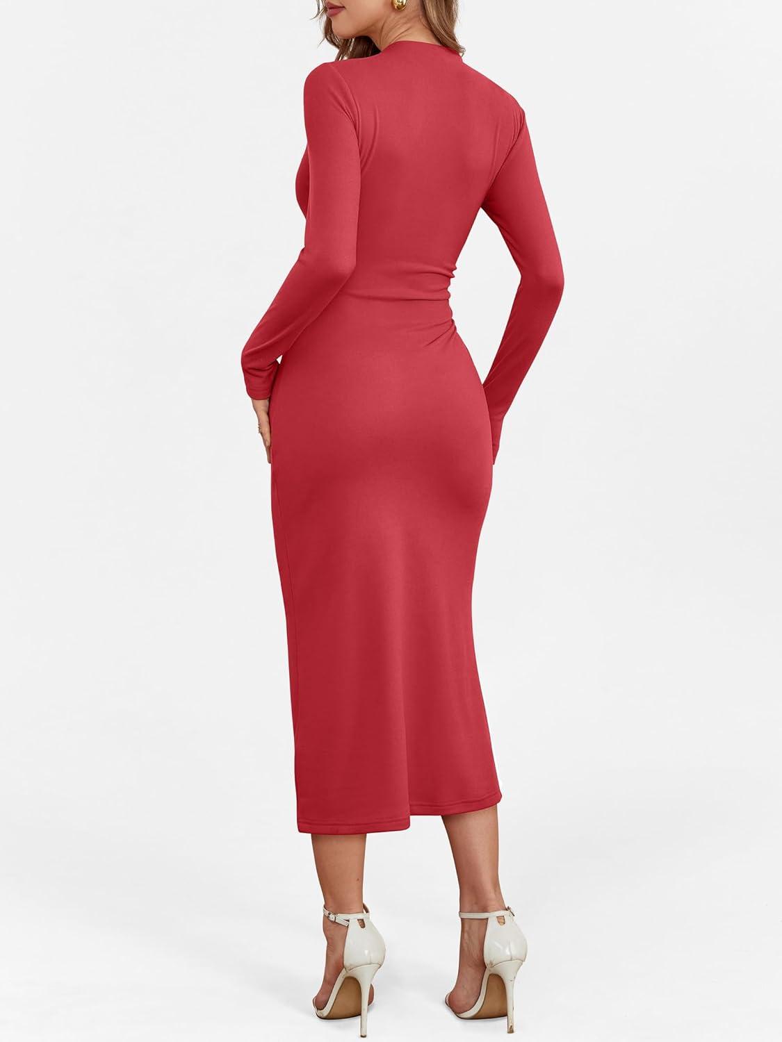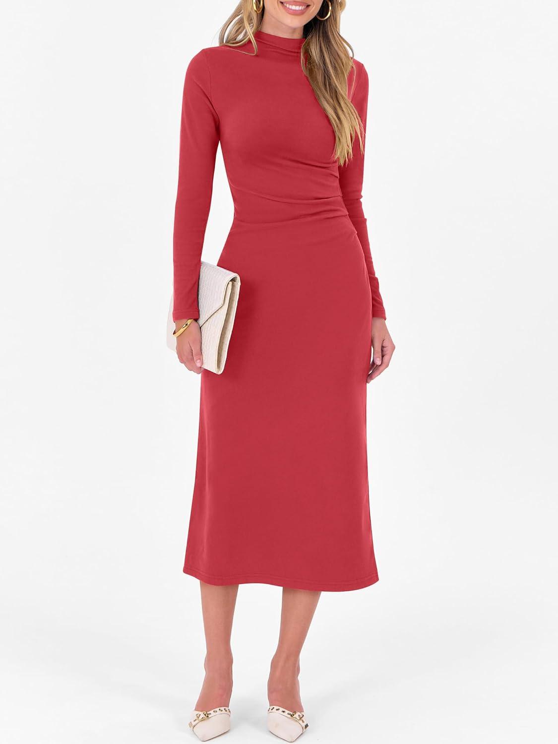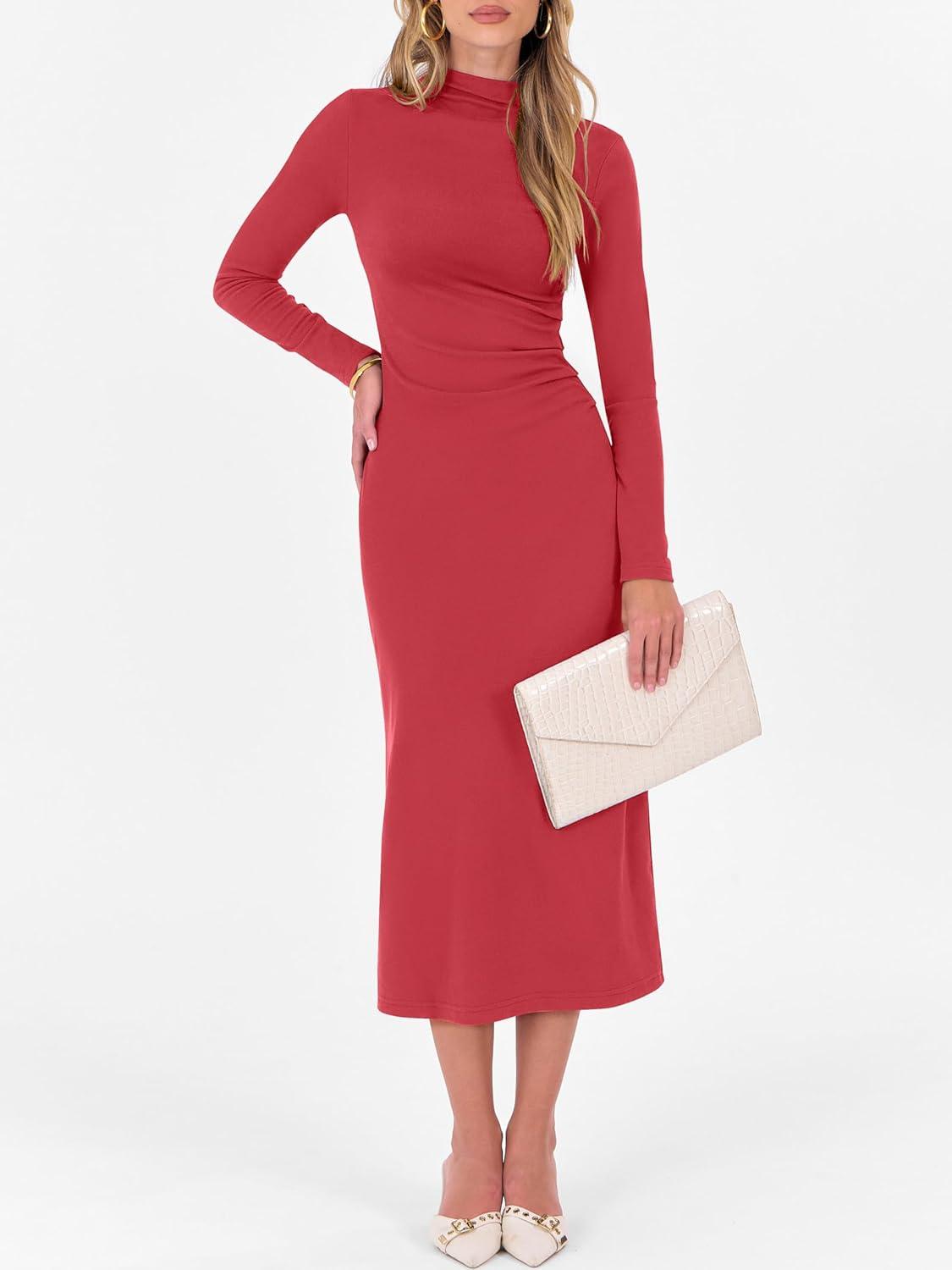ANRABESS Women Long Sleeve Bodycon Dress Fall 2025 Mock Neck Formal Elegant Party Wedding Guest Cocktail Long Maxi Dresses(Red)