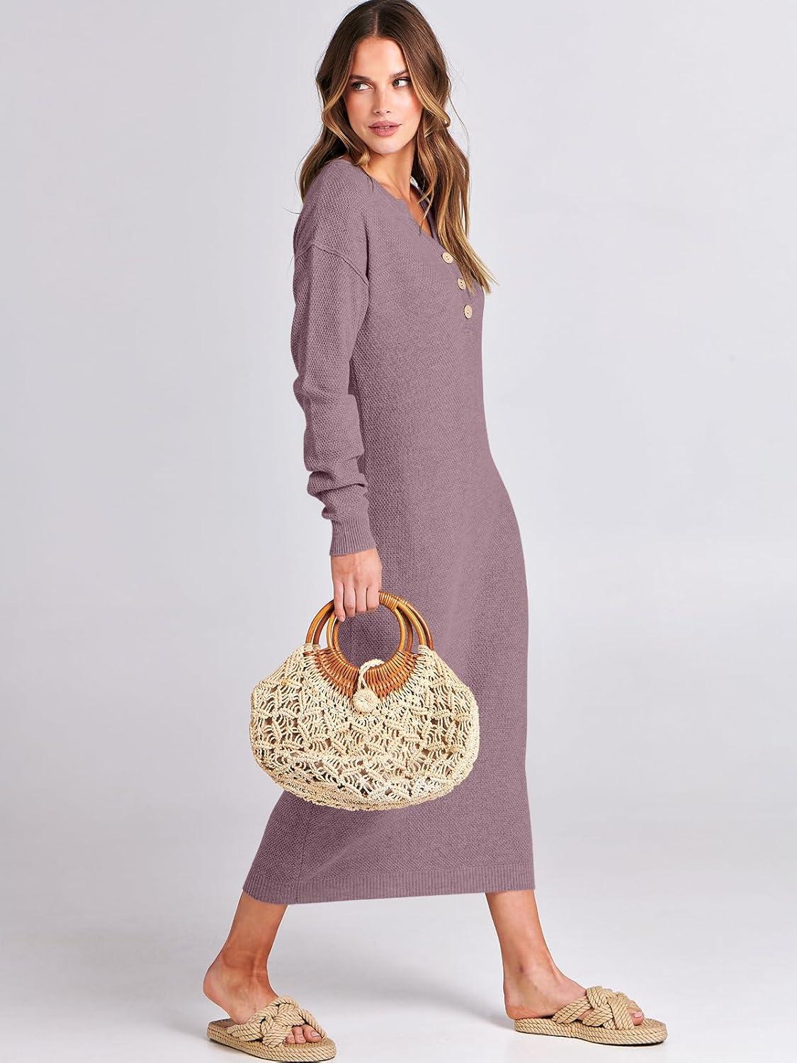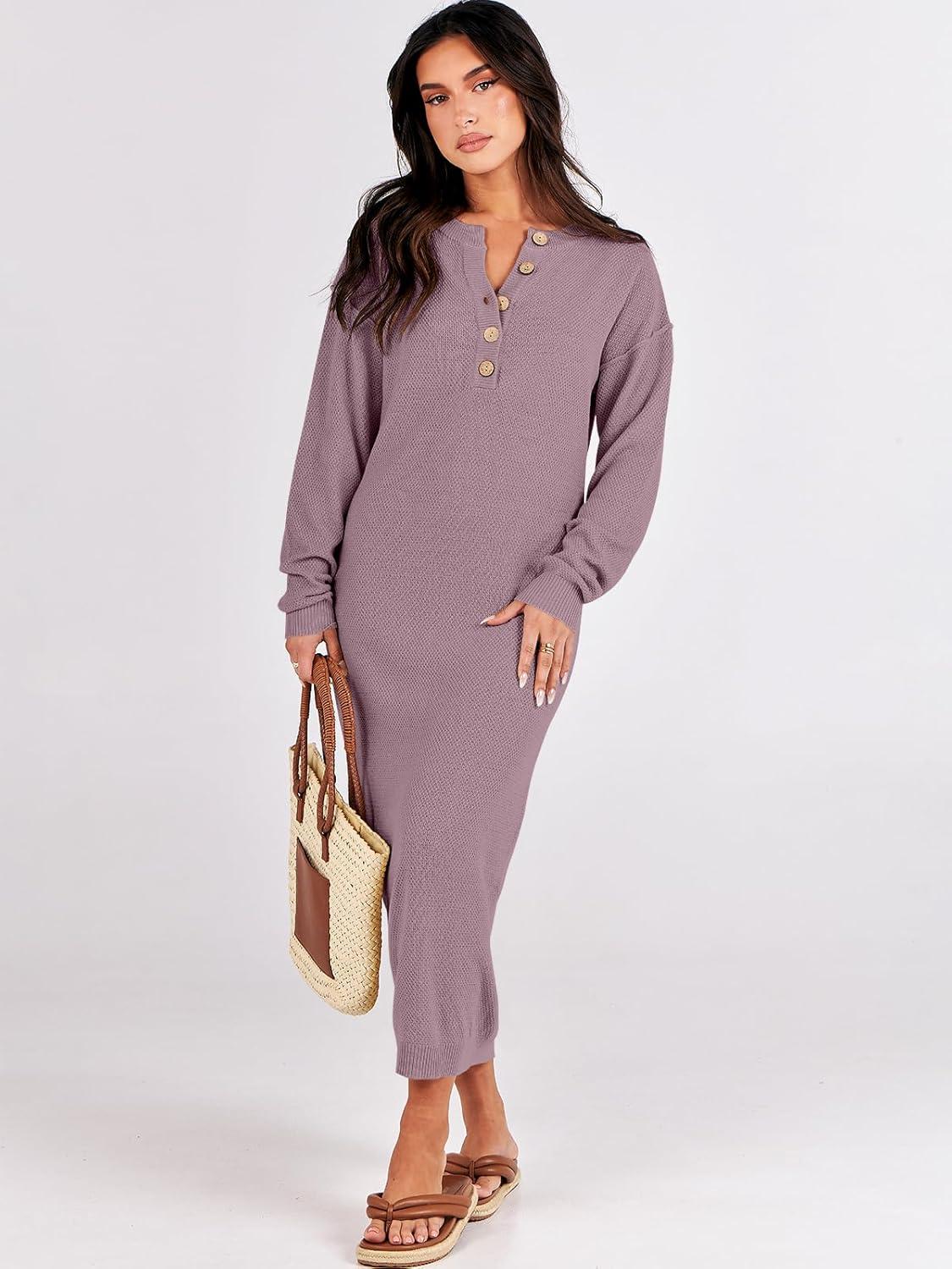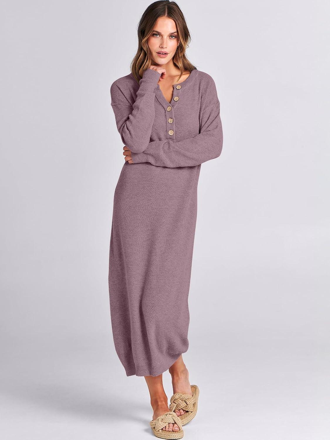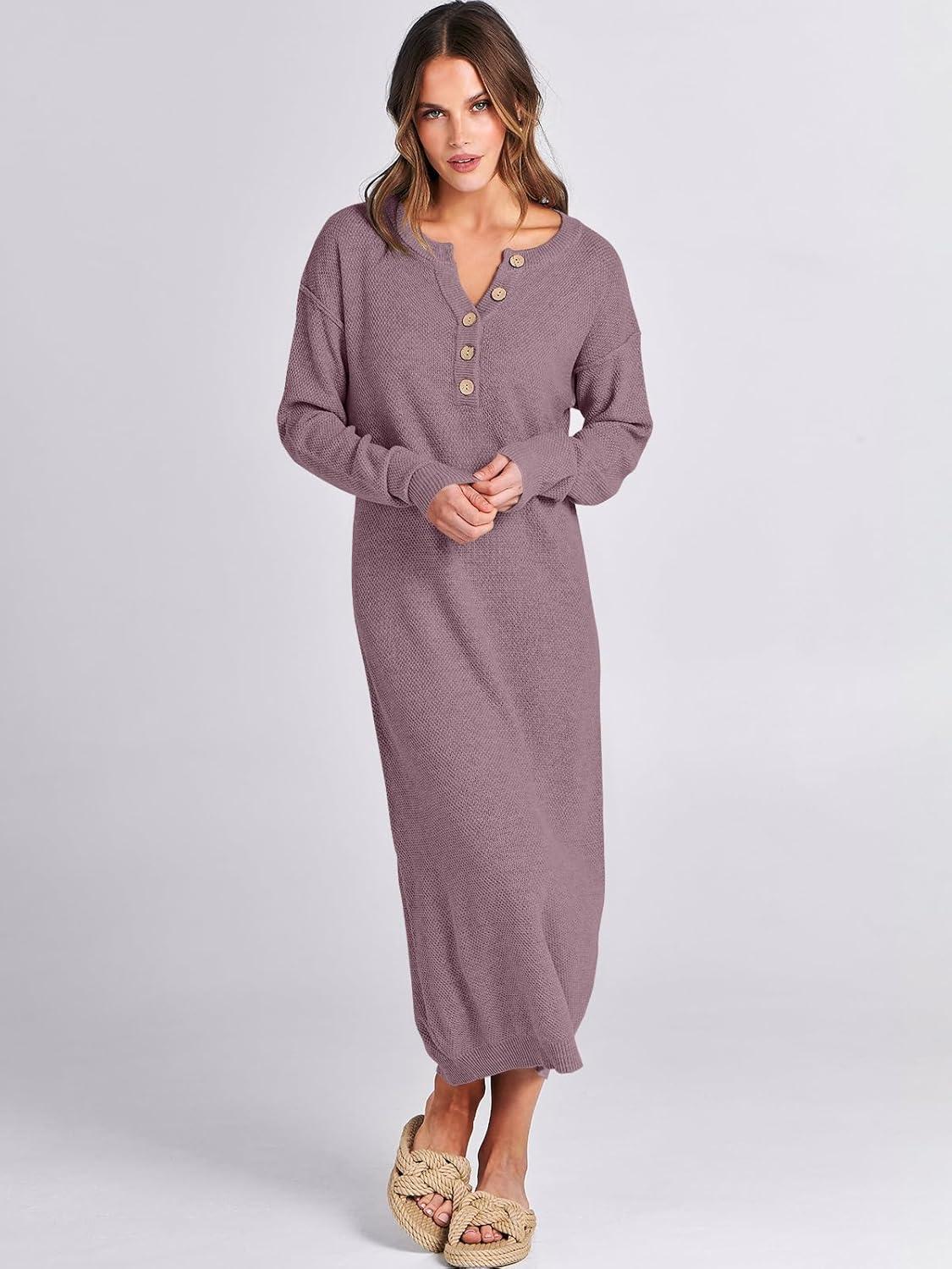 ANRABESS Women Long Sleeve Button V Neck Oversized Casual Loose Fit Waffle Knit Fall Midi Sweater Dress 2025 Trendy Outfits(Red Apricot)