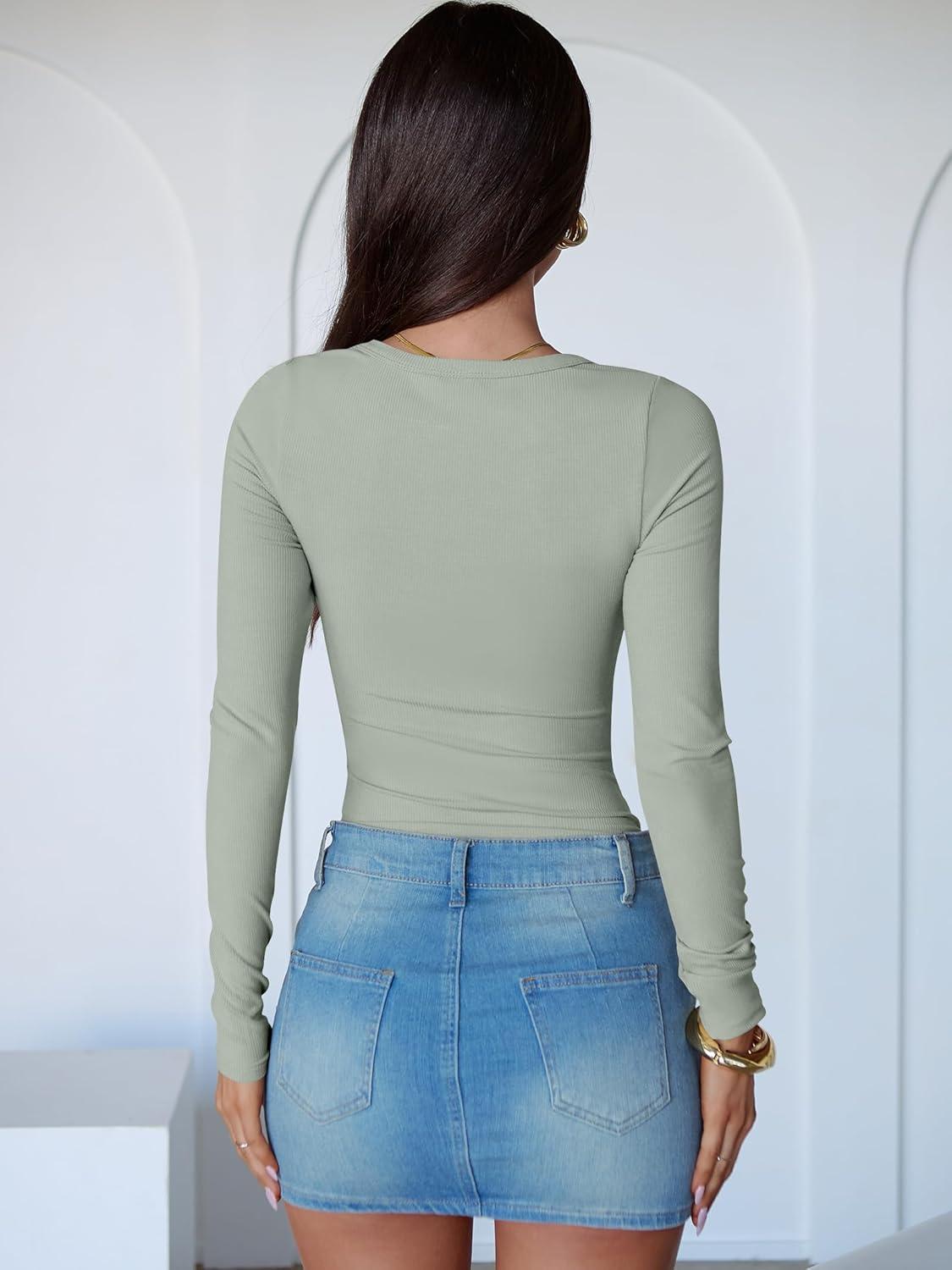 ANRABESS Women Long Sleeve Crew Neck Bodysuits Top 2025 Fall Slim Fit Ribbed Knit Soft Basic Tee Shirts(Light Green)