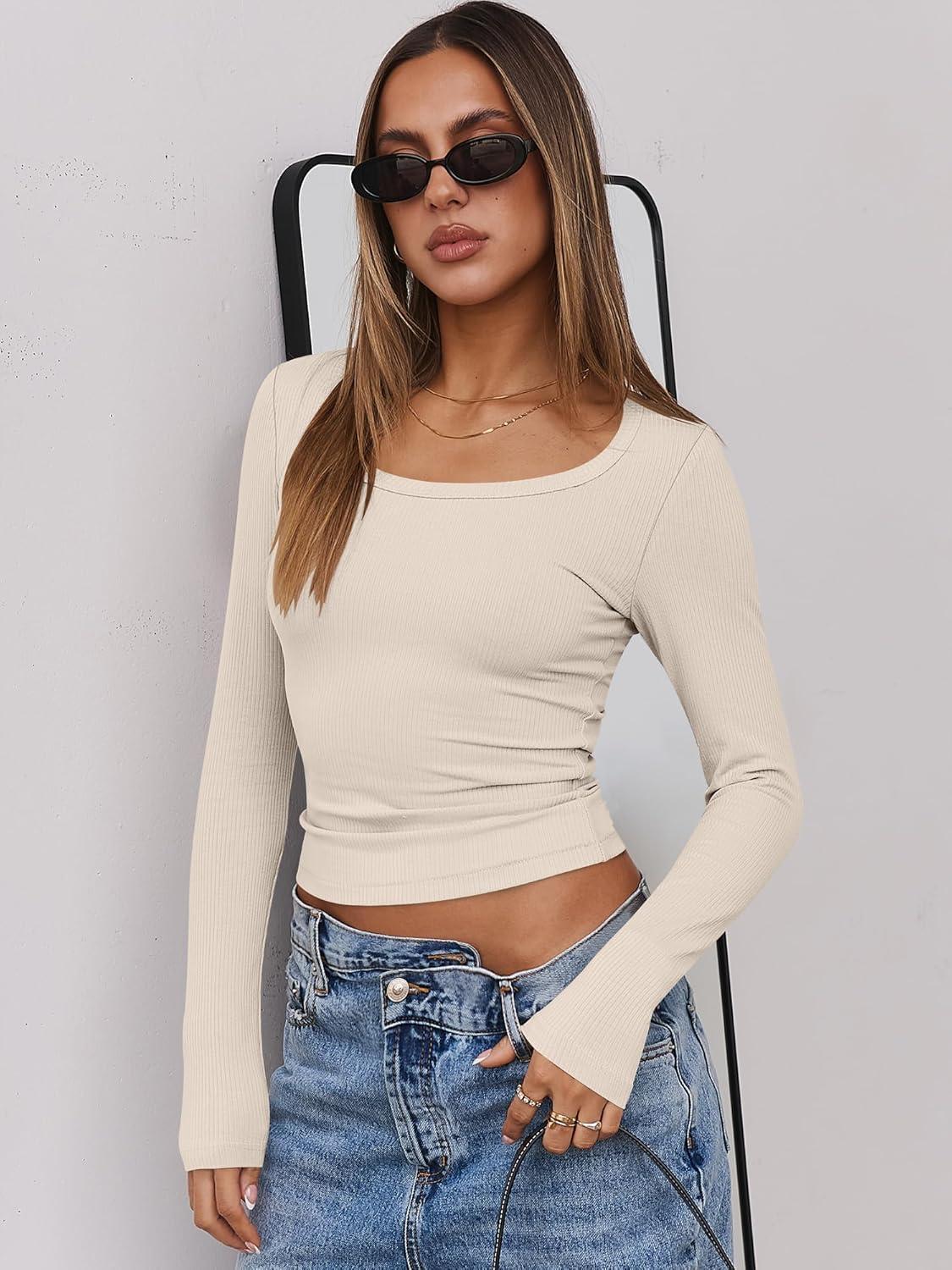 ANRABESS Women Long Sleeve Crop Tops Scoop Neck Ribbed Knit Tight Slim Fit 2025 Fall Going Out Sexy T-Shirts Basic Tee Shirts(Beige)