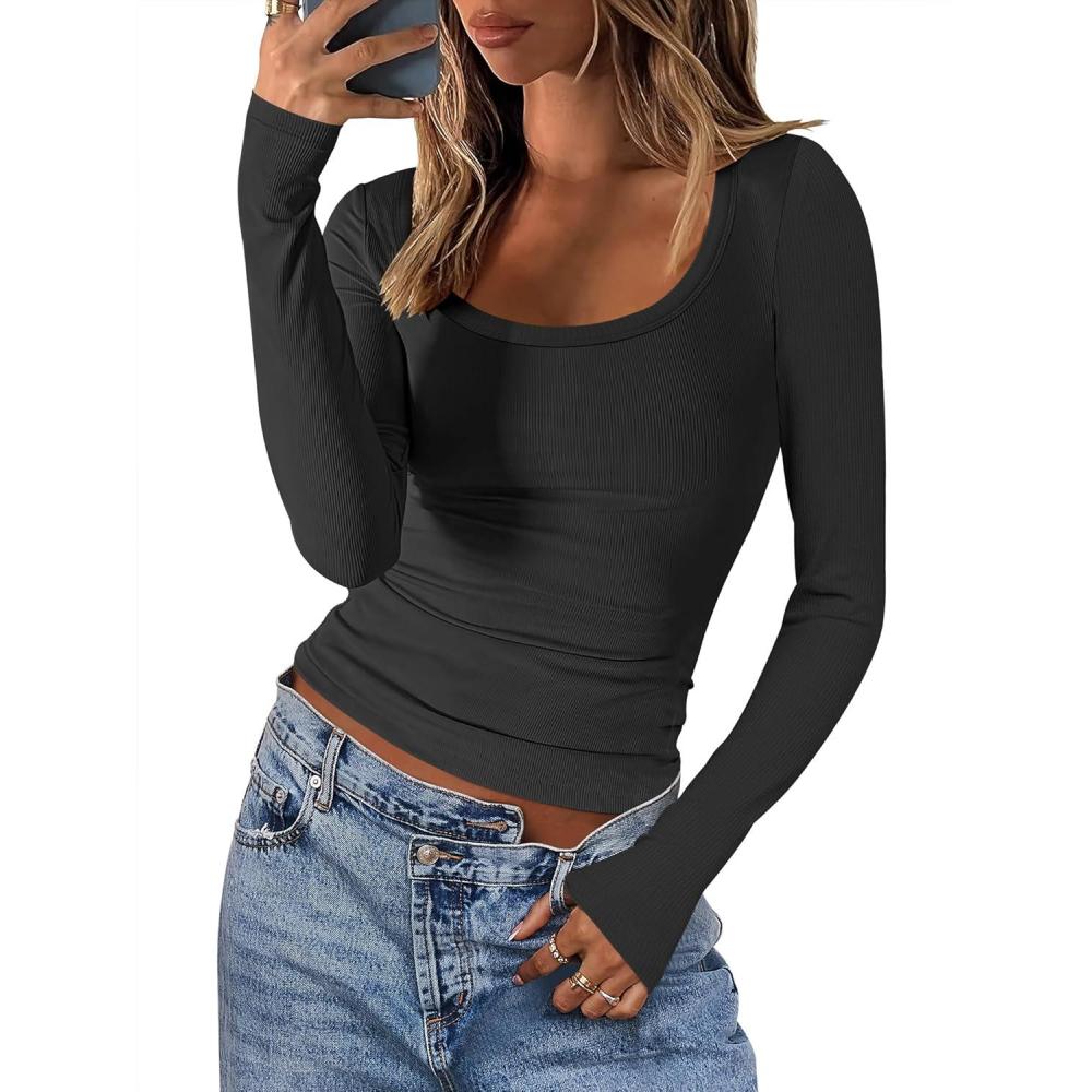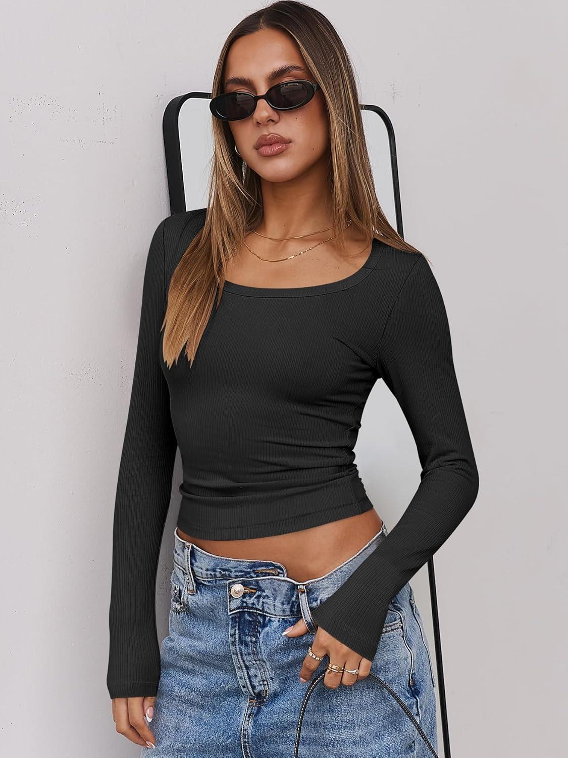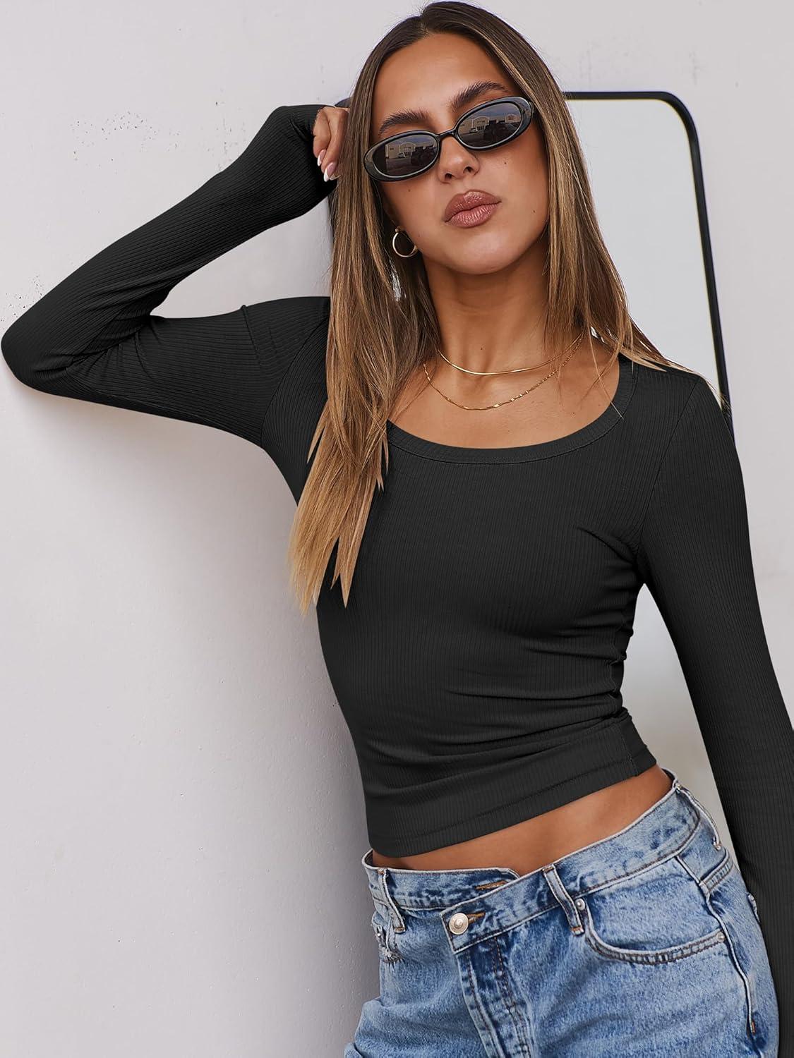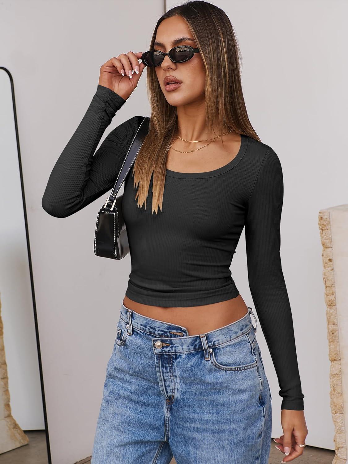 ANRABESS Women Long Sleeve Crop Tops Scoop Neck Ribbed Knit Tight Slim Fit 2025 Fall Going Out Sexy T-Shirts Basic Tee Shirts(Black)