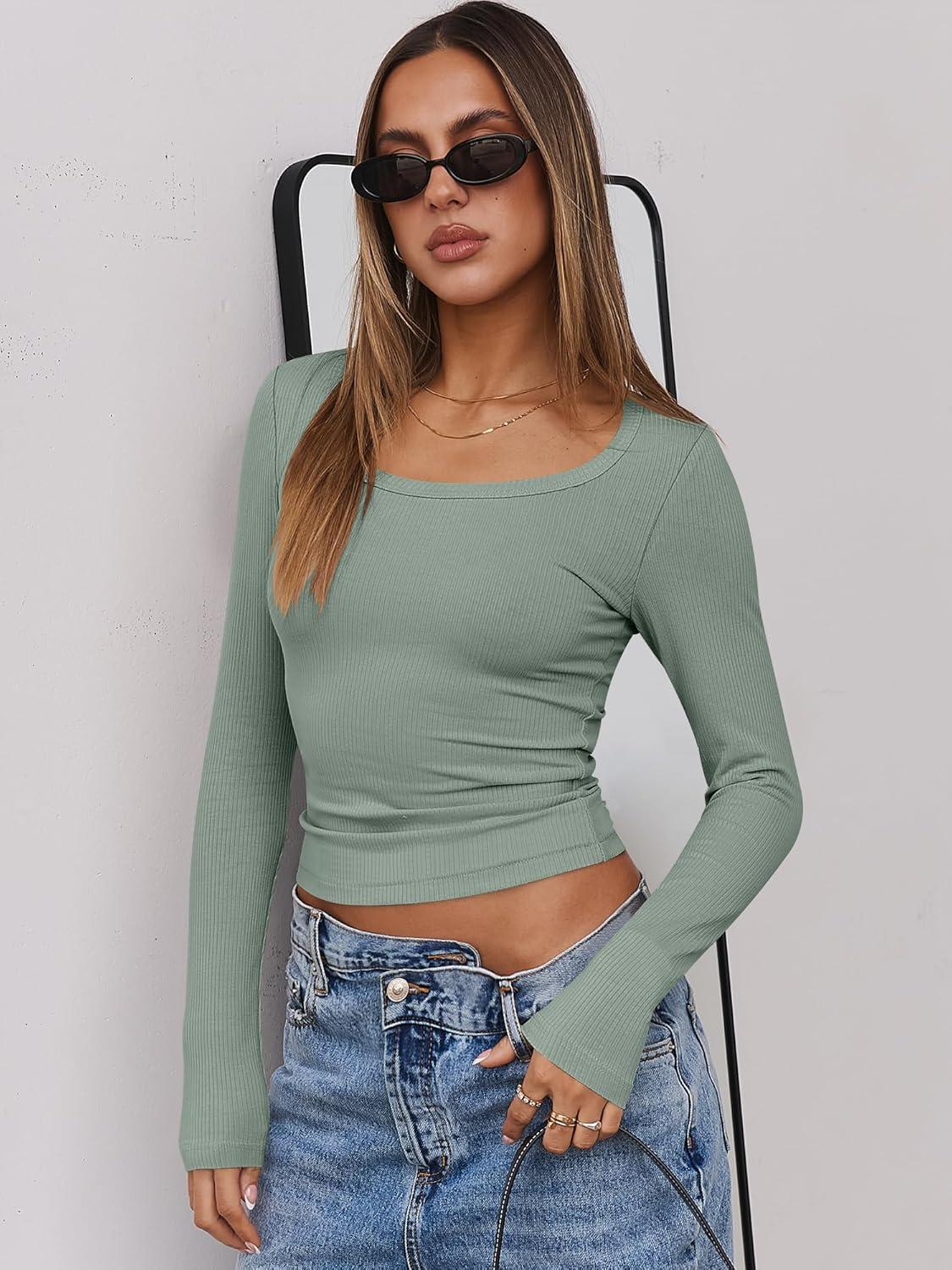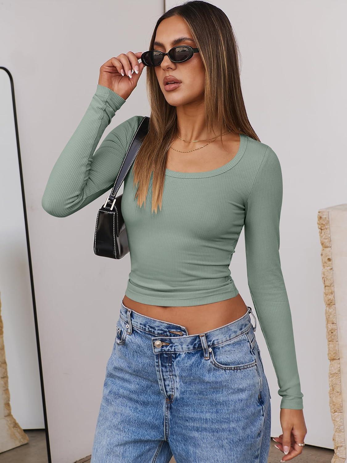 ANRABESS Women Long Sleeve Crop Tops Scoop Neck Ribbed Knit Tight Slim Fit 2025 Fall Going Out Sexy T-Shirts Basic Tee Shirts(Light Green)
