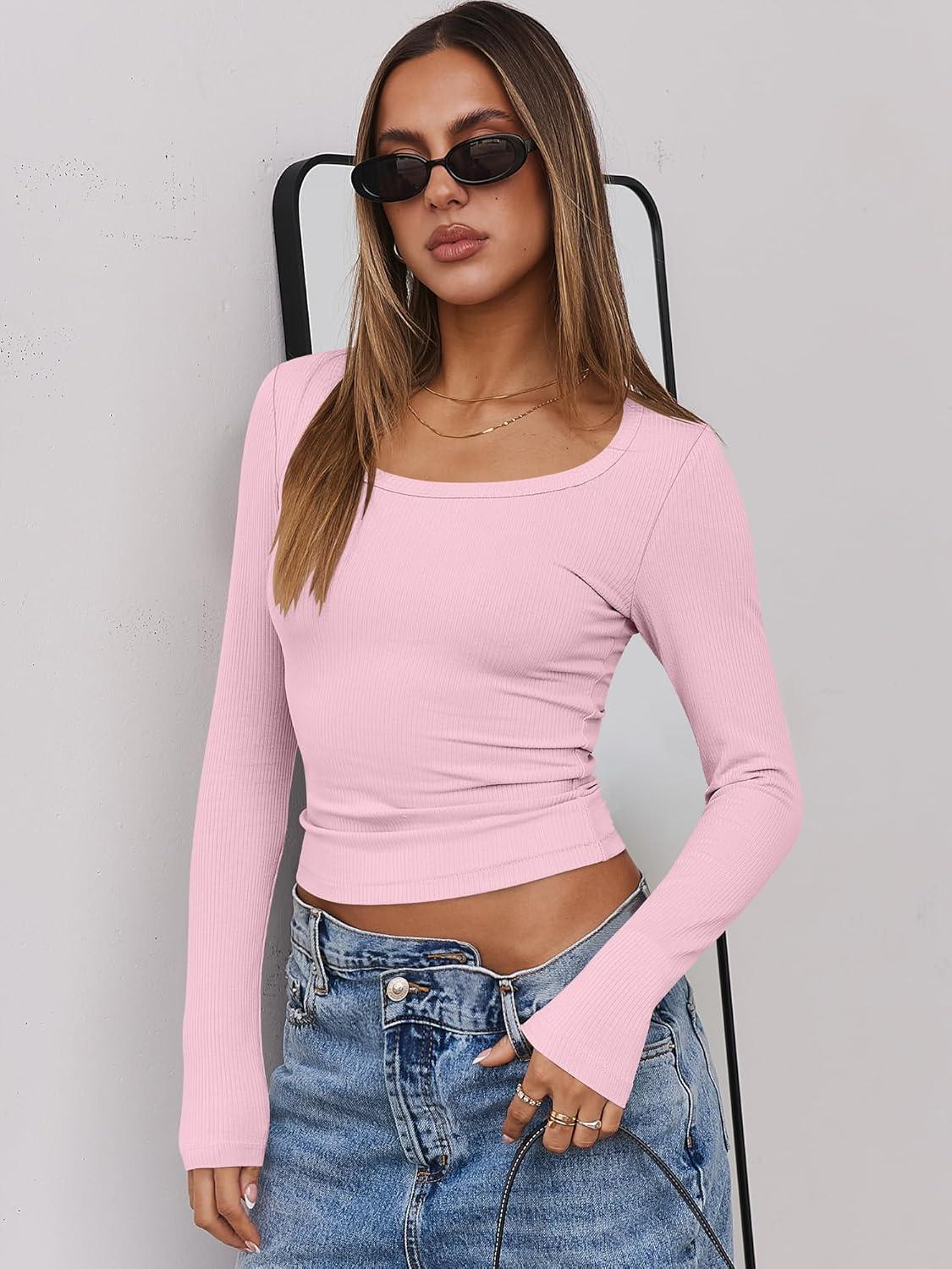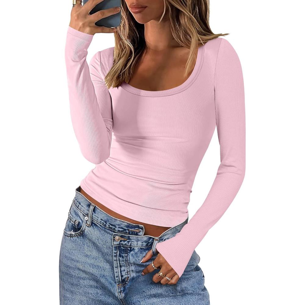 ANRABESS Women Long Sleeve Crop Tops Scoop Neck Ribbed Knit Tight Slim Fit 2025 Fall Going Out Sexy T-Shirts Basic Tee Shirts(Pink)