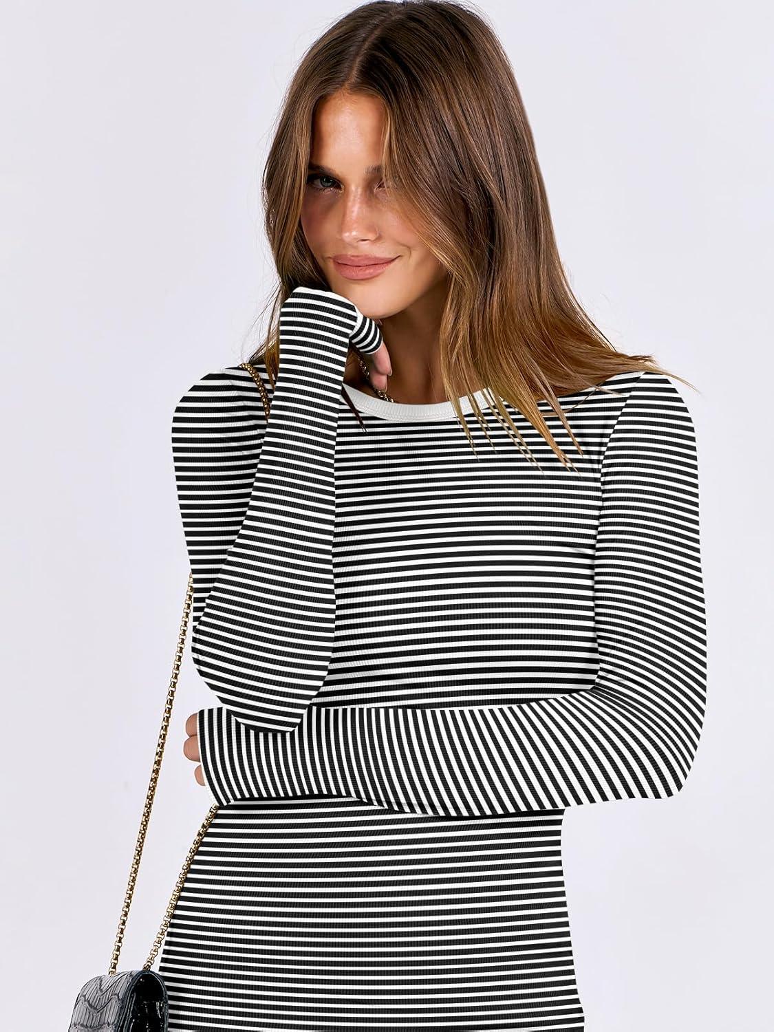 ANRABESS Women Long Sleeve Shirts Rib Knit Slim Fit Tops Basic Tee 2025 Fall Outfits Casual T-Shirt Underscrubs Layer Clothes(Black White)