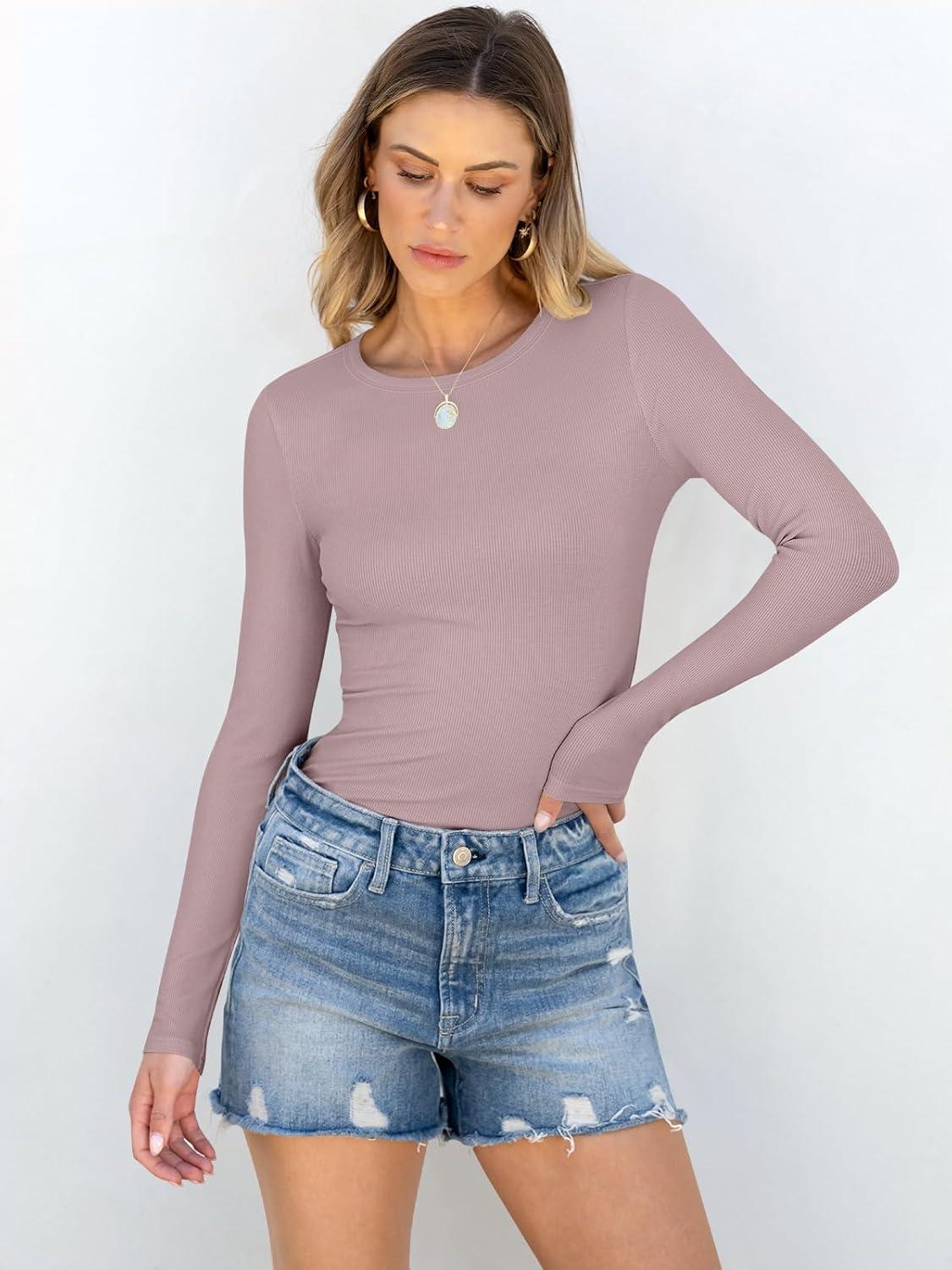 ANRABESS Women Long Sleeve Shirts Rib Knit Slim Fit Tops Basic Tee 2025 Fall Outfits Casual T-Shirt Underscrubs Layer Clothes(Grey Pink)