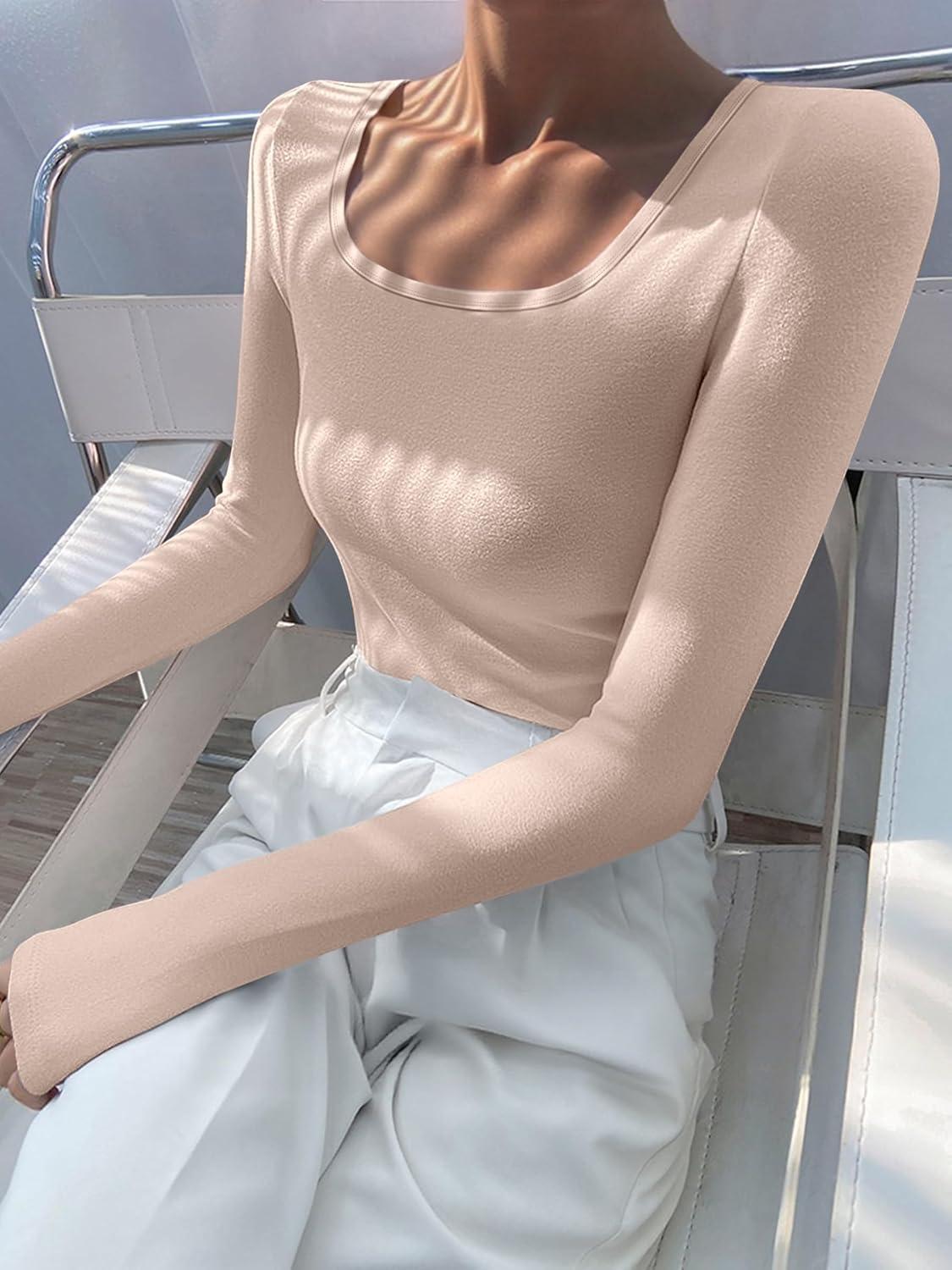 ANRABESS Women Long Sleeve Thermal Top Scoop Neck Slim Fit Fleece Shirts Basic Tee Casual 2025 Fall Winter Warm Undershirts(Grey Camel)