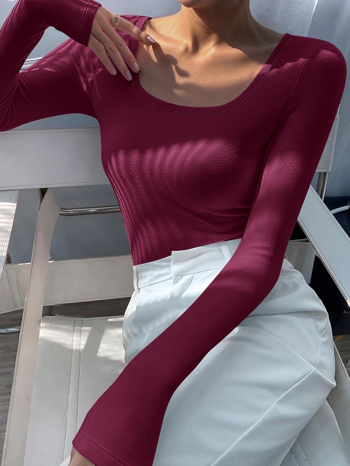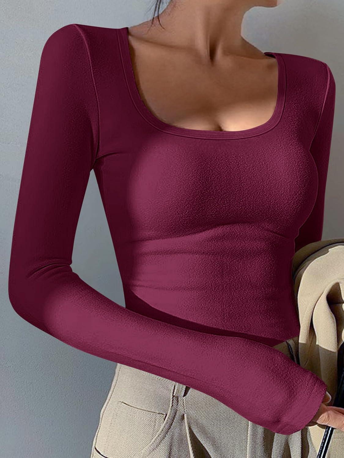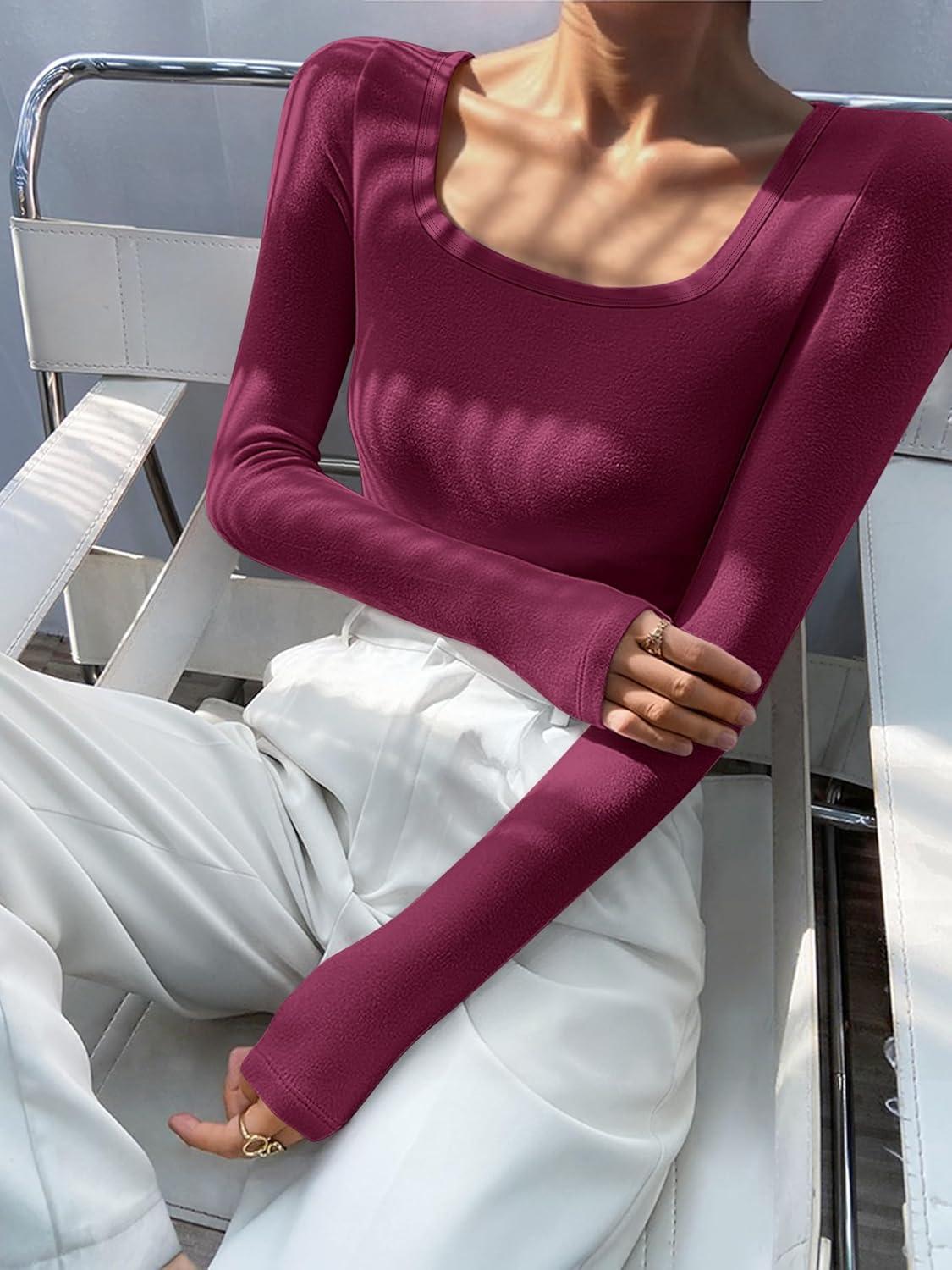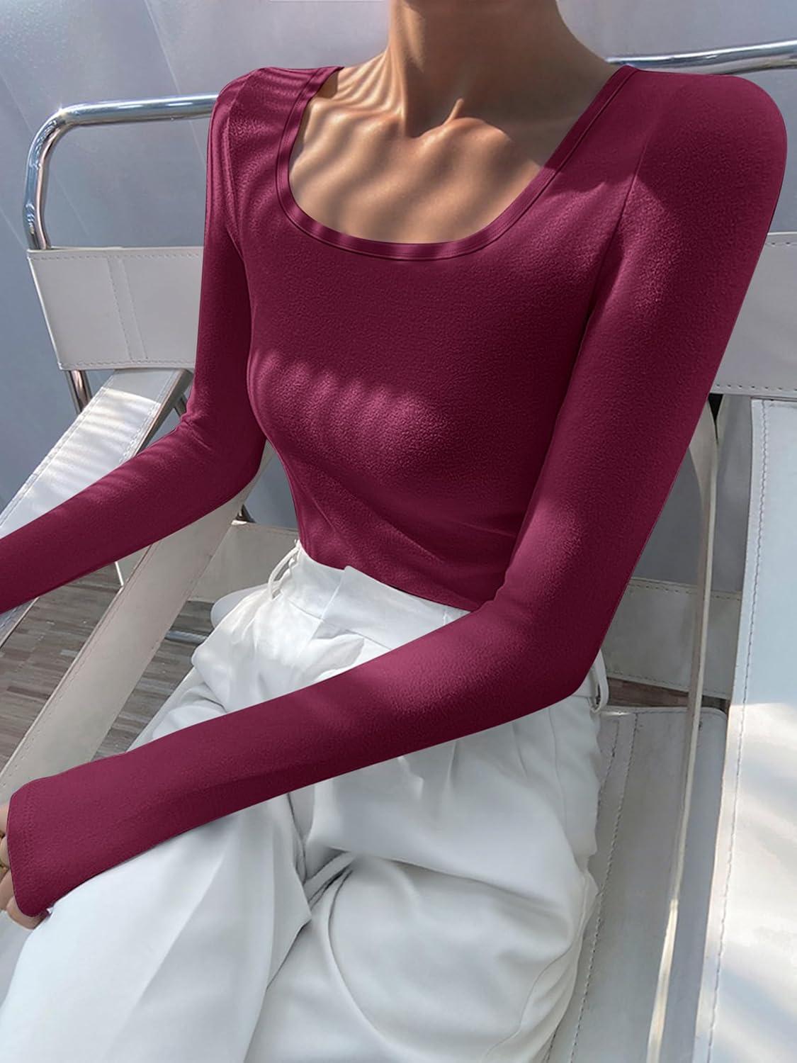 ANRABESS Women Long Sleeve Thermal Top Scoop Neck Slim Fit Fleece Shirts Basic Tee Casual 2025 Fall Winter Warm Undershirts(Wine Red)