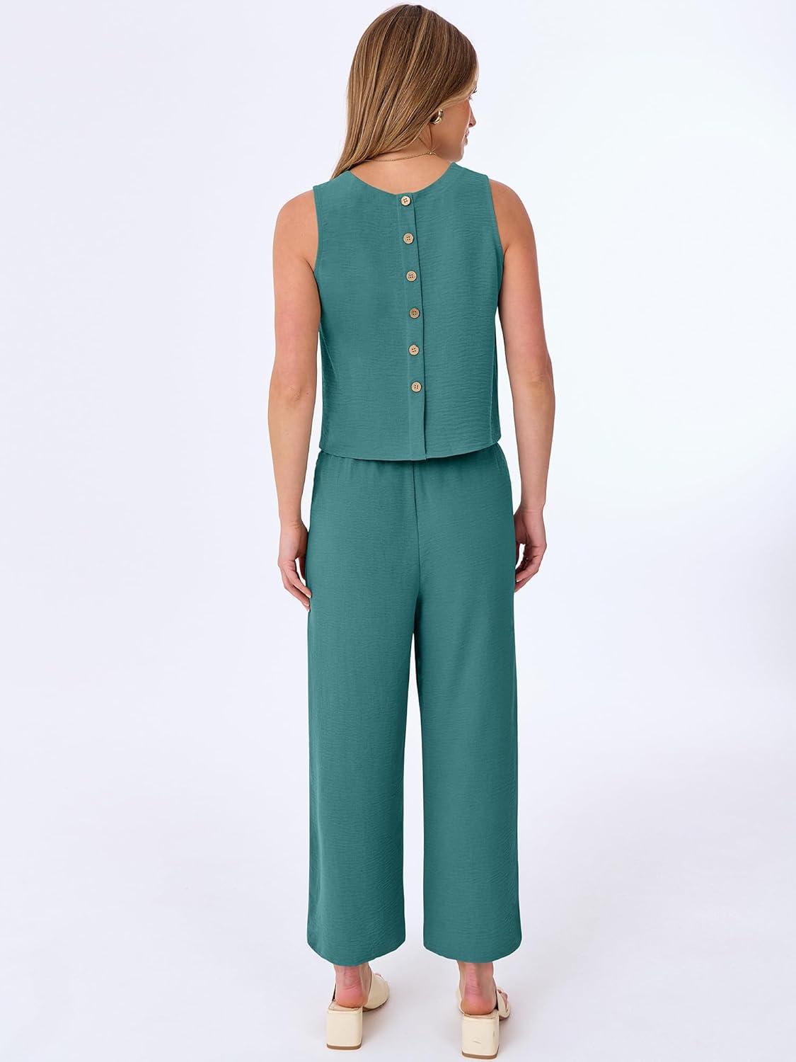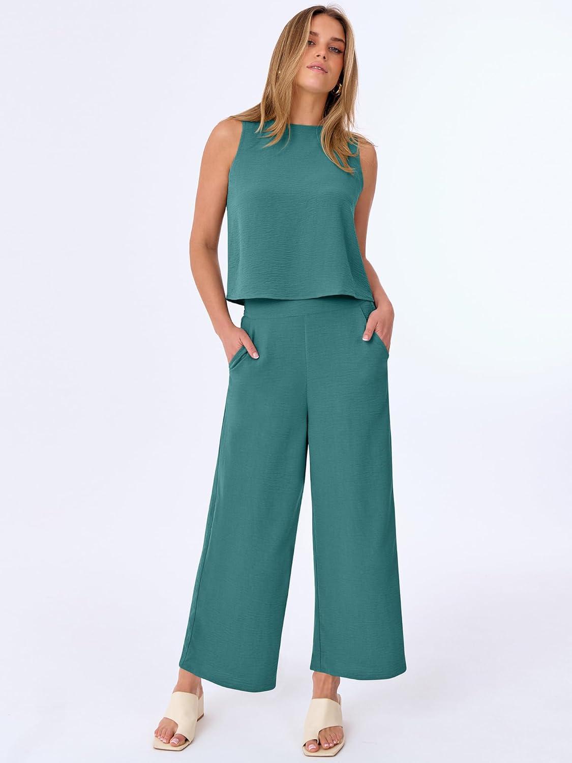 ANRABESS Women Lounge Sets 2 Piece Outfits Summer Sleeveless Crop Tops Capri Wide Leg Pants Vacation Beach Travel Sets(Lake)
