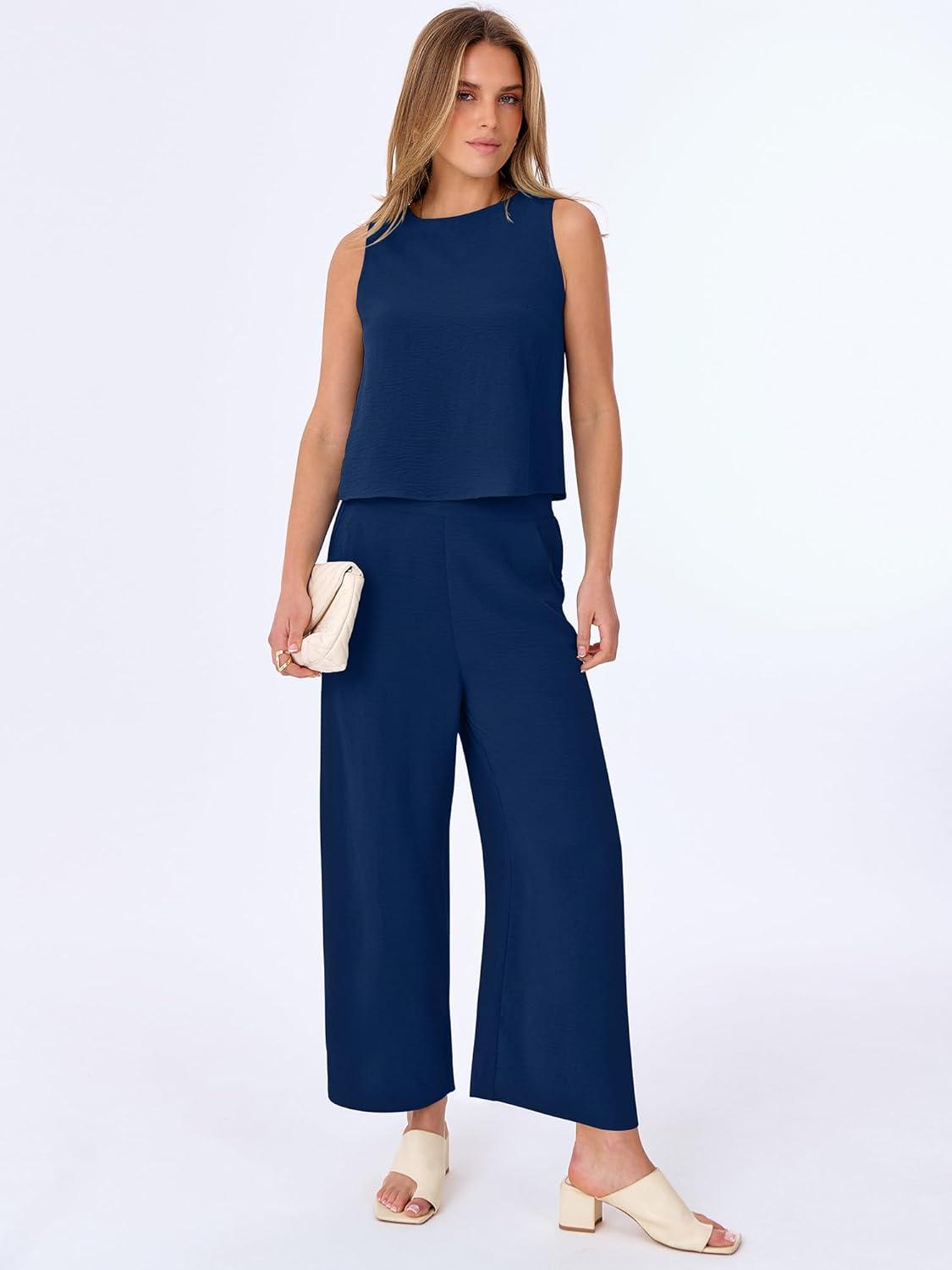 ANRABESS Women Lounge Sets 2 Piece Outfits Summer Sleeveless Crop Tops Capri Wide Leg Pants Vacation Beach Travel Sets(Navy Blue)