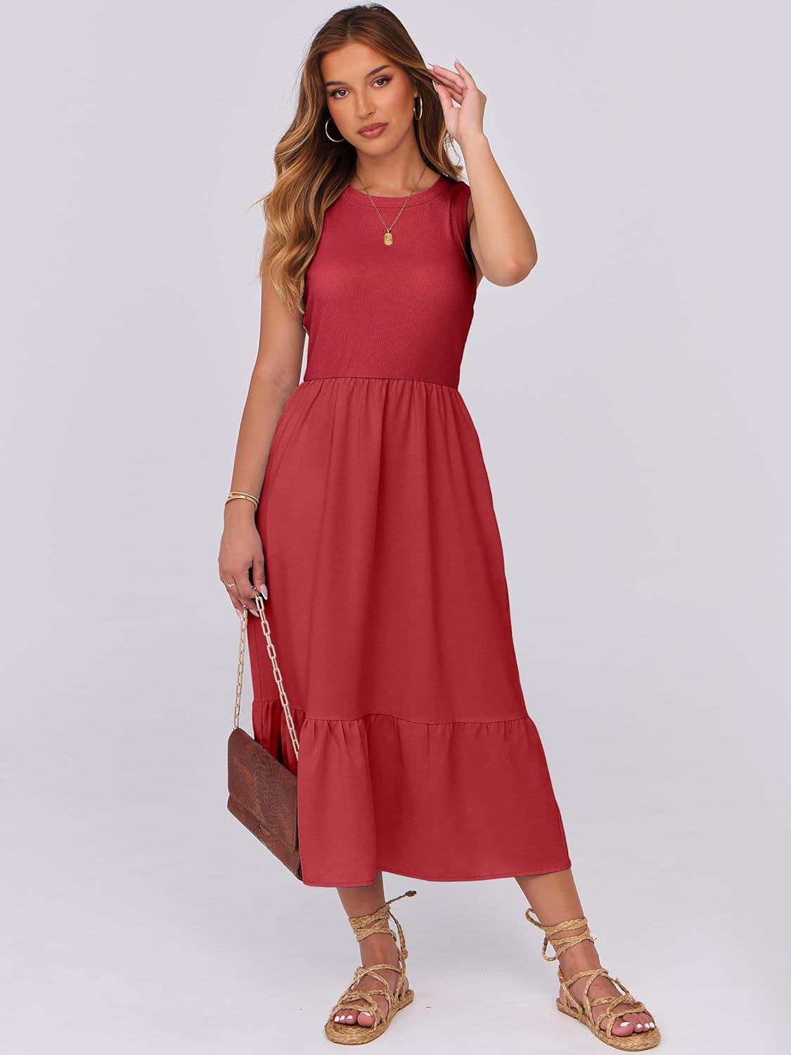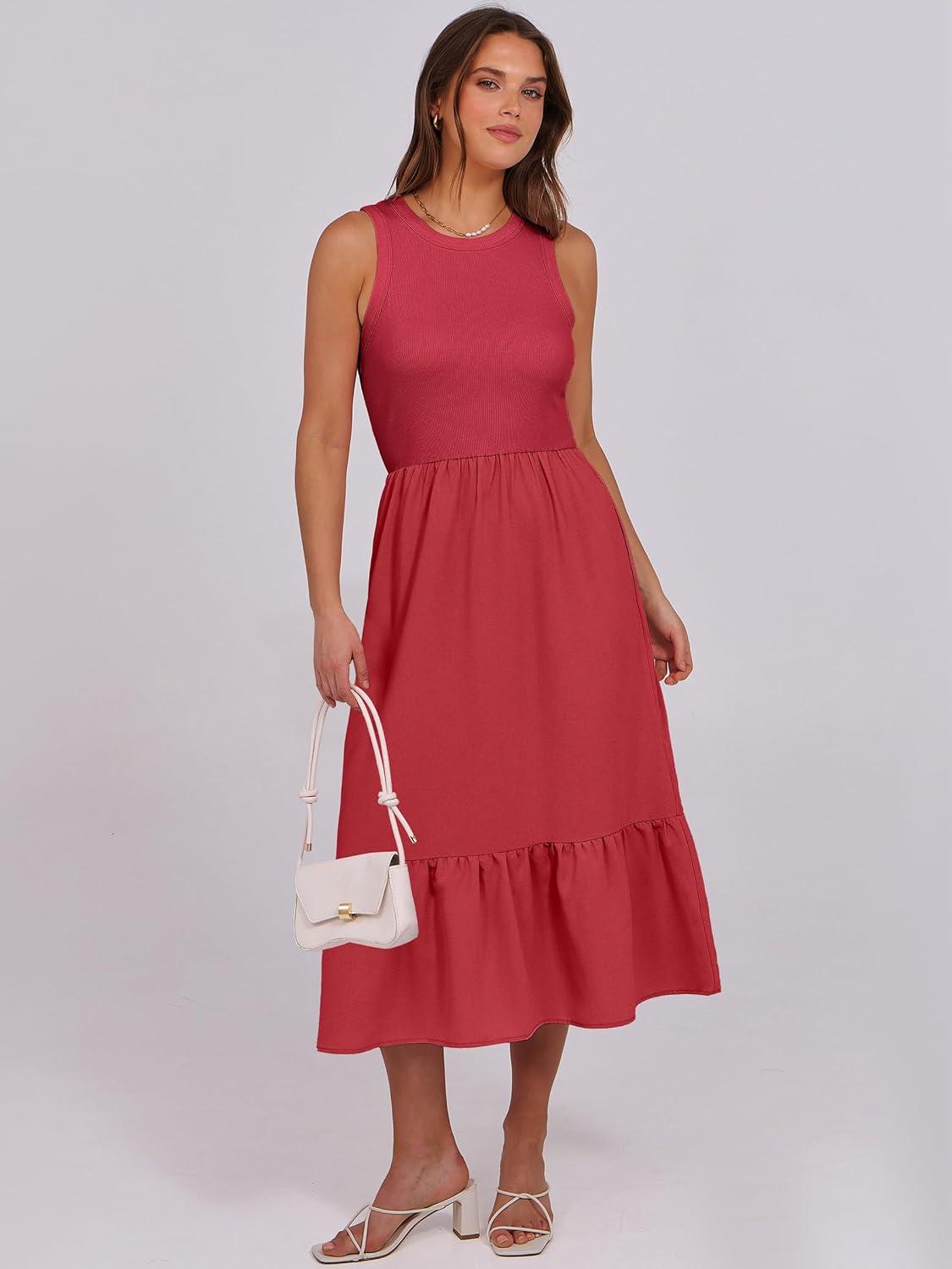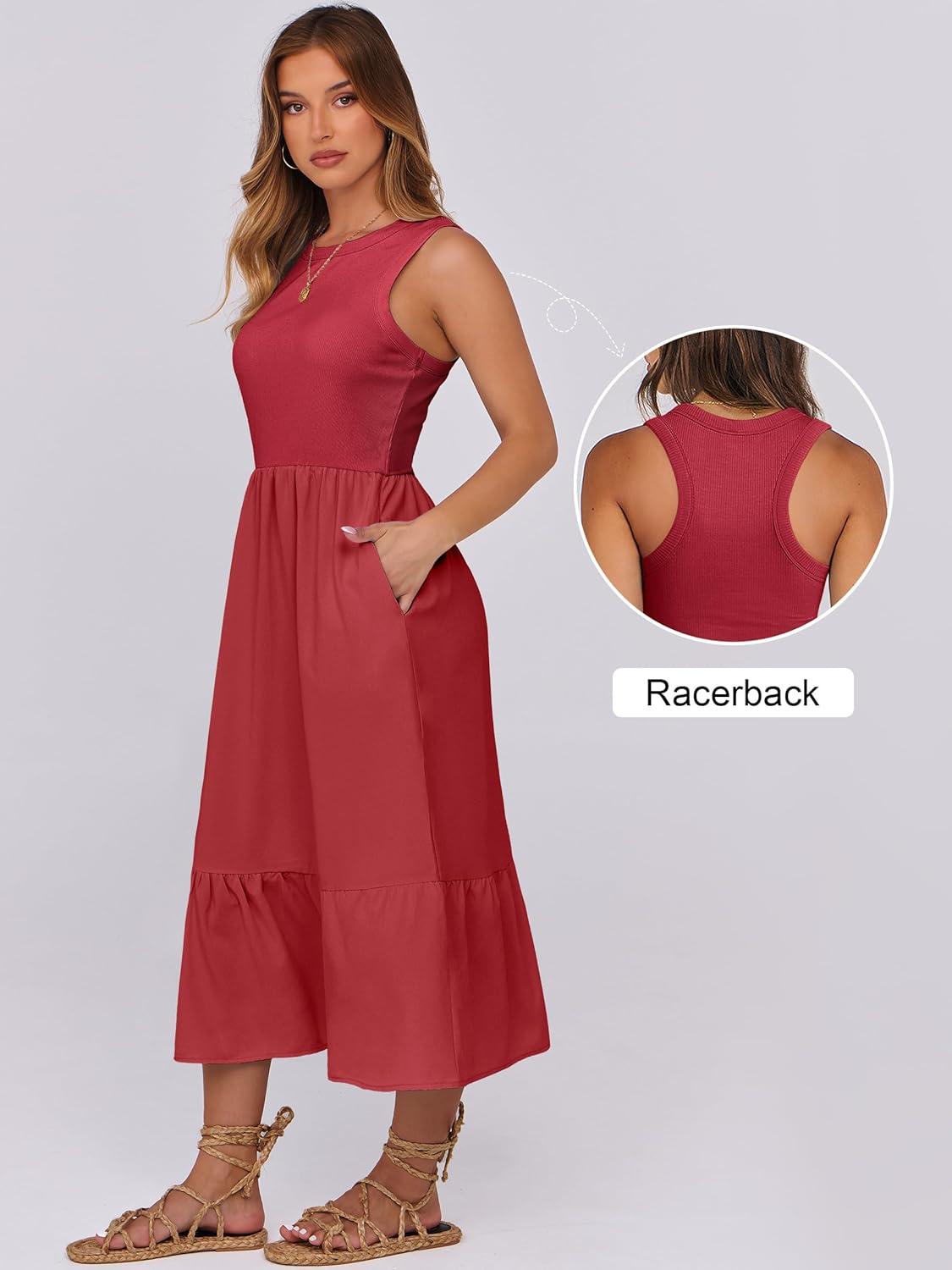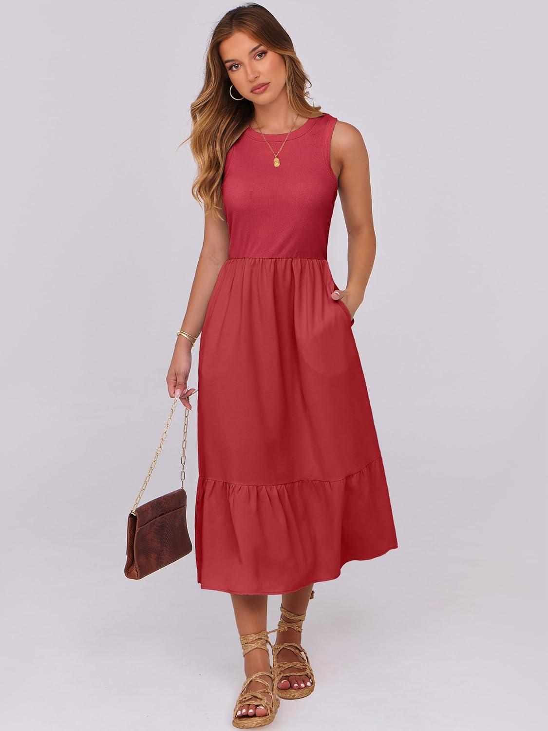 ANRABESS Women Midi Dresses 2025 Summer Casual Sleeveless Sundress High Neck Tank Top Racerback Flowy Beach Dress & Pockets(Red)