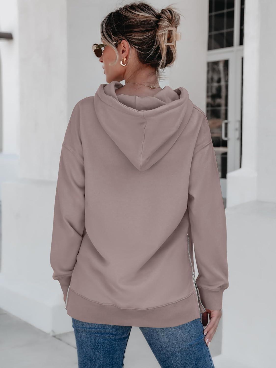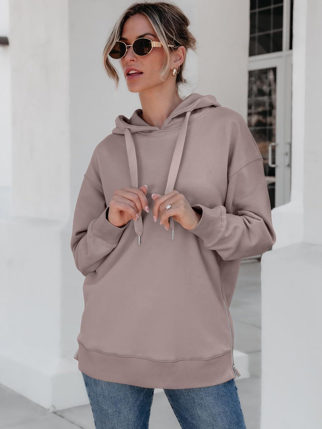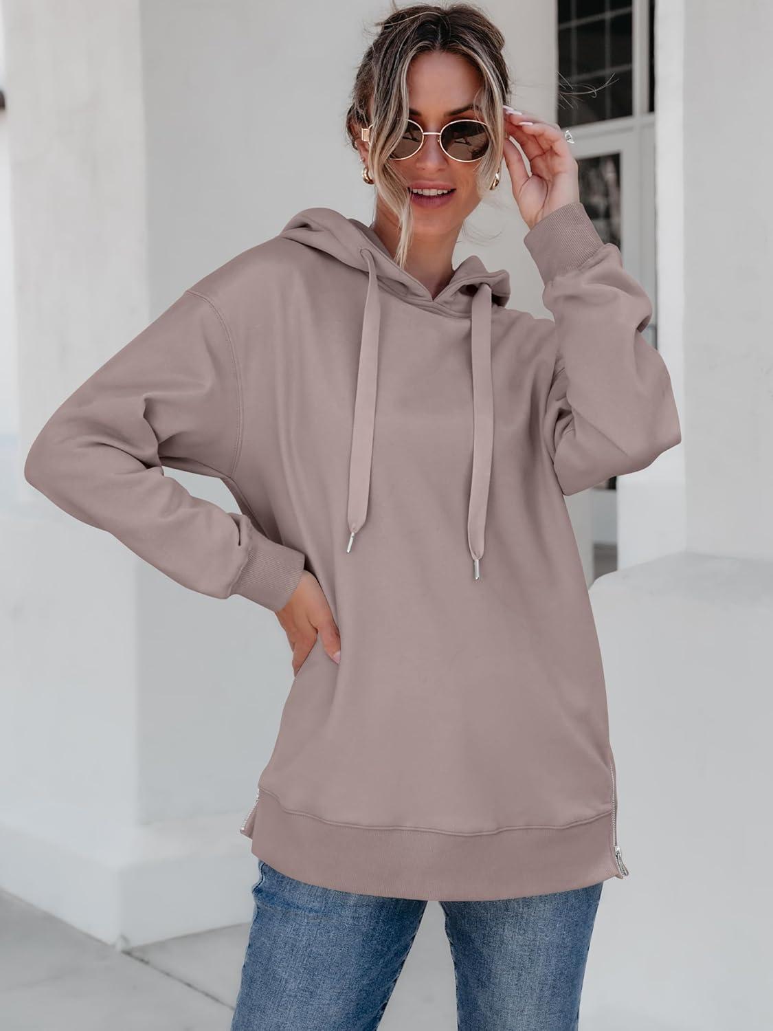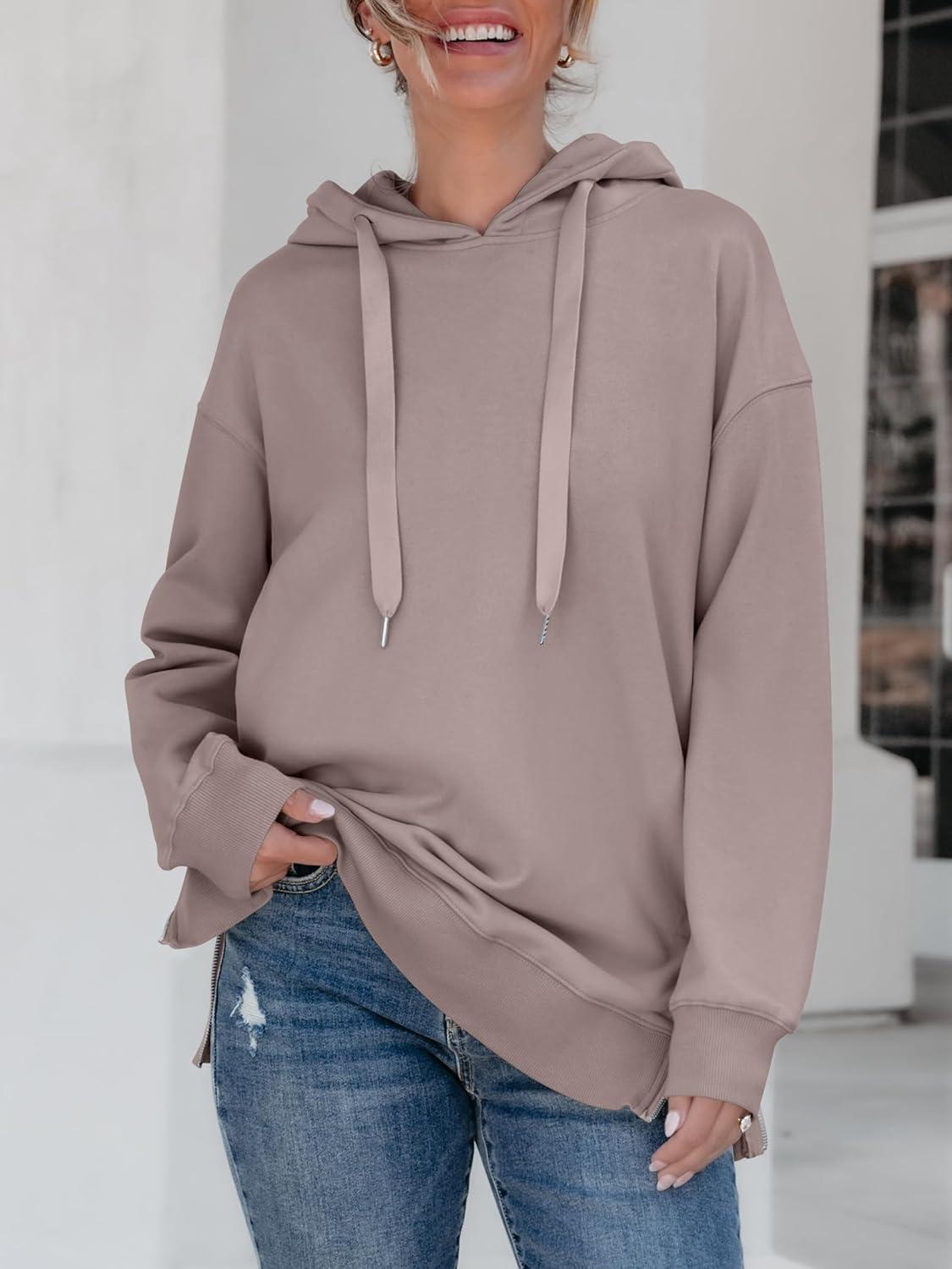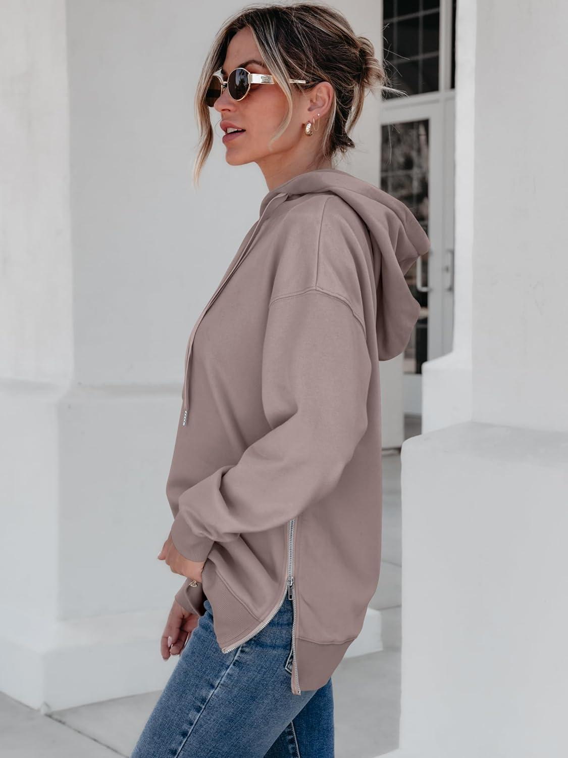 ANRABESS Women Oversized Hoodies Side Zipper Fleece Long Sweatshirts Lightweight Tunic Pullover 2025 Fall Trendy Clothes(Khaki)