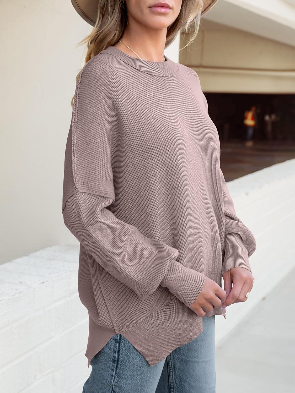 ANRABESS Women Oversized Sweaters Batwing Long Sleeve 2025 Fall Outfits Crewneck Casual Knit Side Slit Fashion Pullover Top(Pink Apricot)