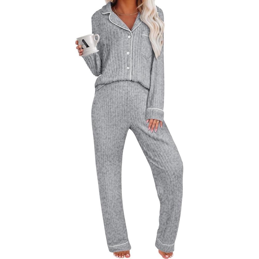 ANRABESS Women Pajama Lounge Sets 2025 Fall 2 Piece Outfits Ribbed Long Sleeve Matching PJ Set Sleepwear Loungewear(Grey)