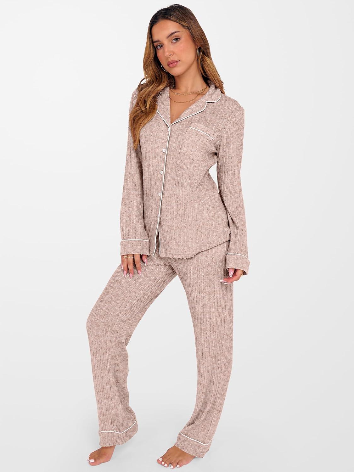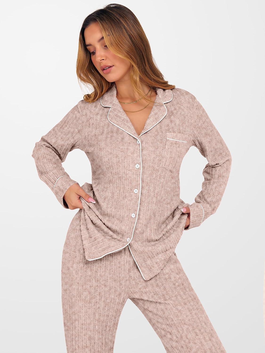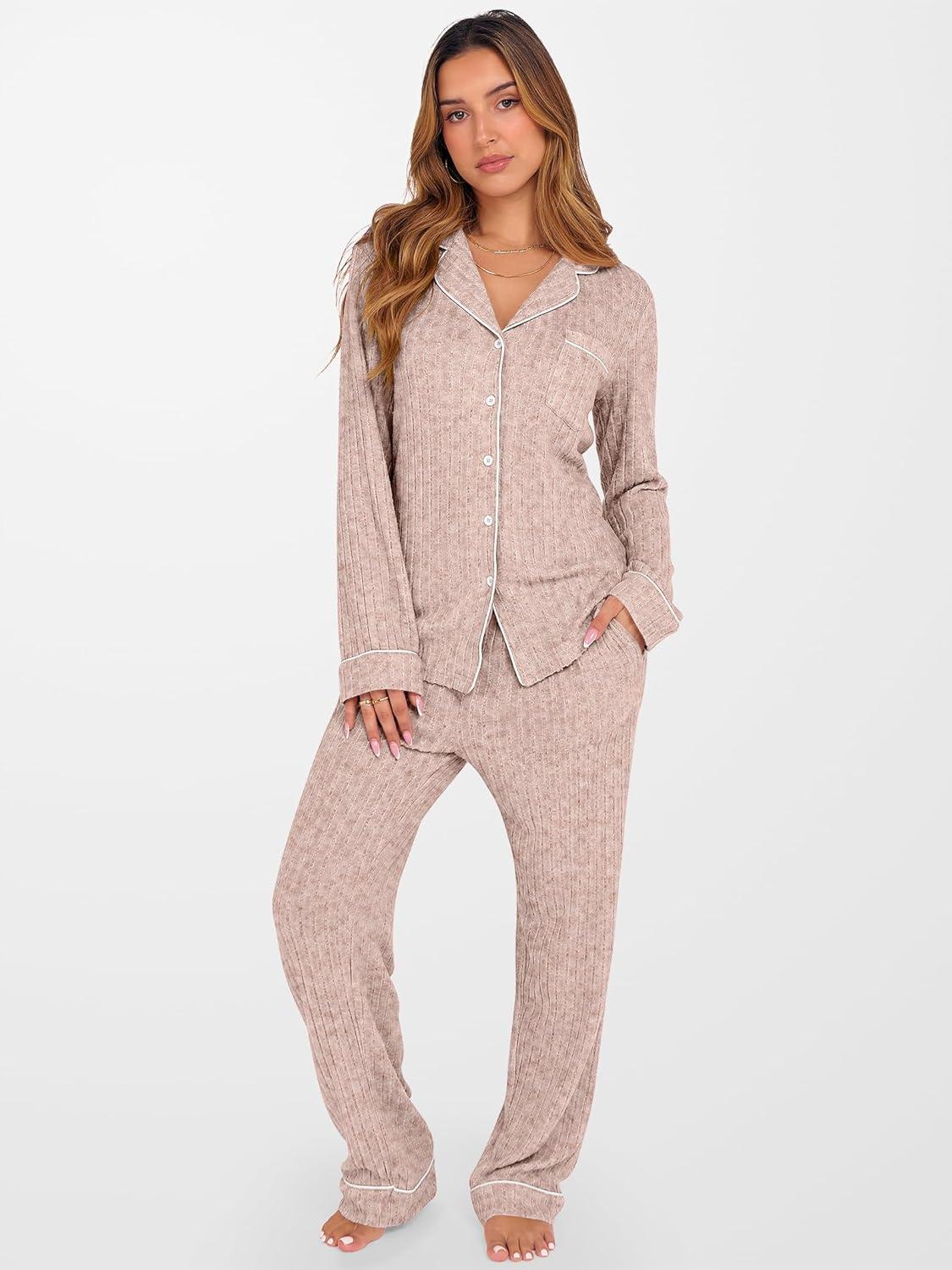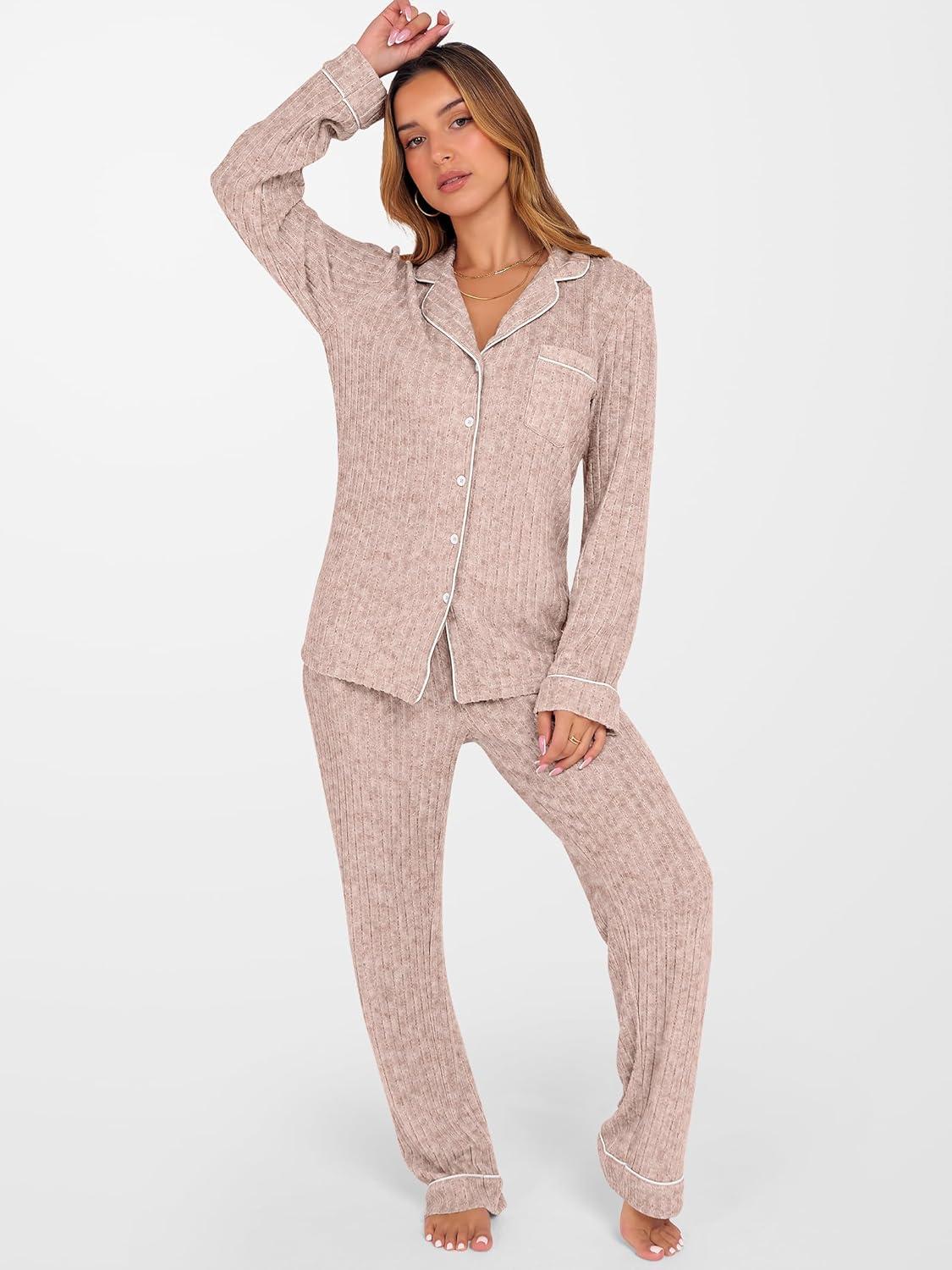 ANRABESS Womens Pajama Sets Long Sleeve Ribbed Knit Top Pant Matching Set 2025 Winter Button Down Sleepwear Lounge Nightwear