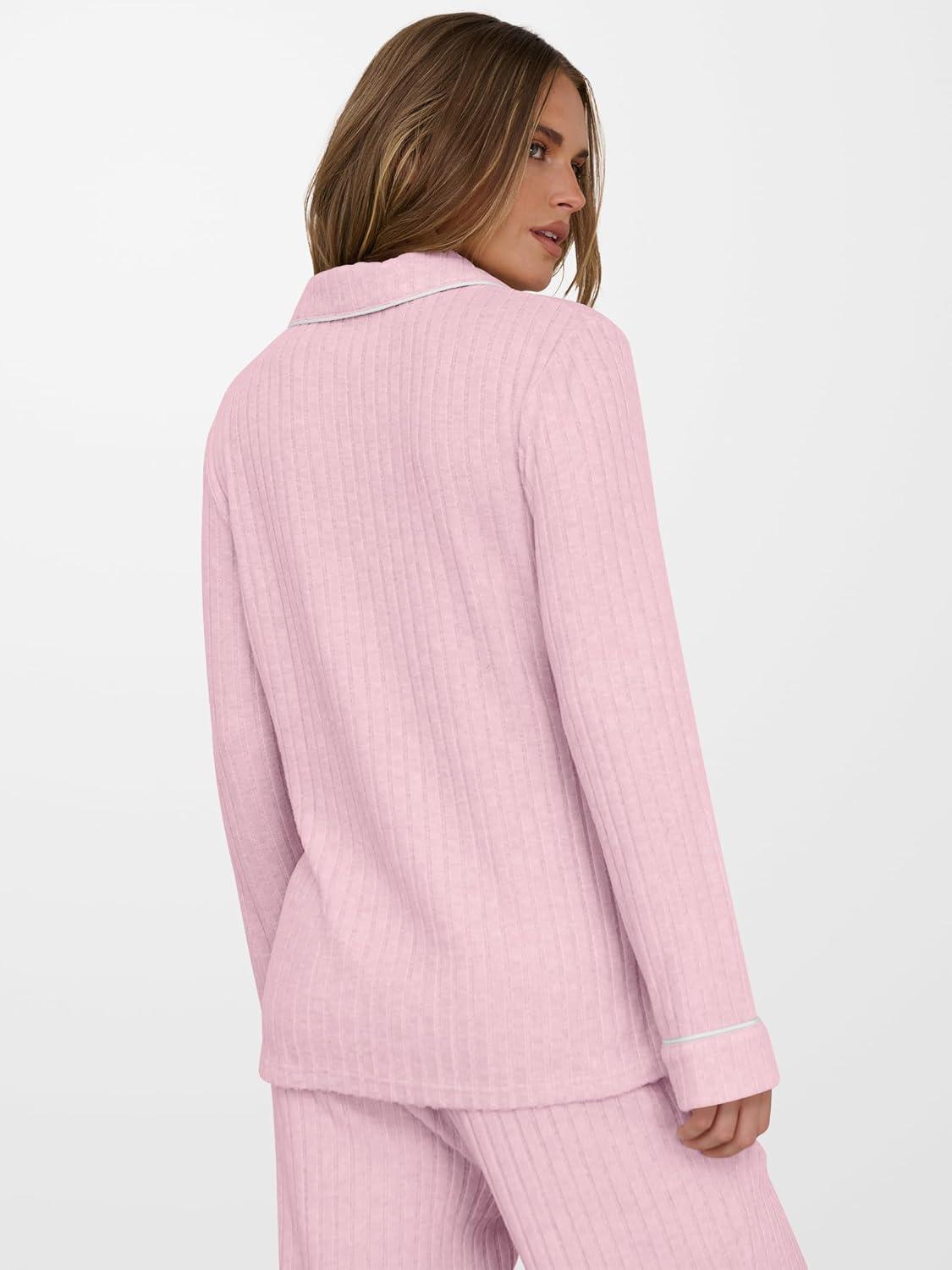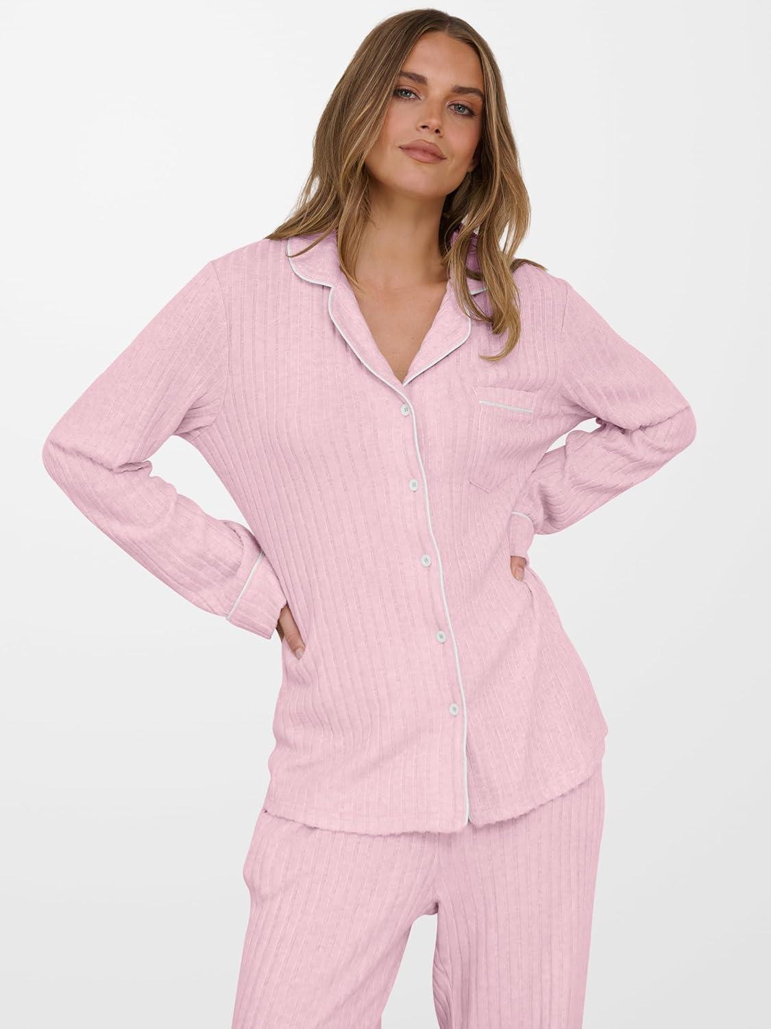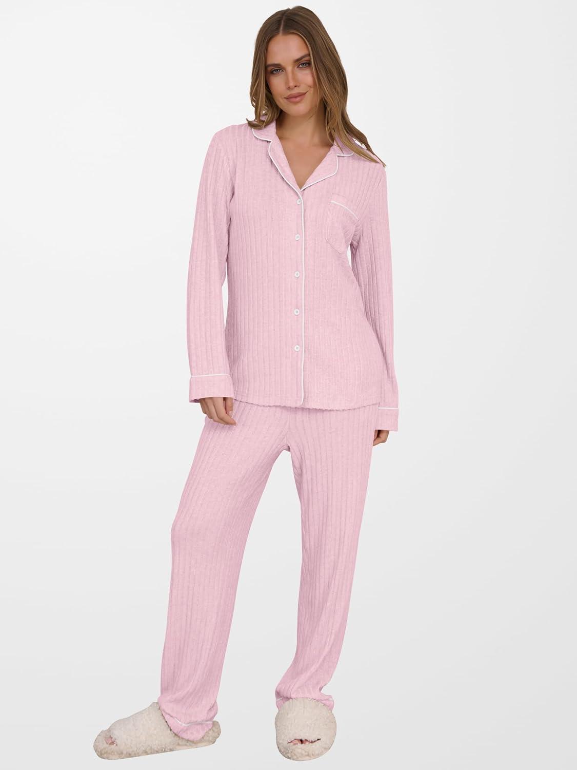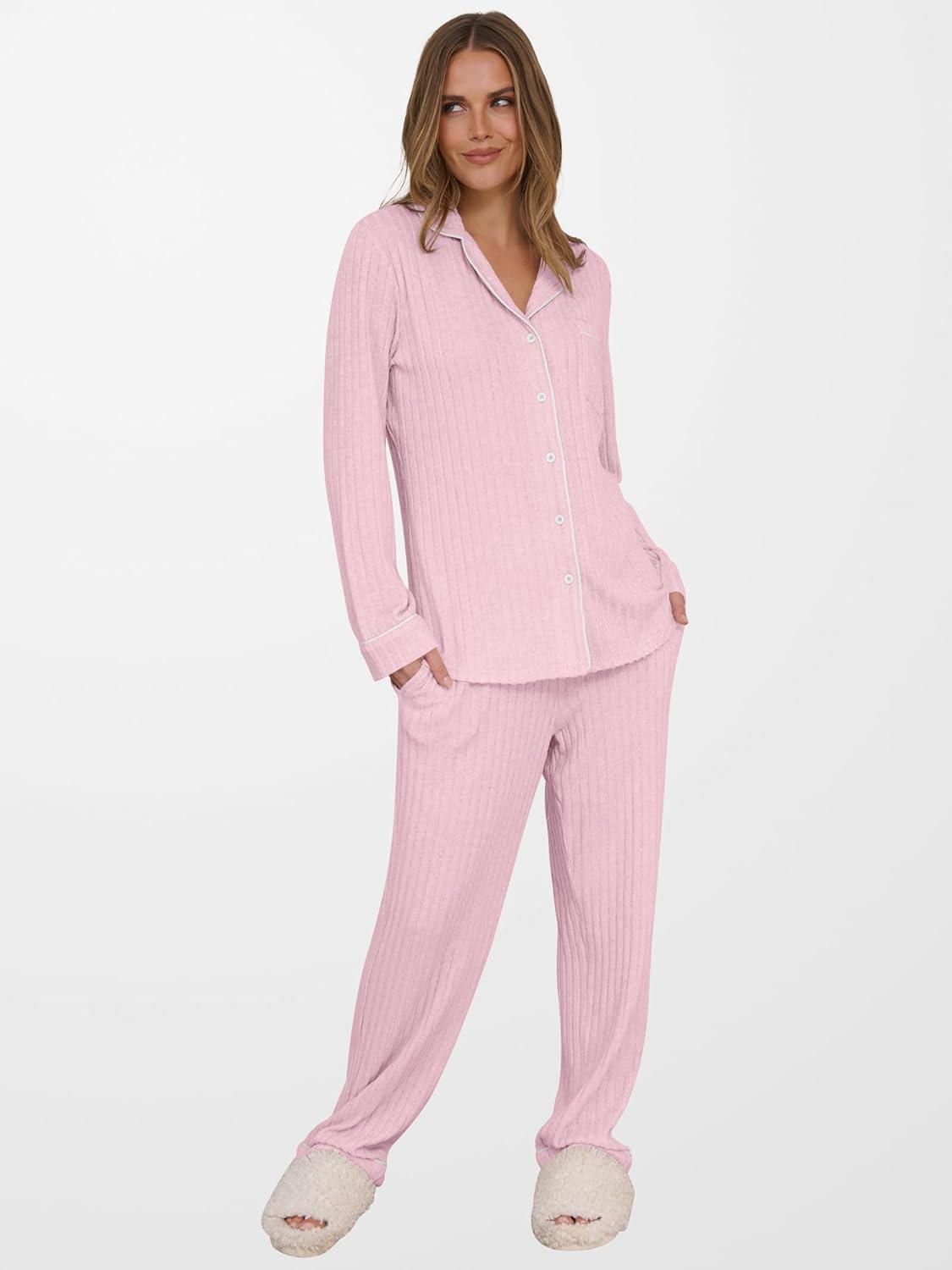 ANRABESS Women Pajama Lounge Sets 2025 Fall 2 Piece Outfits Ribbed Long Sleeve Matching PJ Set Sleepwear Loungewear(Pink)