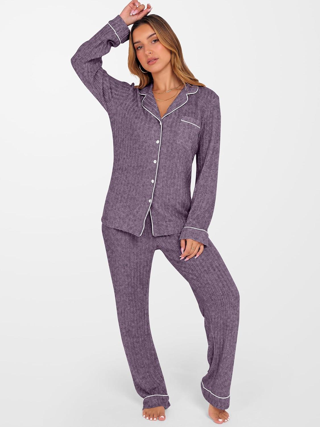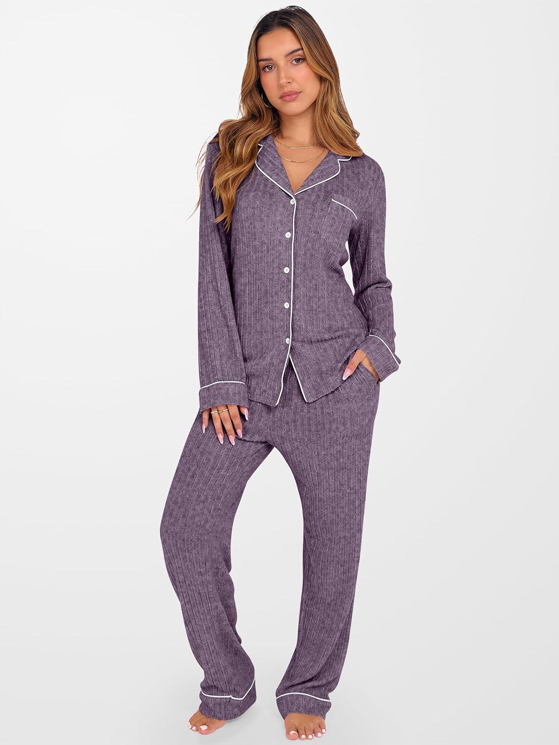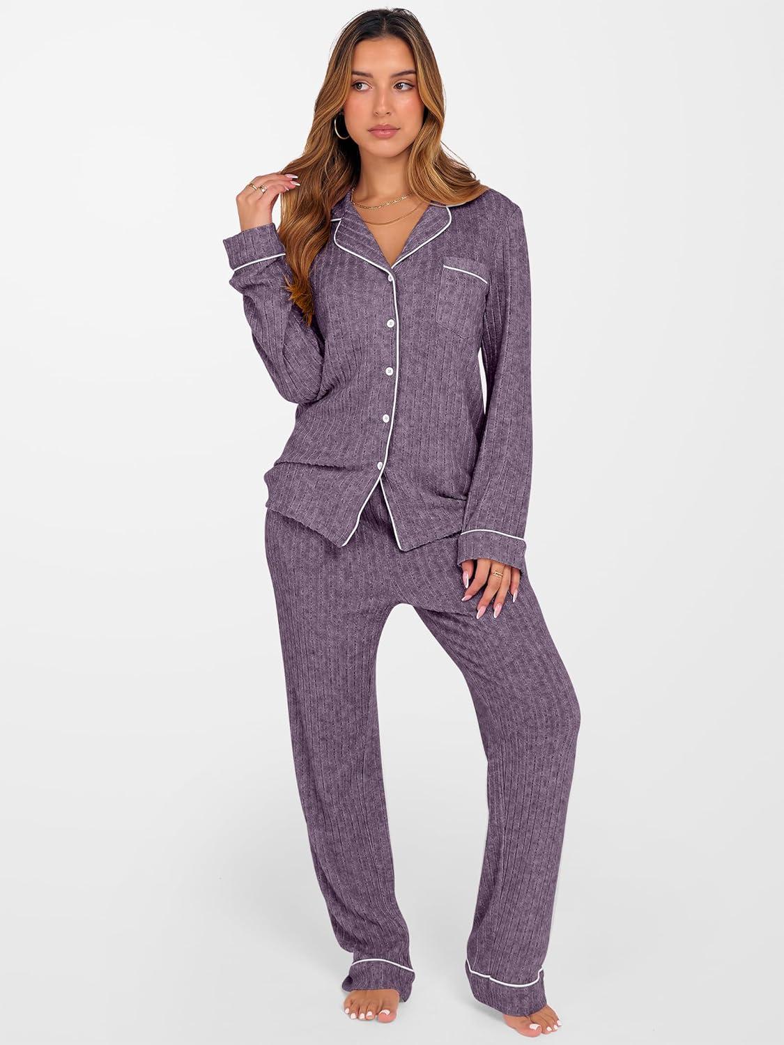 ANRABESS Women Pajama Lounge Sets 2025 Fall 2 Piece Outfits Ribbed Long Sleeve Matching PJ Set Sleepwear Loungewear(Purple)
