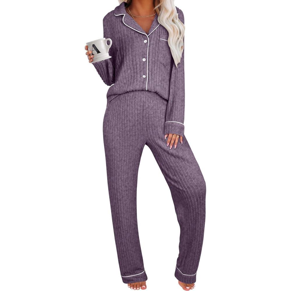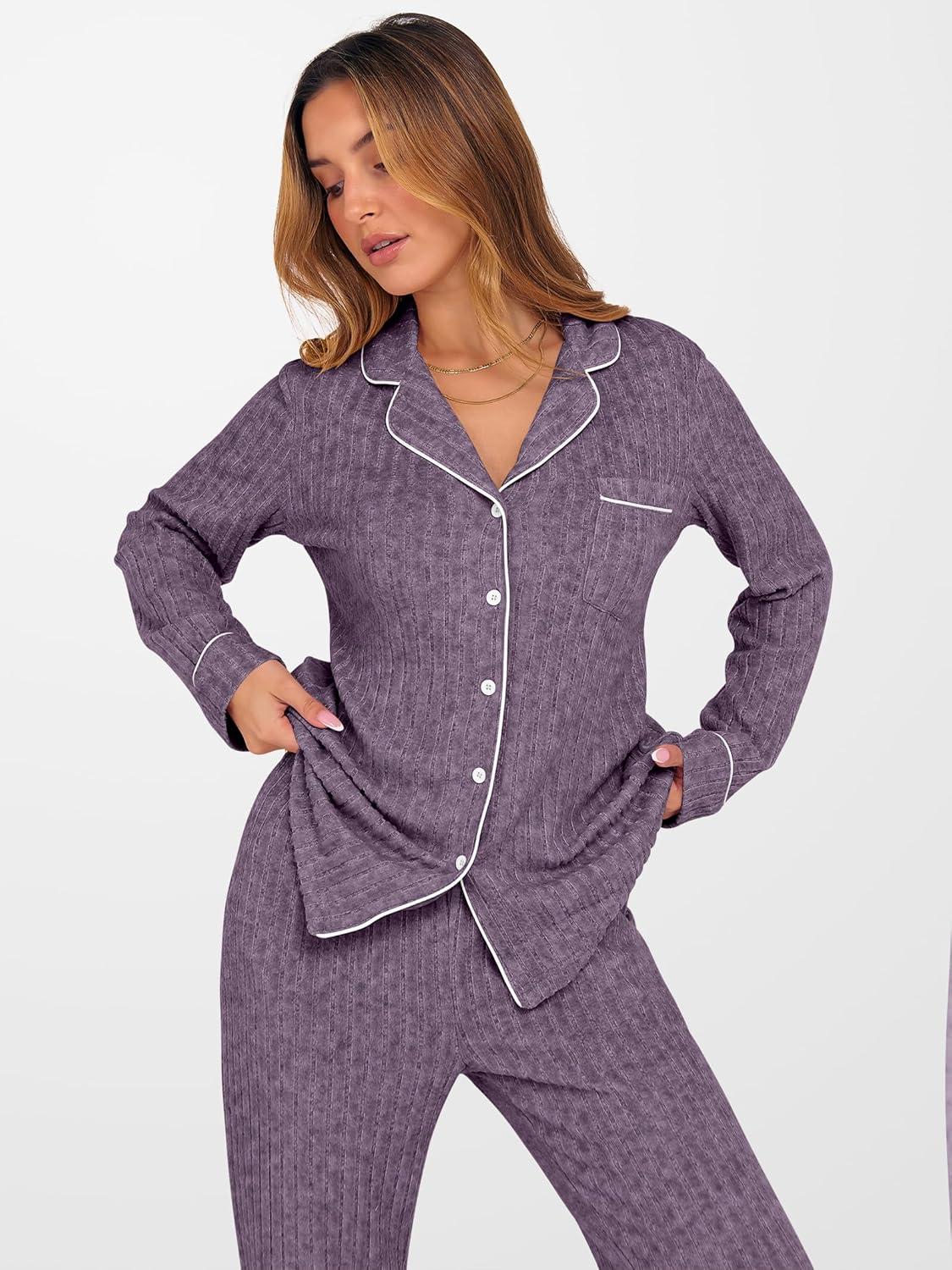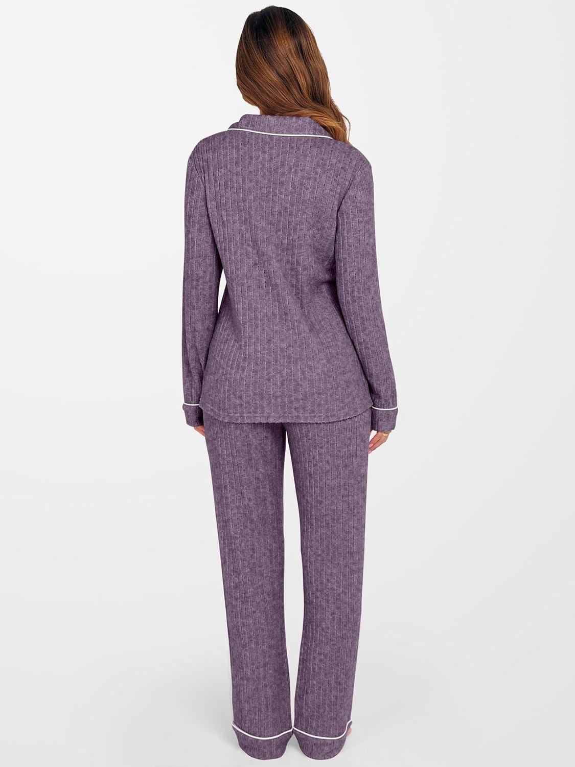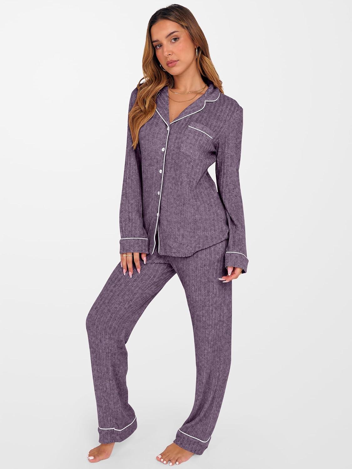 ANRABESS Women Pajama Lounge Sets 2025 Fall 2 Piece Outfits Ribbed Long Sleeve Matching PJ Set Sleepwear Loungewear(Purple)