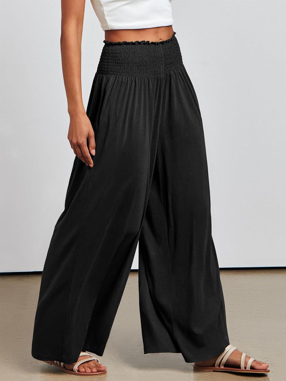 ANRABESS Women Palazzo Pants Summer Boho Bagyy Wide Leg High Smocked Waist Casual Loose Lounge Pant with Pocket(Black)