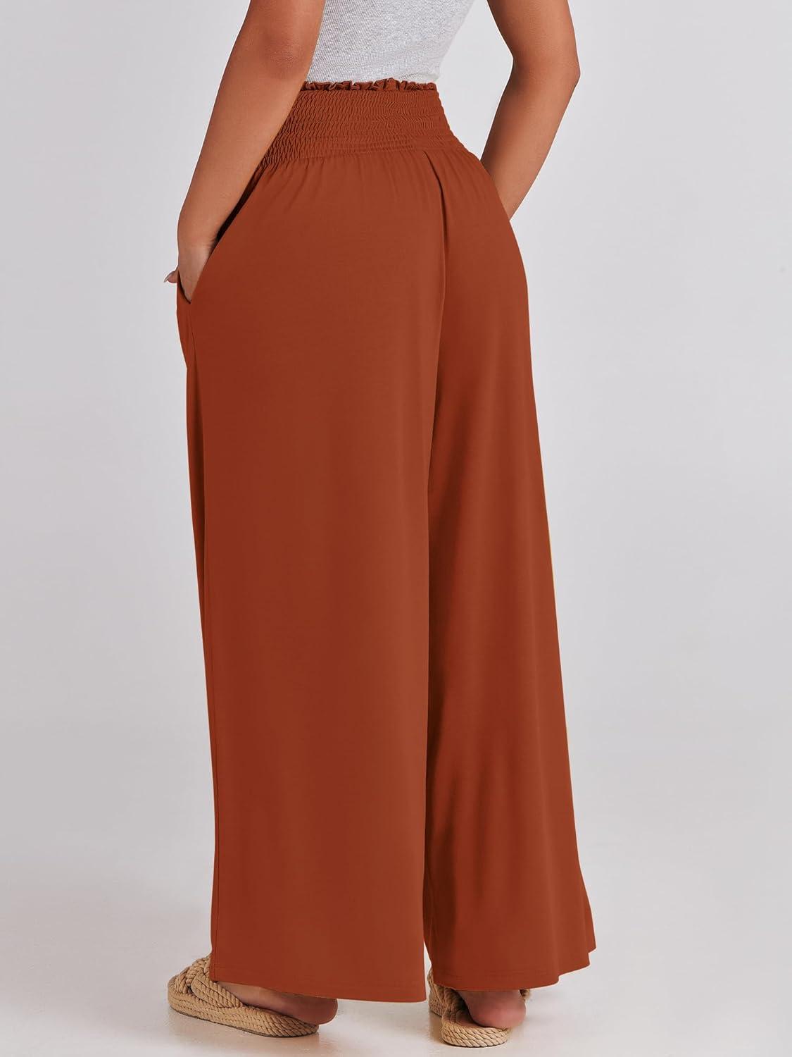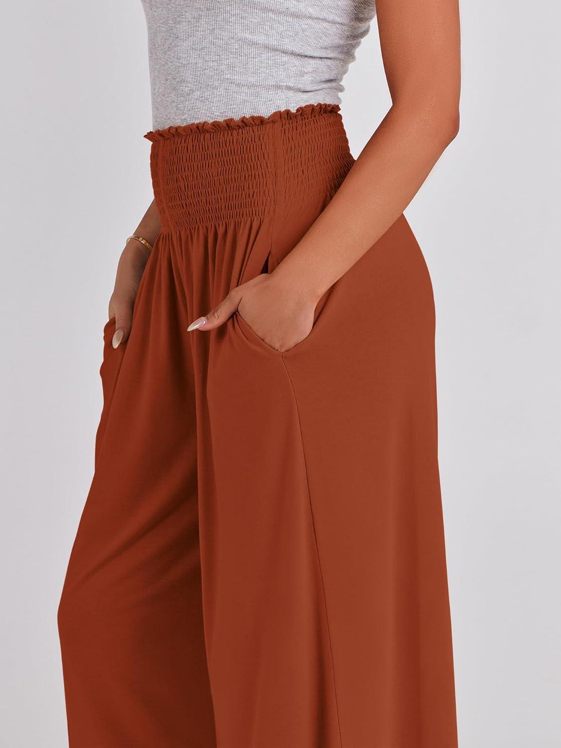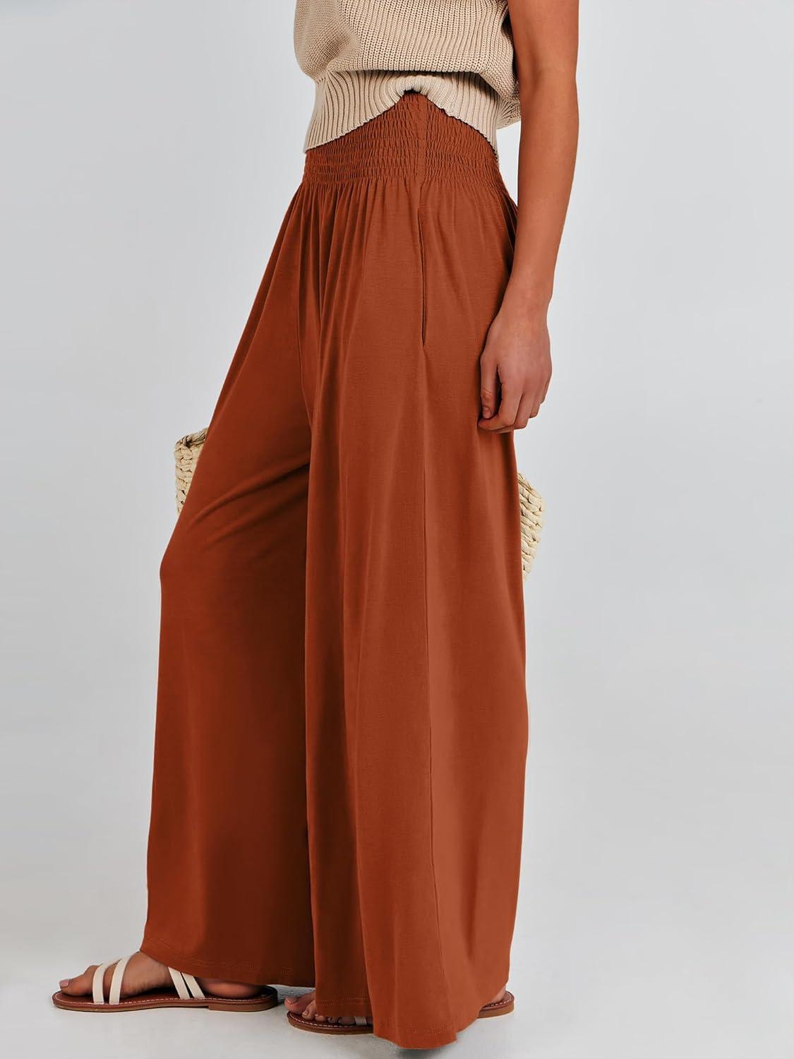 ANRABESS Women Palazzo Pants Summer Boho Bagyy Wide Leg High Smocked Waist Casual Loose Lounge Pant with Pocket(Brick Red)