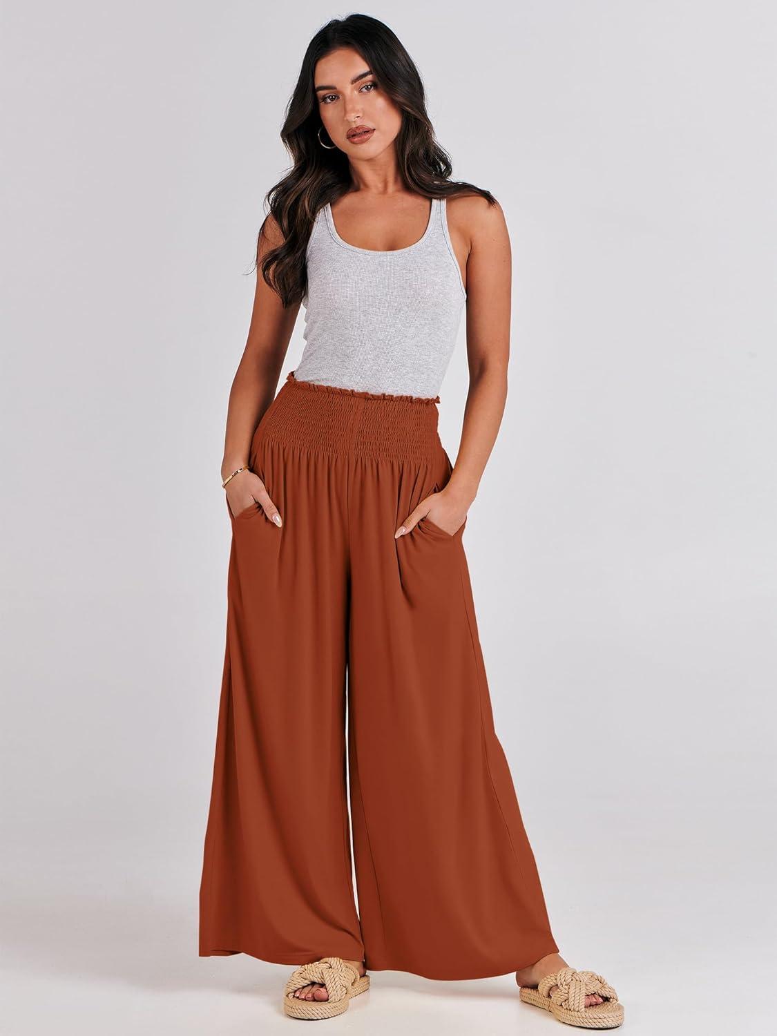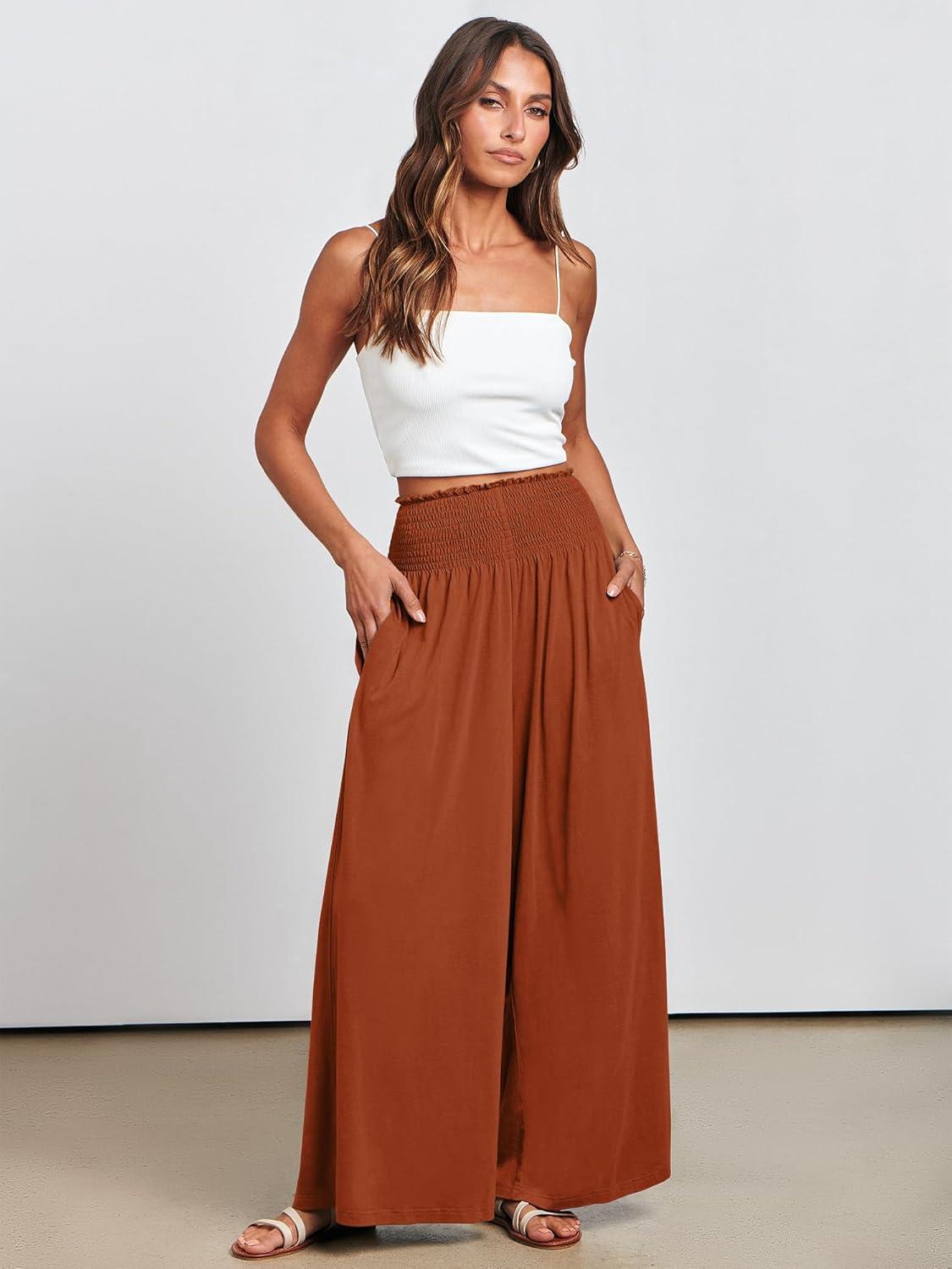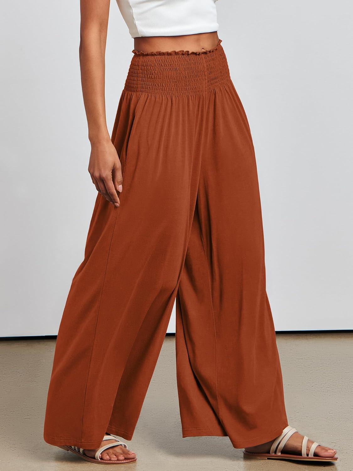 ANRABESS Women Palazzo Pants Summer Boho Bagyy Wide Leg High Smocked Waist Casual Loose Lounge Pant with Pocket(Brick Red)