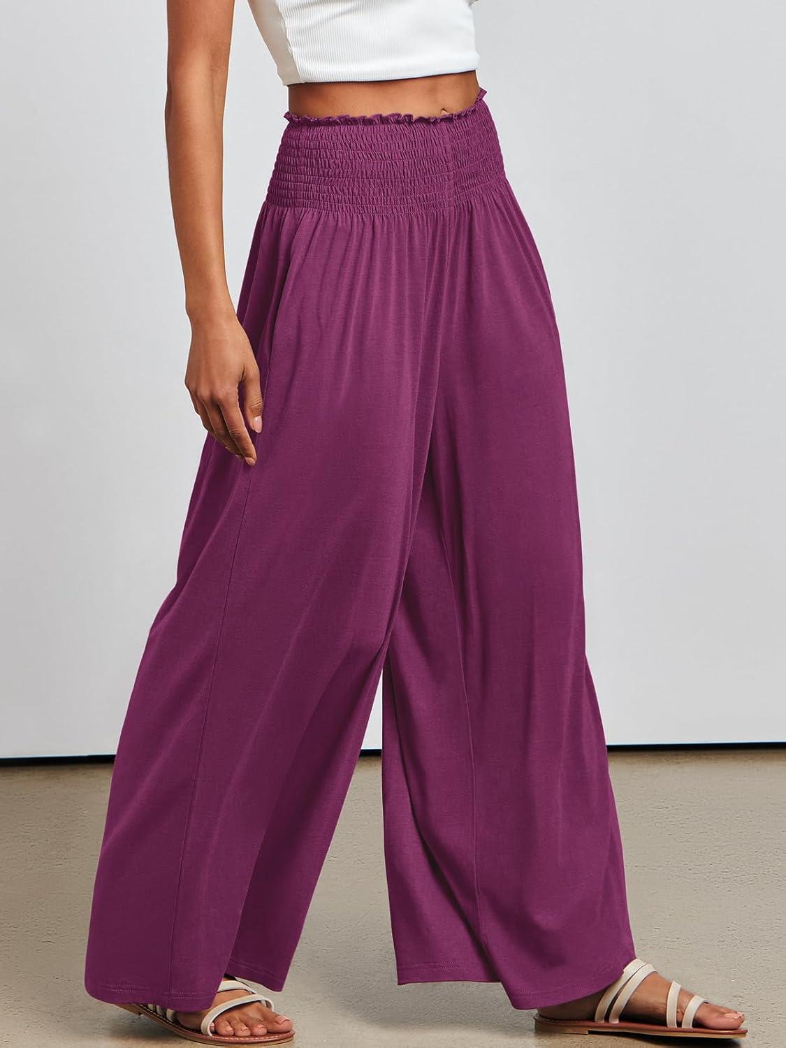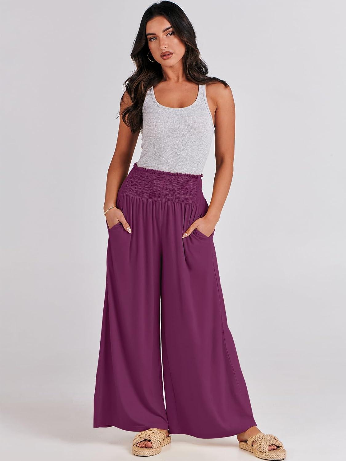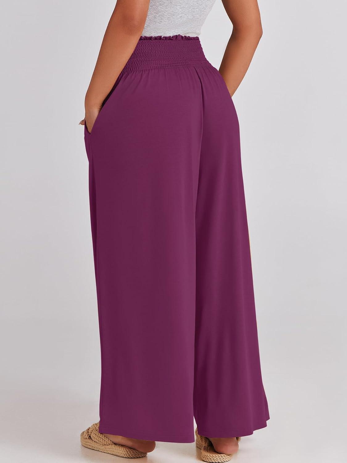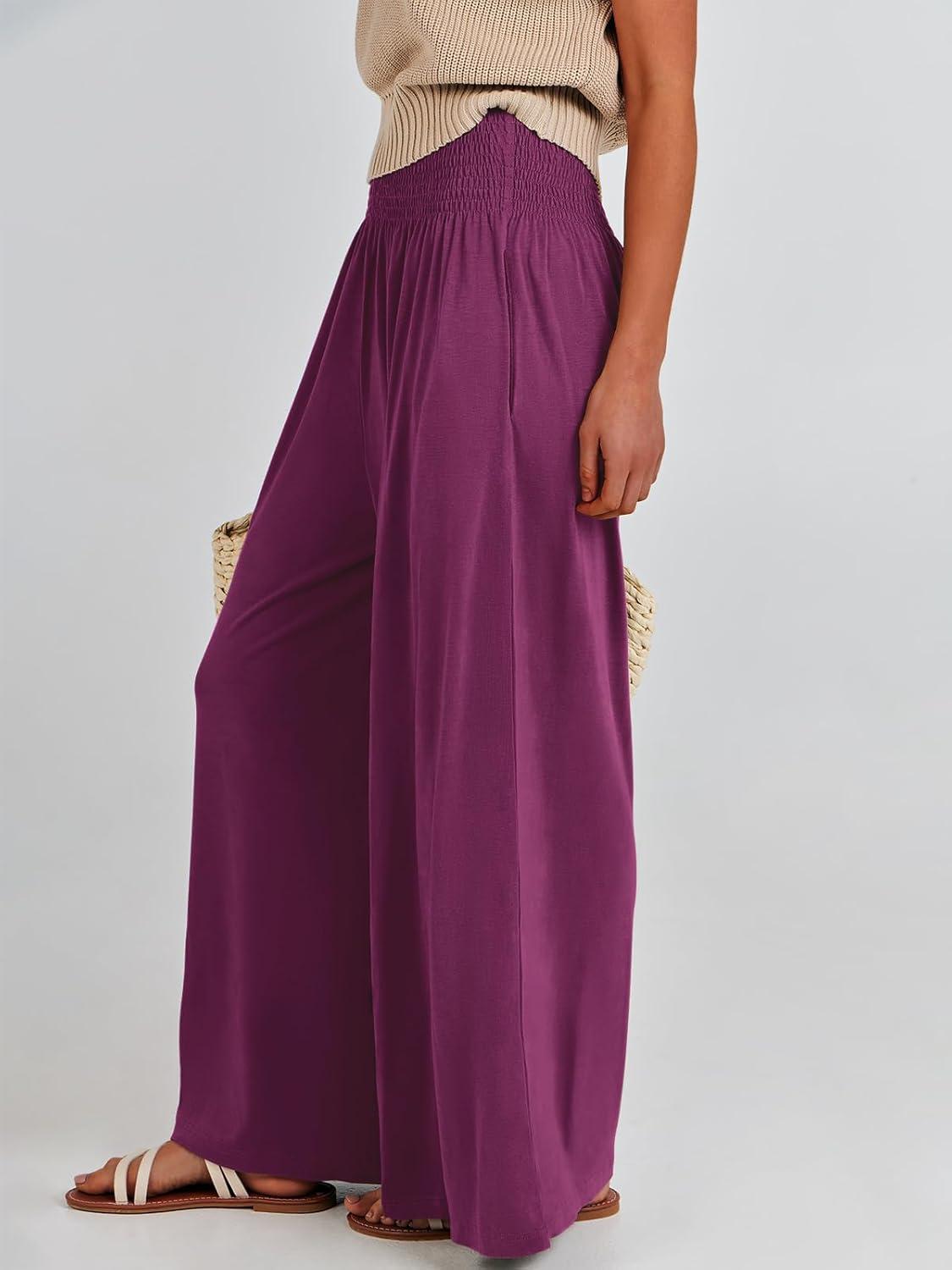 ANRABESS Women Palazzo Pants Summer Boho Bagyy Wide Leg High Smocked Waist Casual Loose Lounge Pant with Pocket(Dark Purple)
