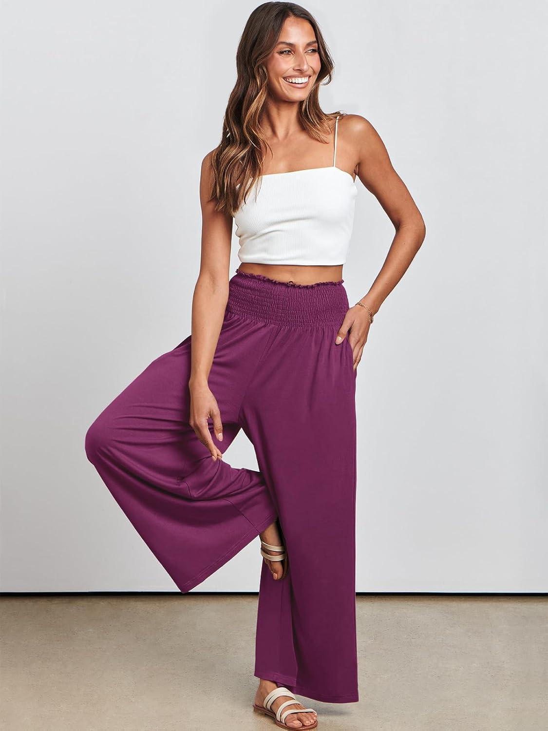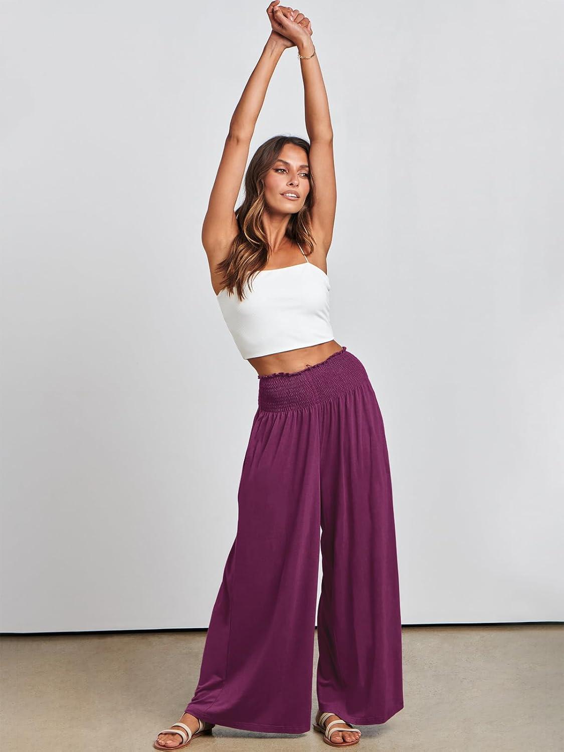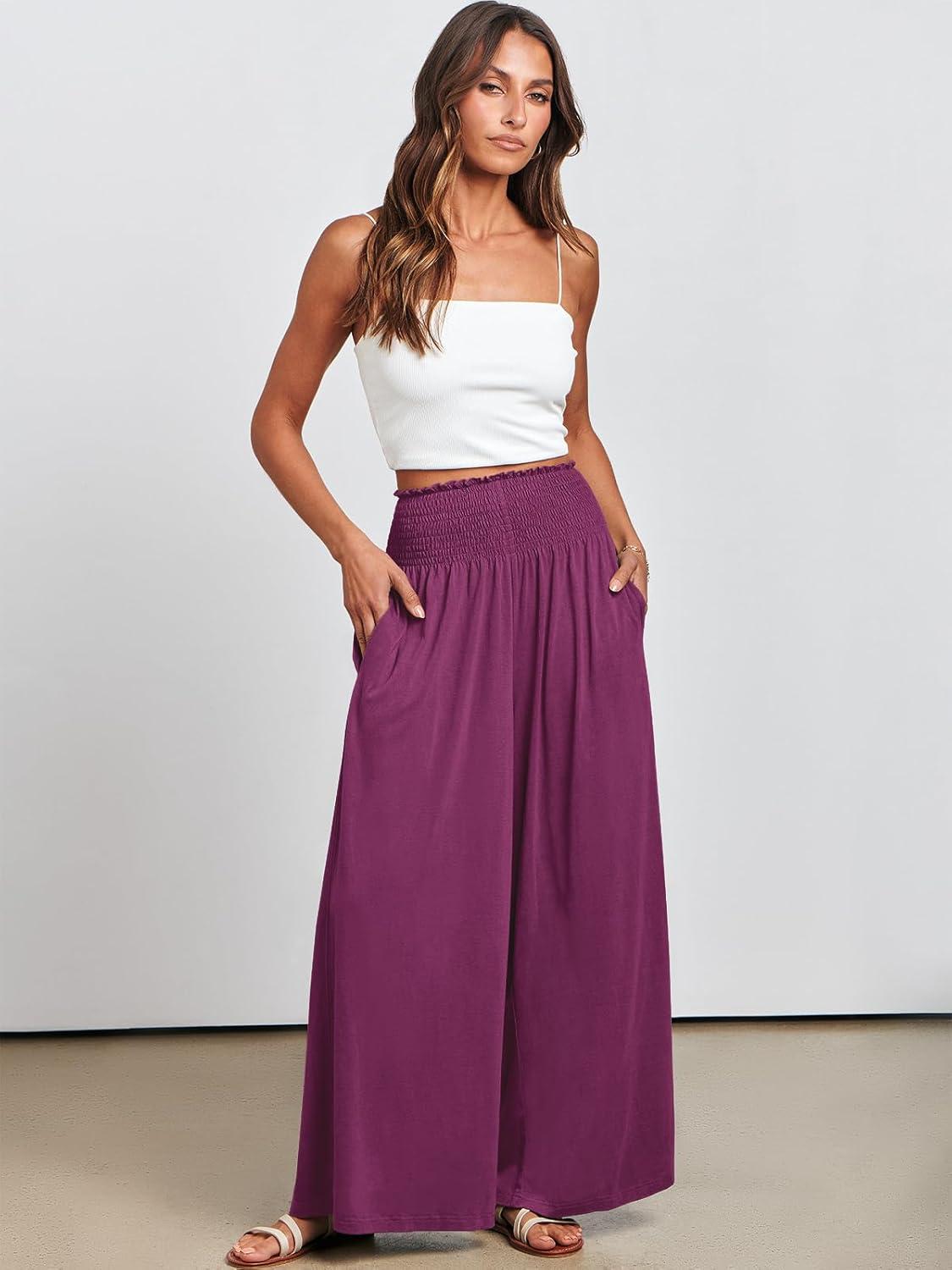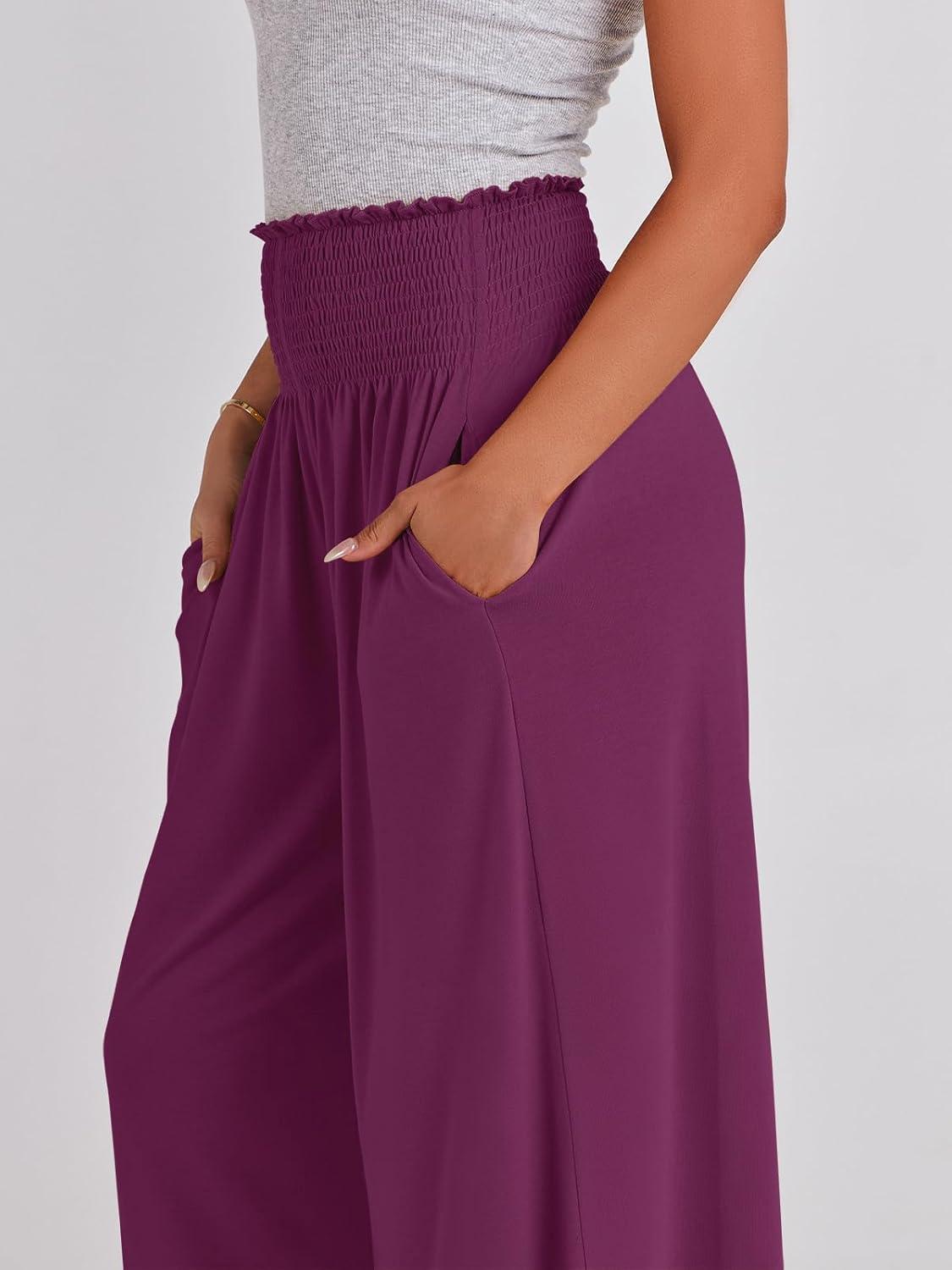 ANRABESS Women Palazzo Pants Summer Boho Bagyy Wide Leg High Smocked Waist Casual Loose Lounge Pant with Pocket(Dark Purple)