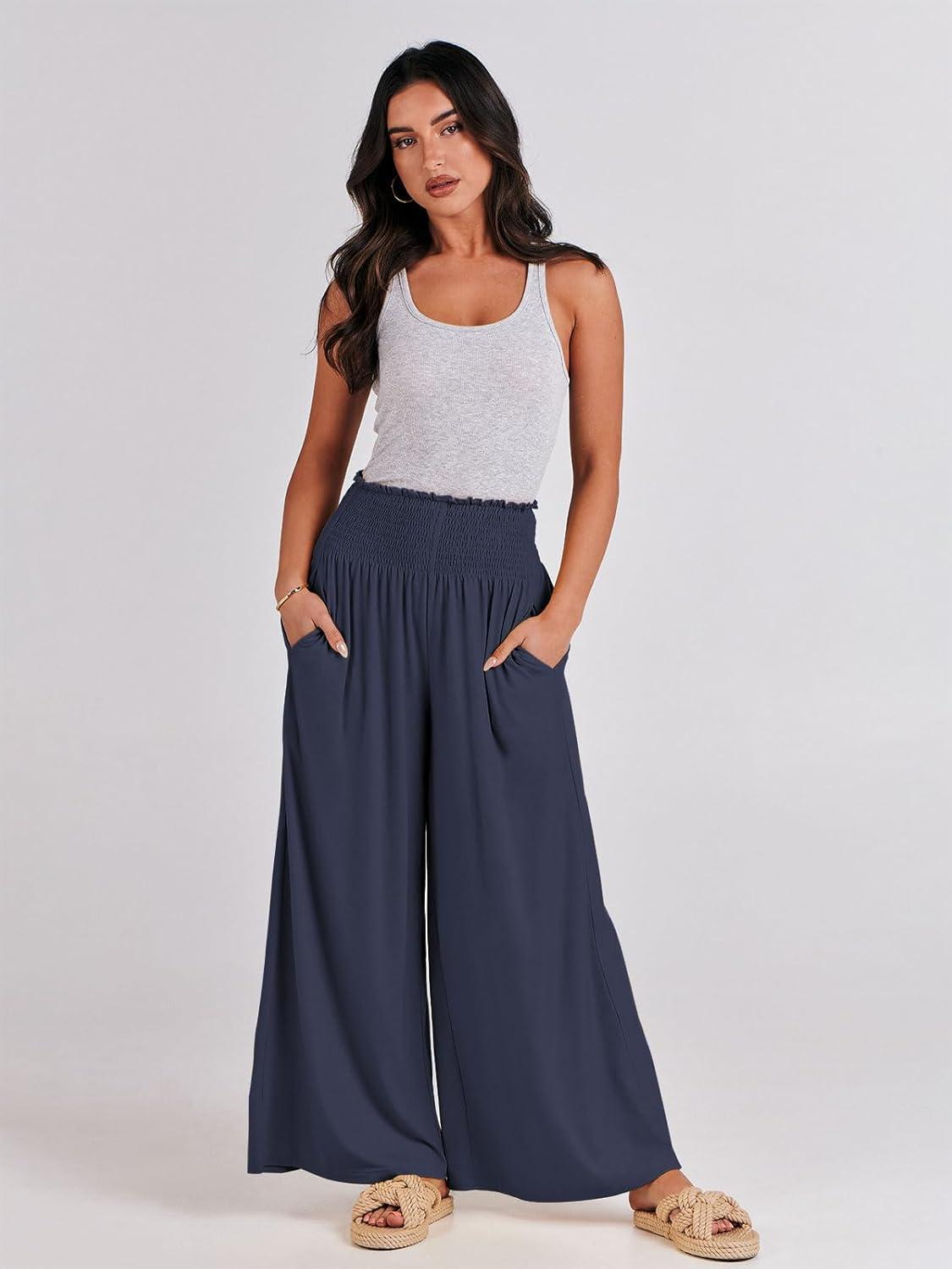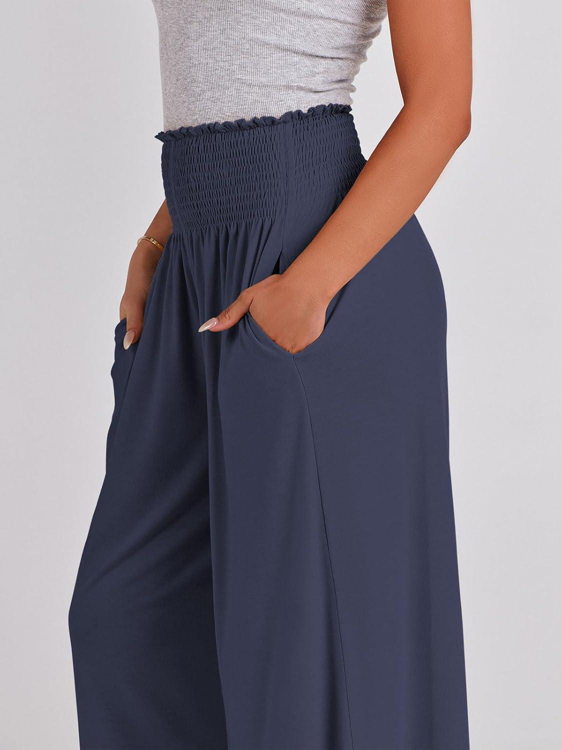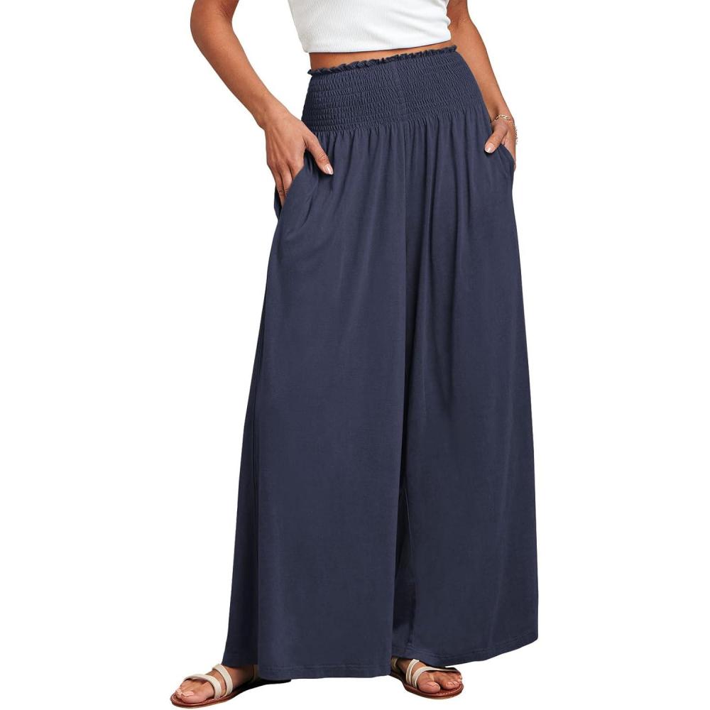 ANRABESS Women Palazzo Pants Summer Boho Bagyy Wide Leg High Smocked Waist Casual Loose Lounge Pant with Pocket(Deep Blue)