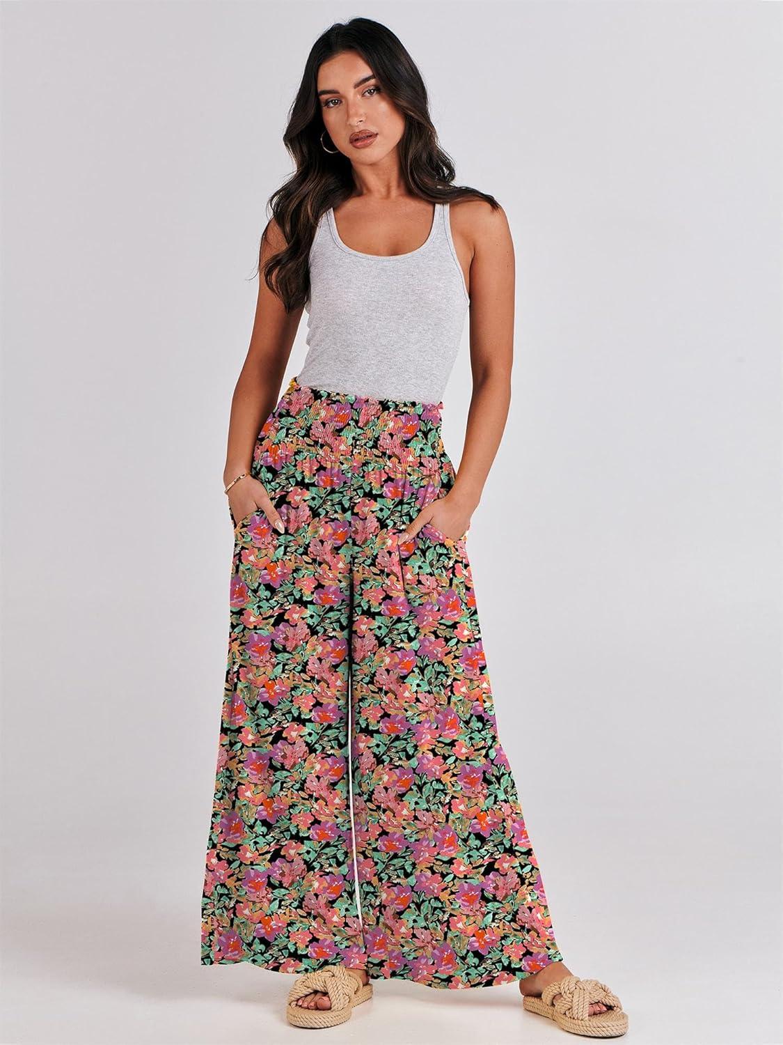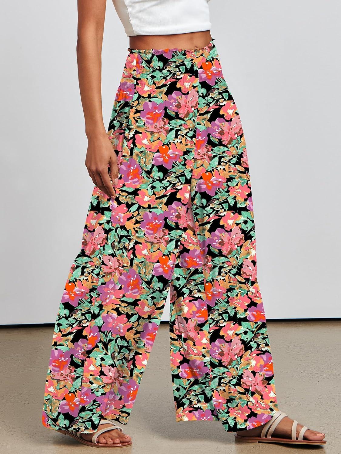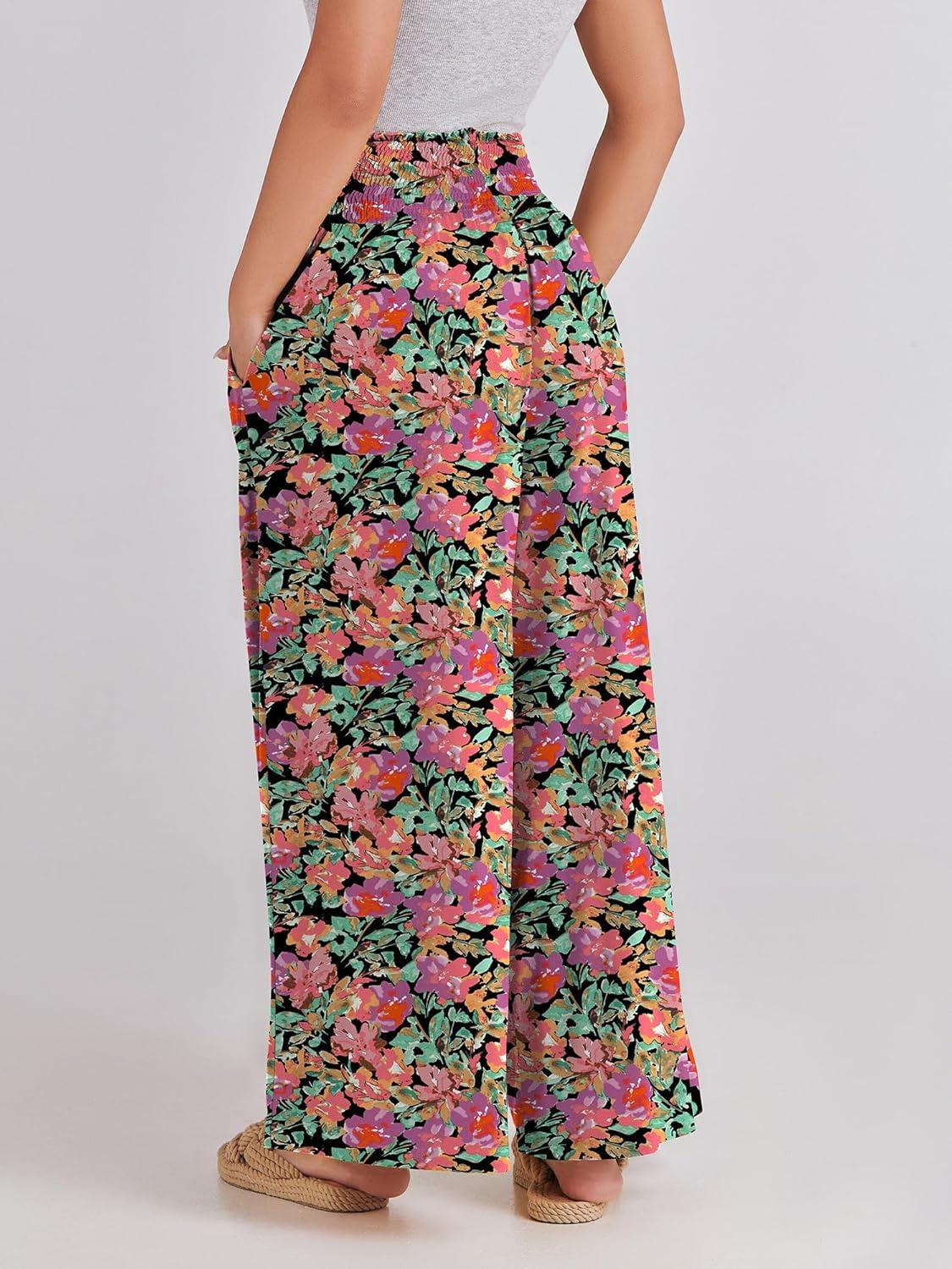 ANRABESS Women Palazzo Pants Summer Boho Bagyy Wide Leg High Smocked Waist Casual Loose Lounge Pant with Pocket(Floral Black Red)