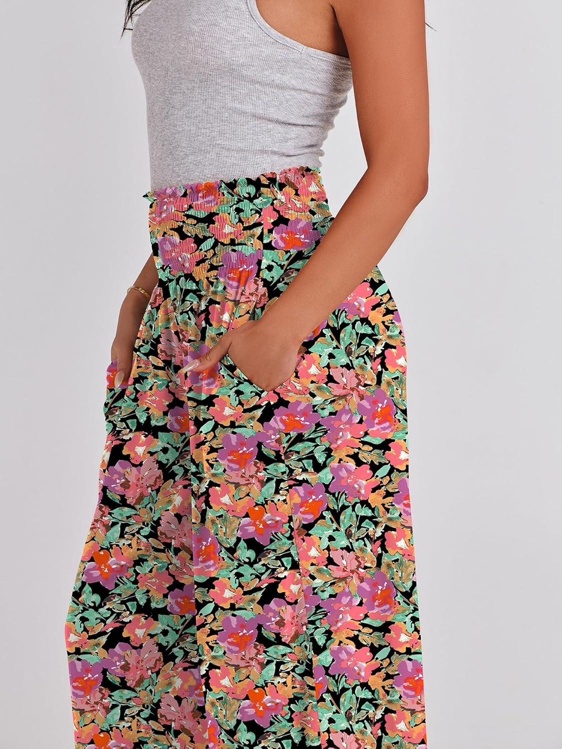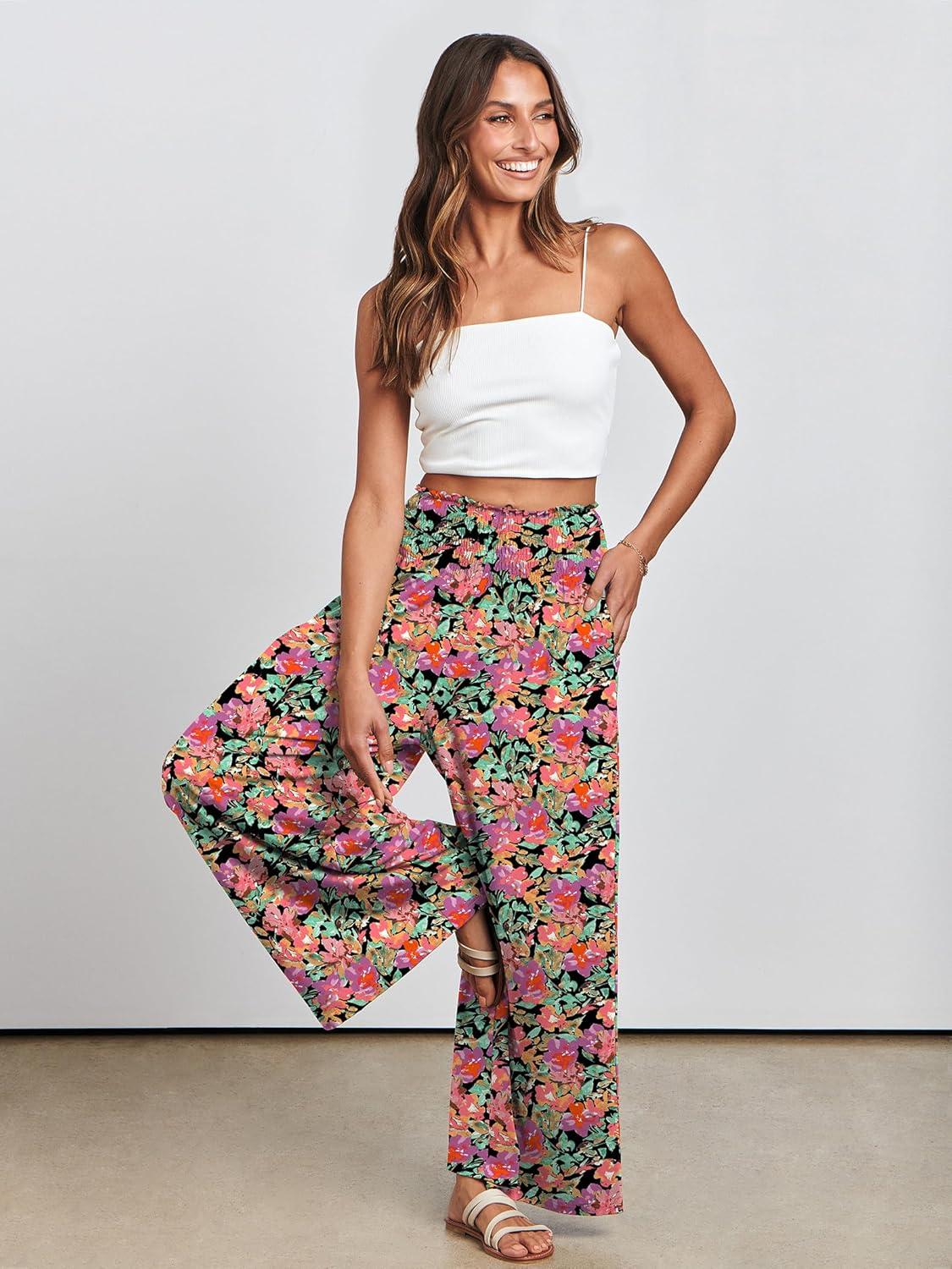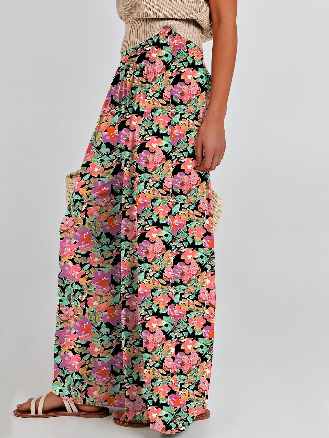 ANRABESS Women Palazzo Pants Summer Boho Bagyy Wide Leg High Smocked Waist Casual Loose Lounge Pant with Pocket(Floral Black Red)