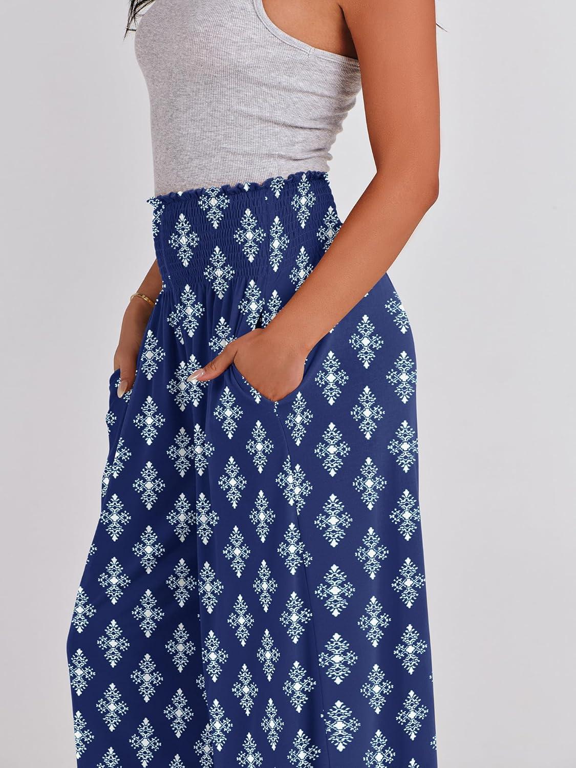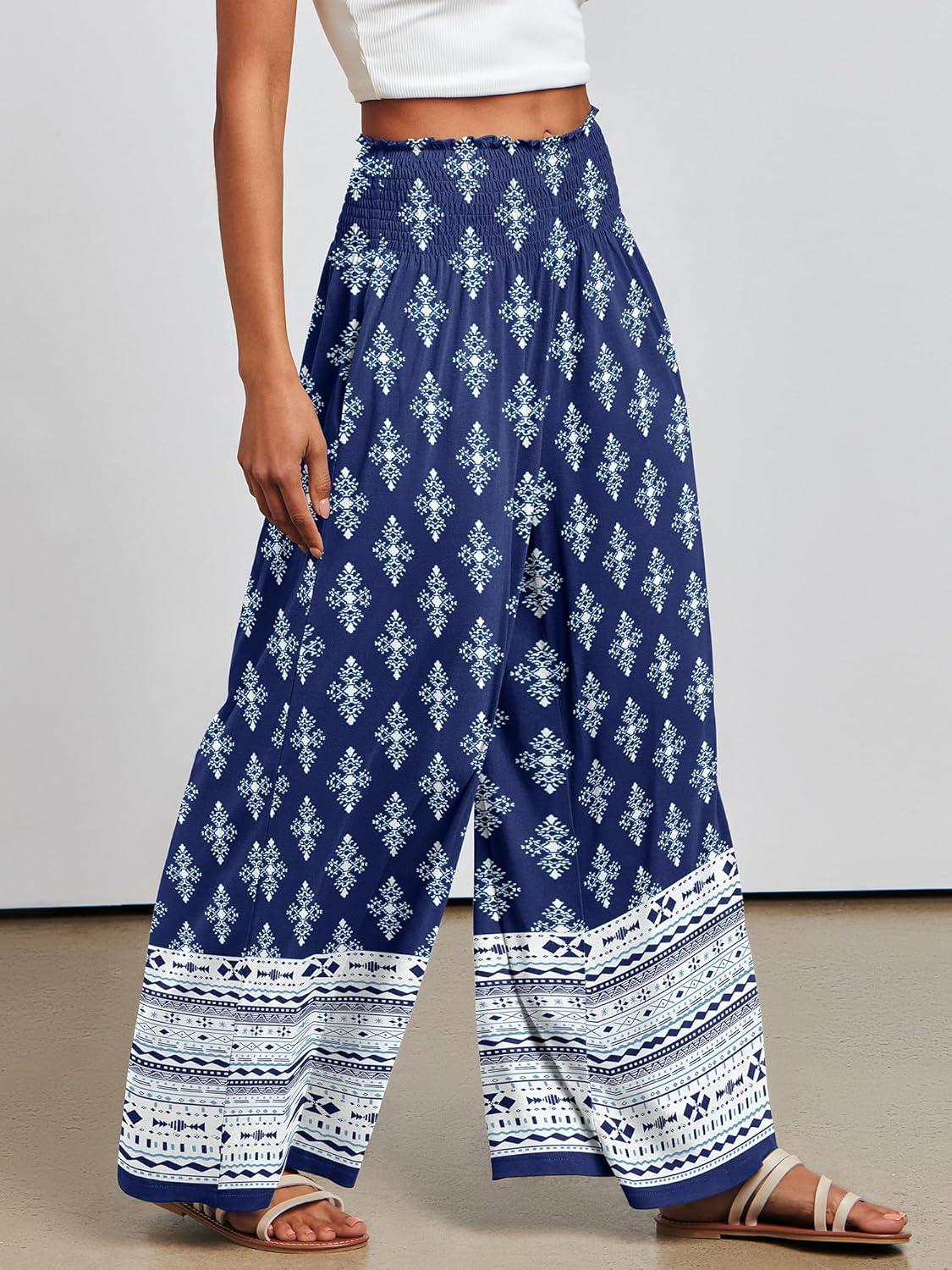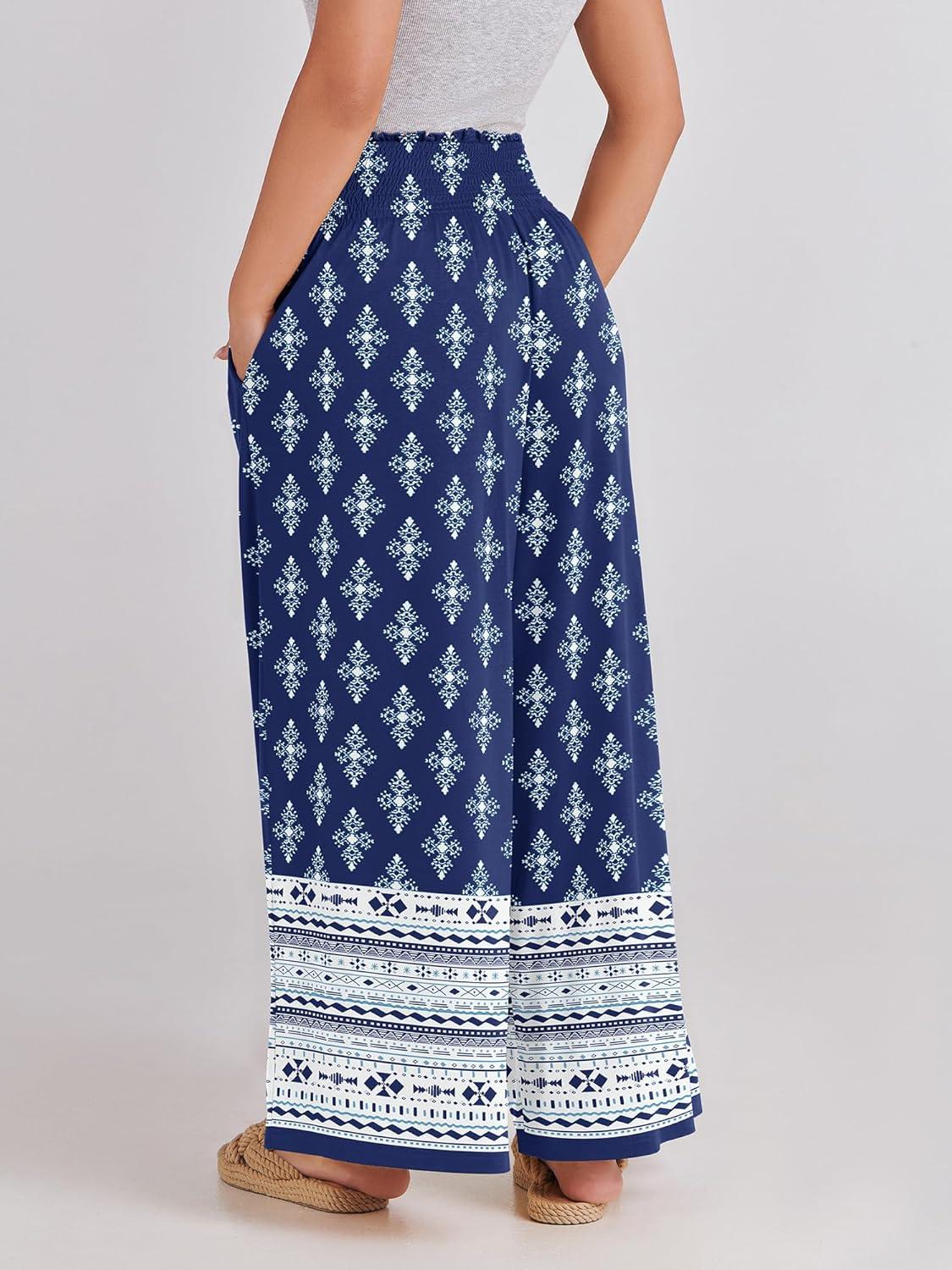 ANRABESS Women Palazzo Pants Summer Boho Bagyy Wide Leg High Smocked Waist Casual Loose Lounge Pant with Pocket(Floral Blue Diamond)