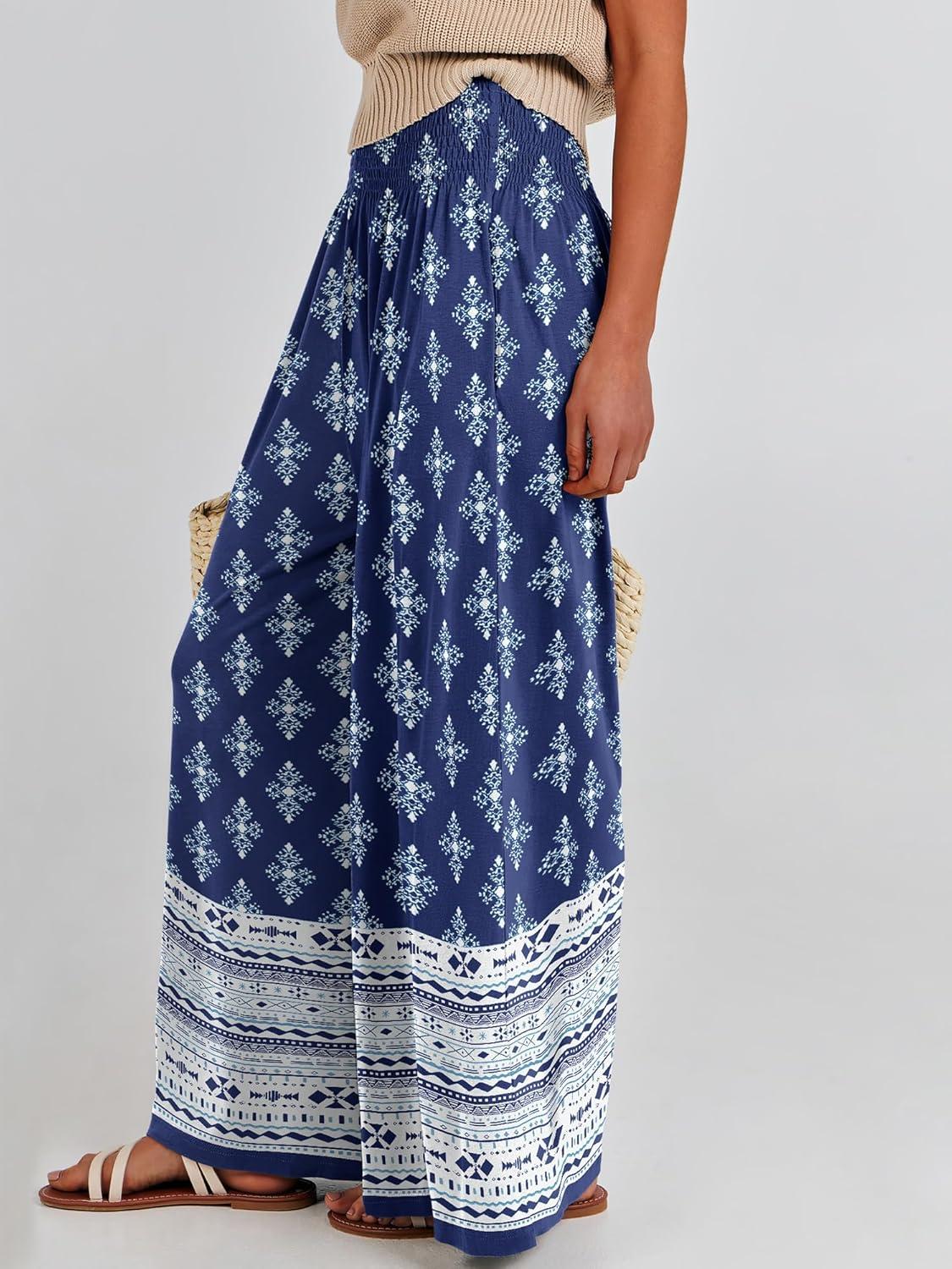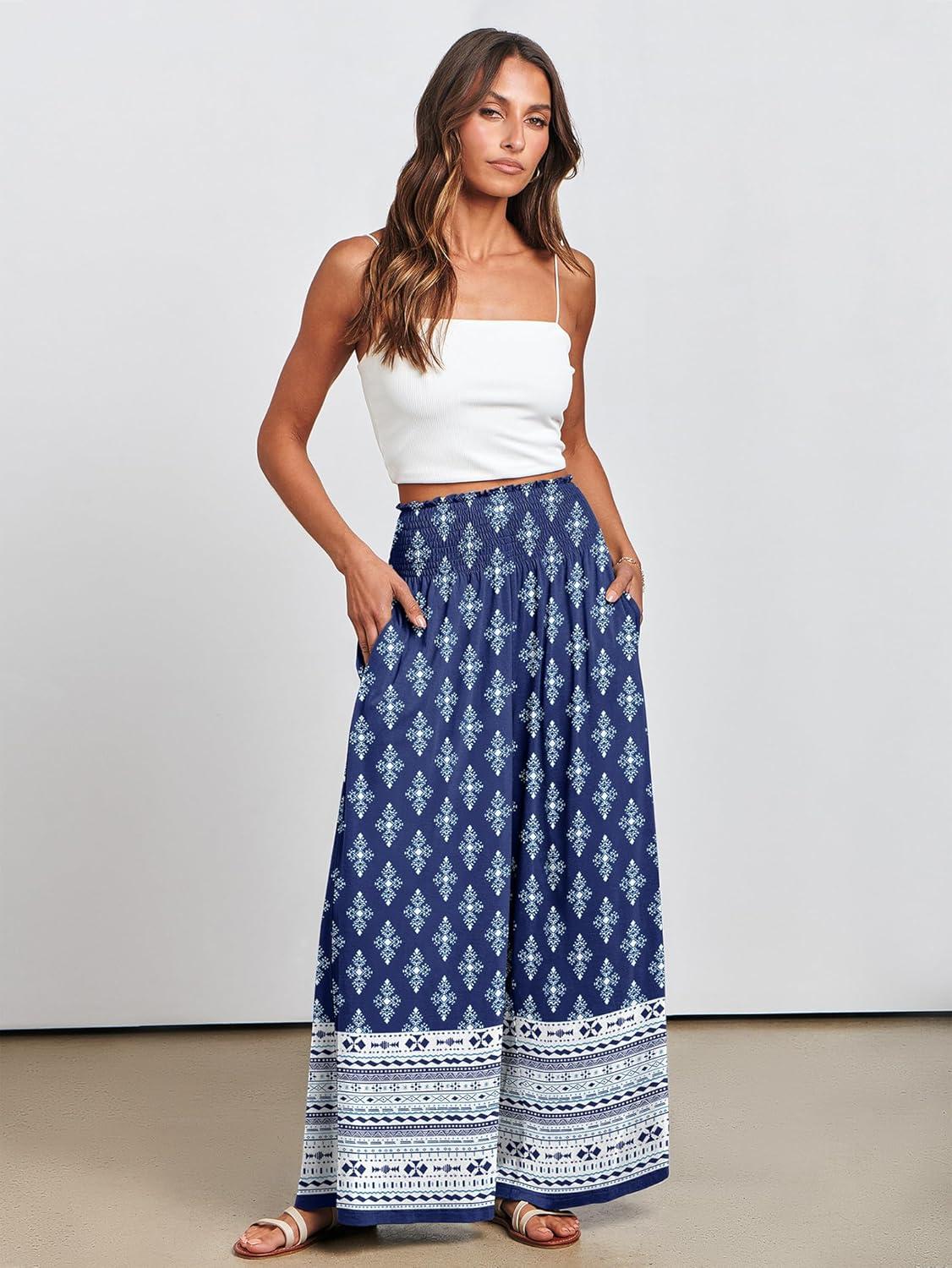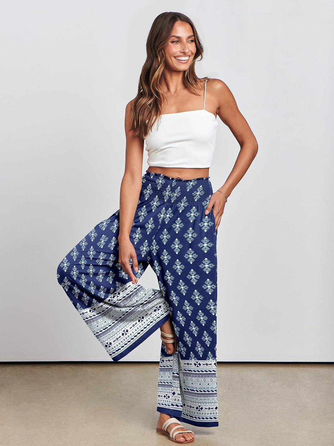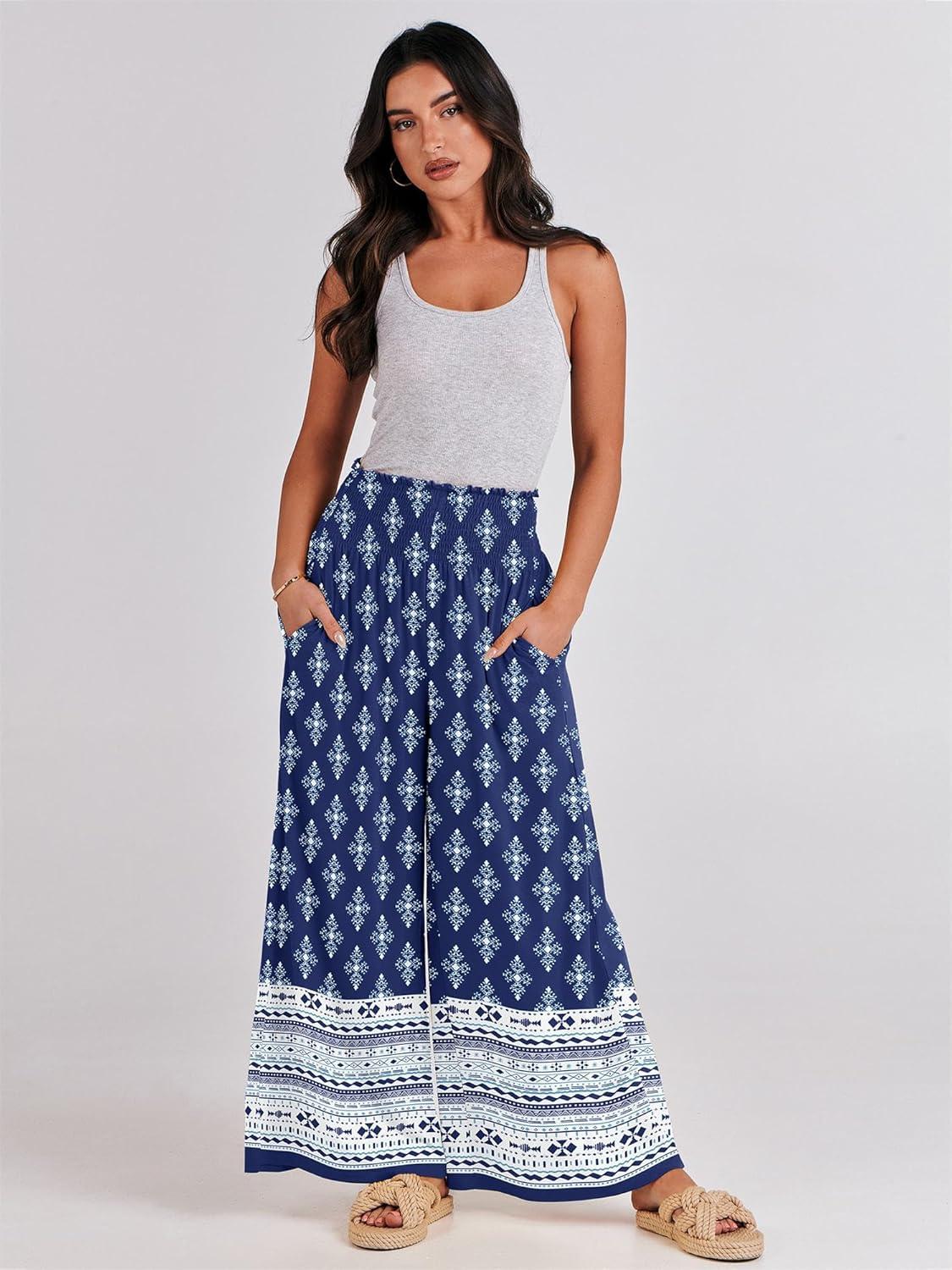 ANRABESS Women Palazzo Pants Summer Boho Bagyy Wide Leg High Smocked Waist Casual Loose Lounge Pant with Pocket(Floral Blue Diamond)