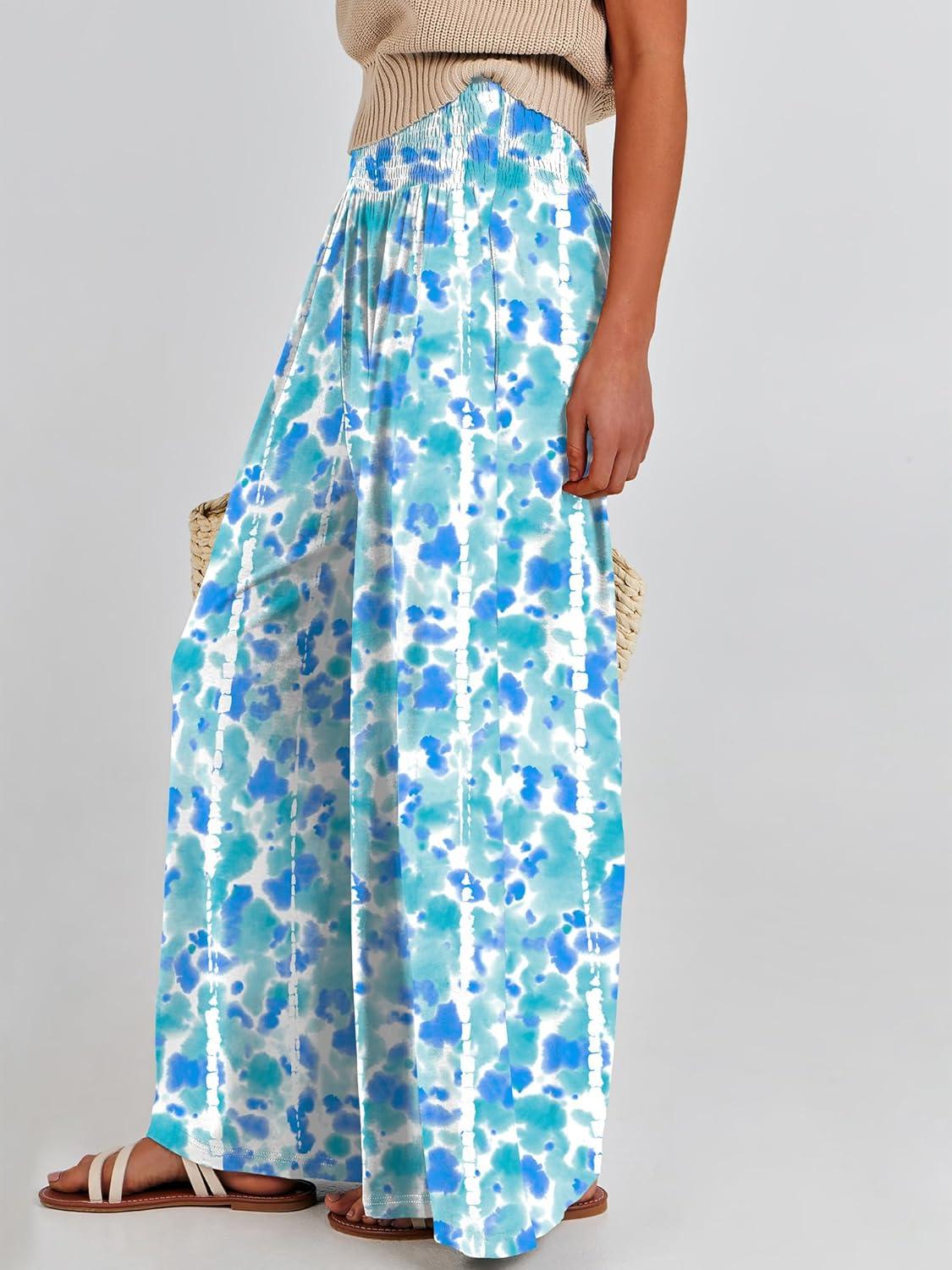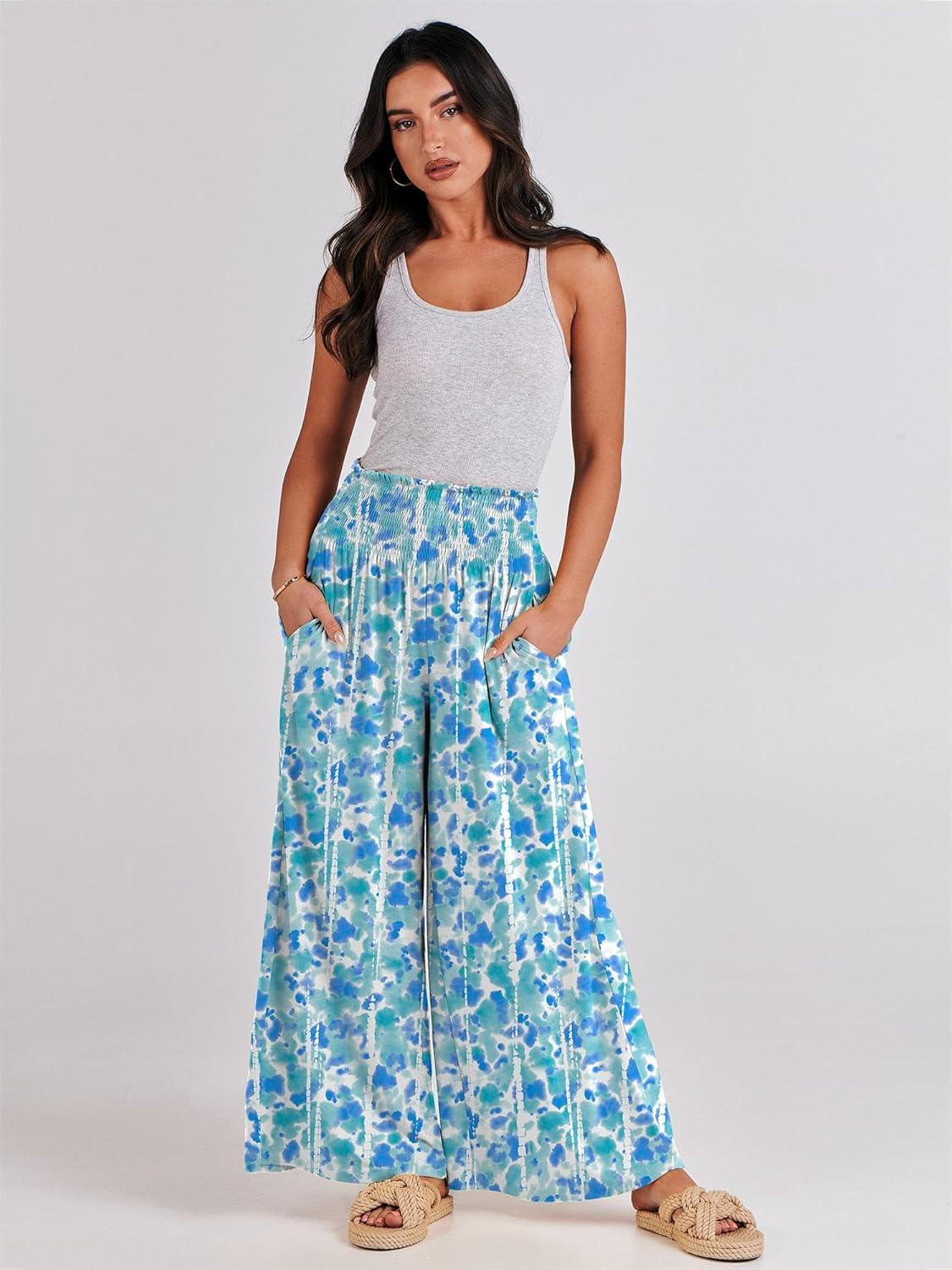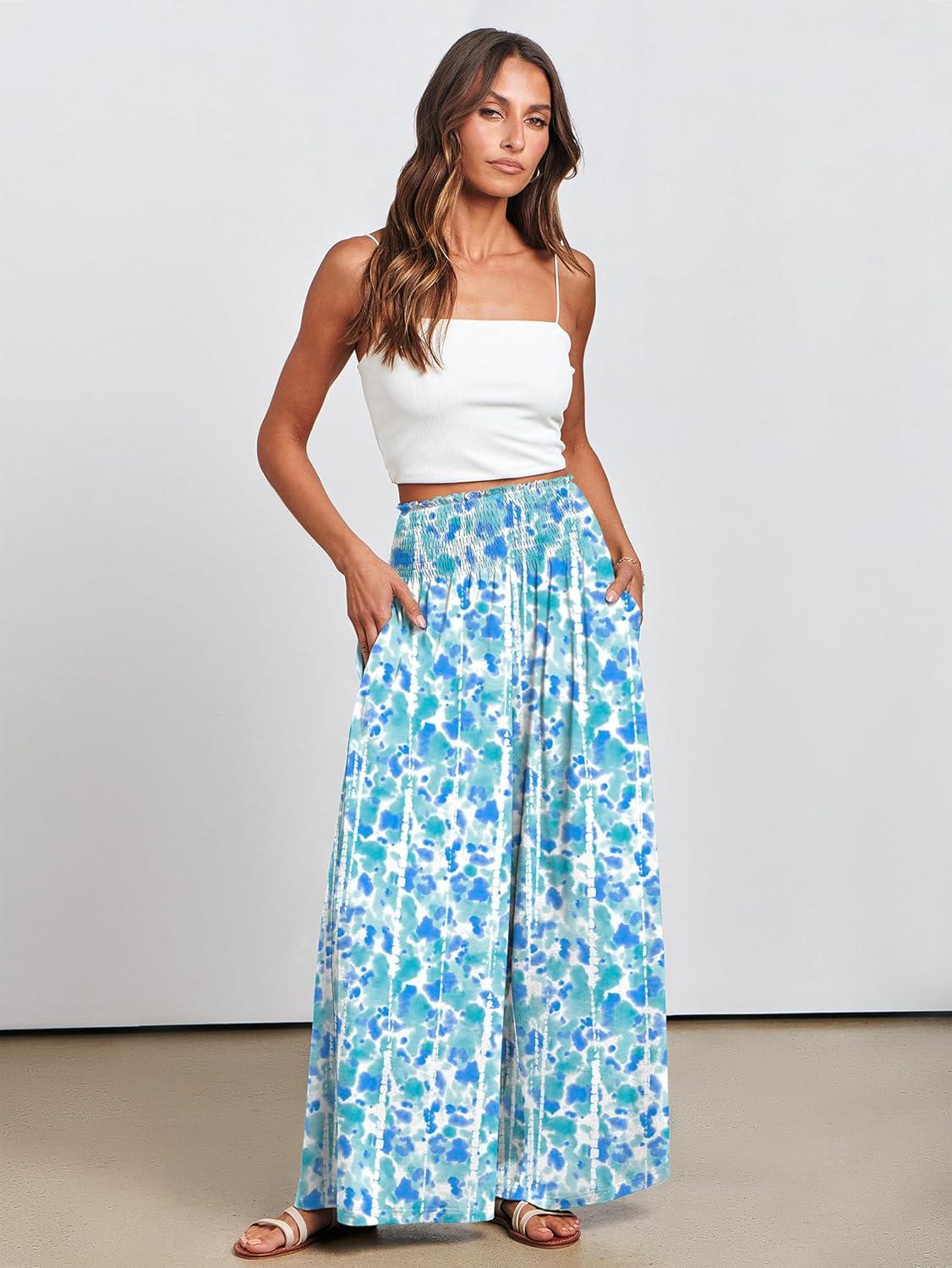 ANRABESS Women Palazzo Pants Summer Boho Bagyy Wide Leg High Smocked Waist Casual Loose Lounge Pant with Pocket(Floral Lake Blue)