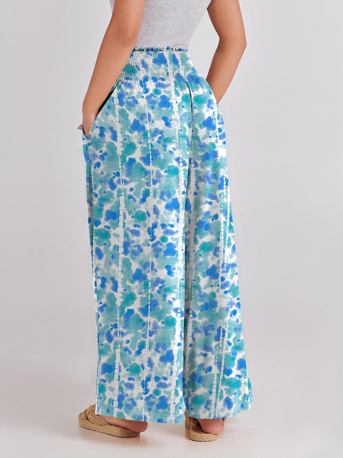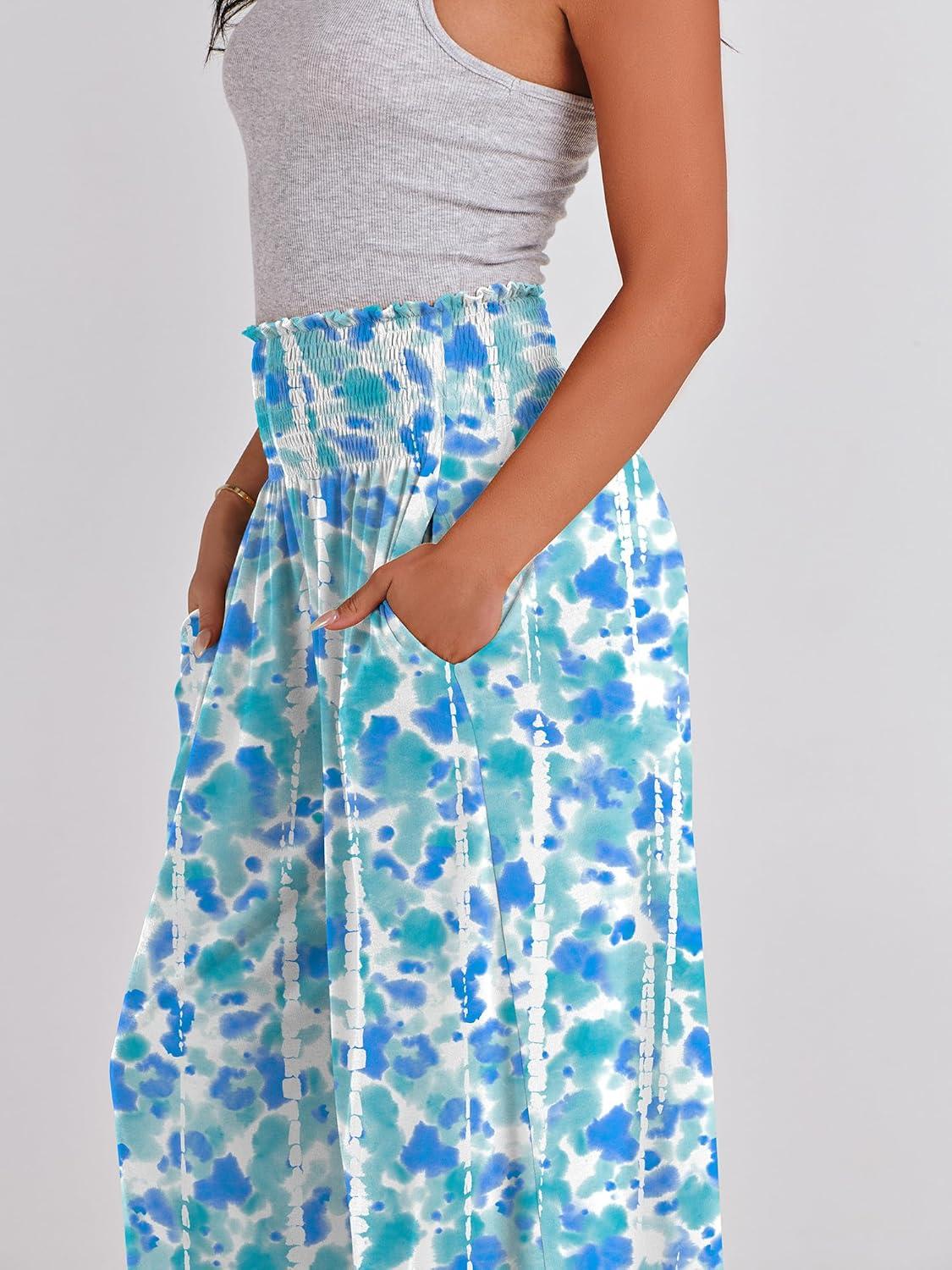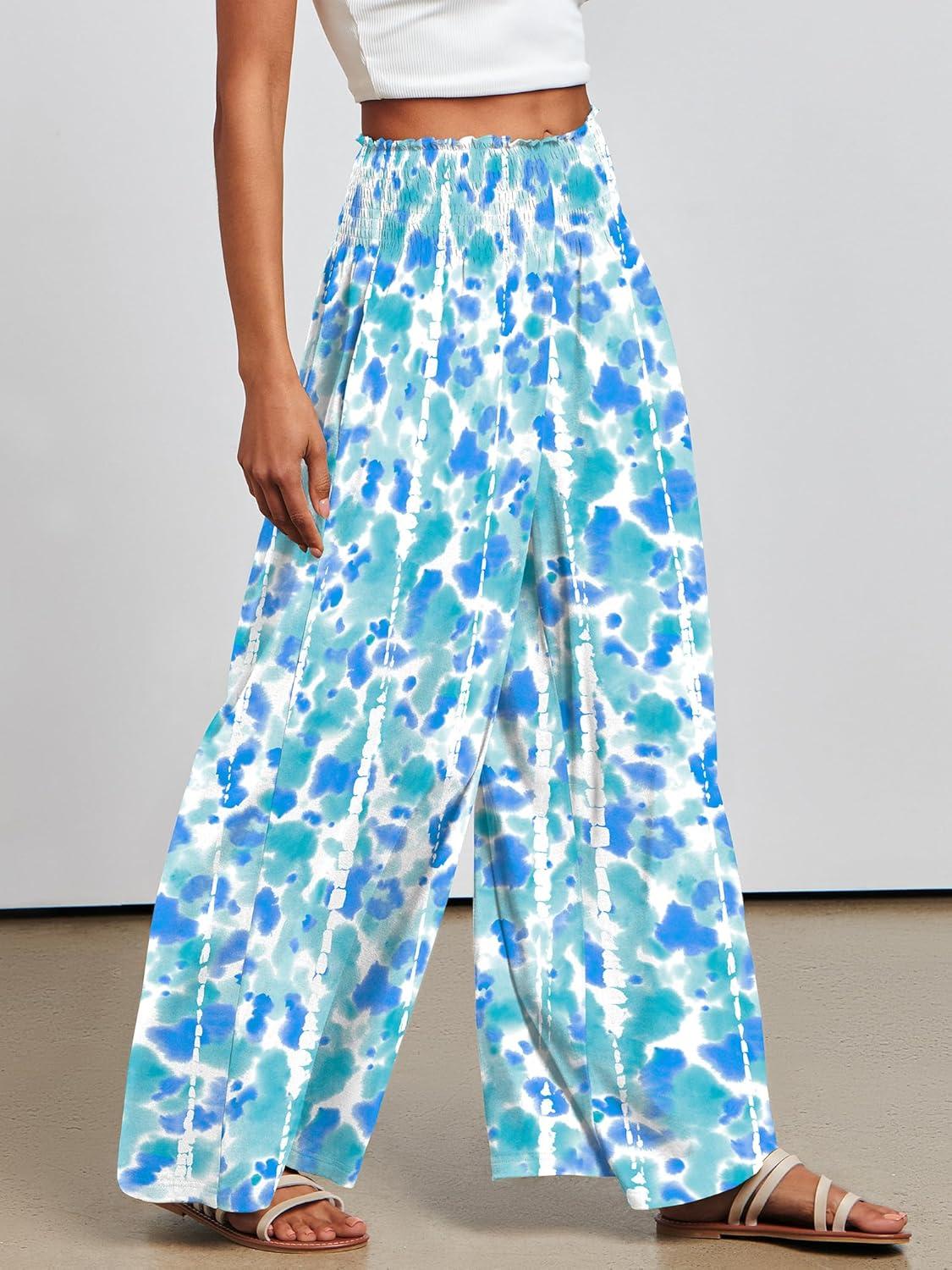 ANRABESS Women Palazzo Pants Summer Boho Bagyy Wide Leg High Smocked Waist Casual Loose Lounge Pant with Pocket(Floral Lake Blue)