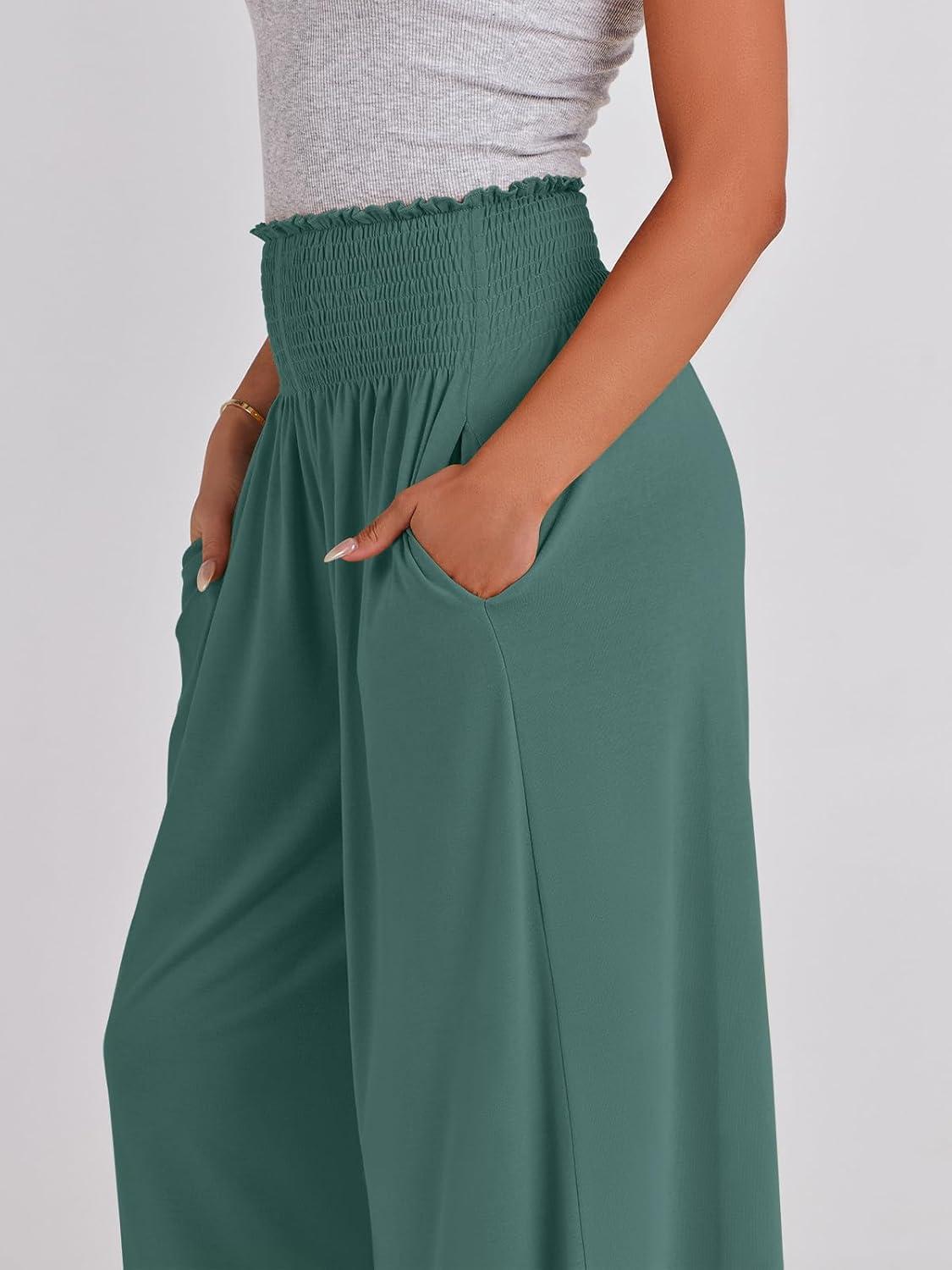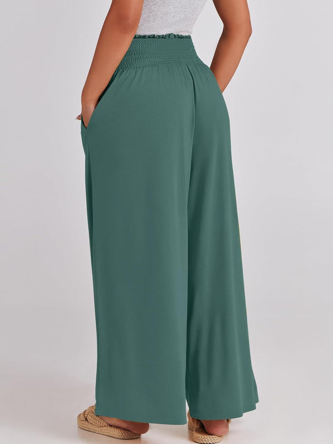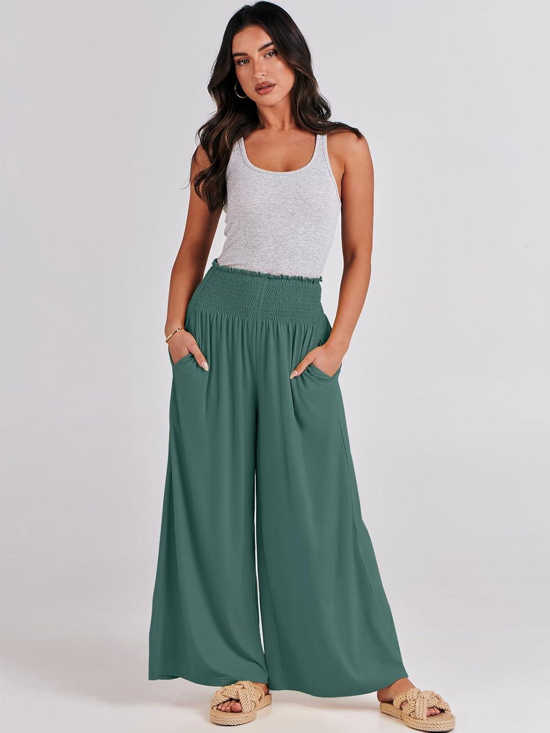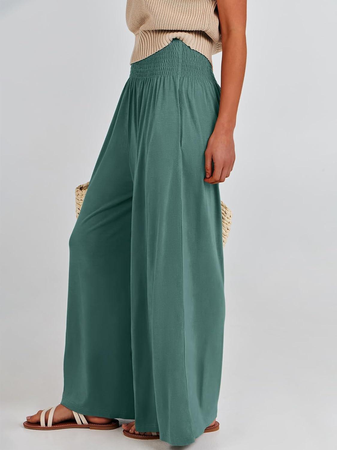 ANRABESS Women Palazzo Pants Summer Boho Bagyy Wide Leg High Smocked Waist Casual Loose Lounge Pant with Pocket(Grass)
