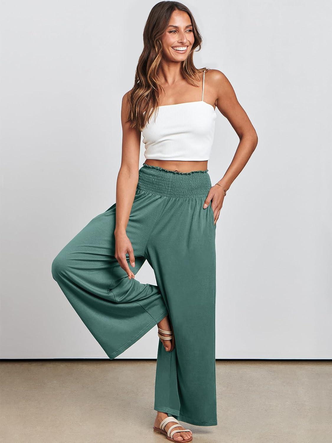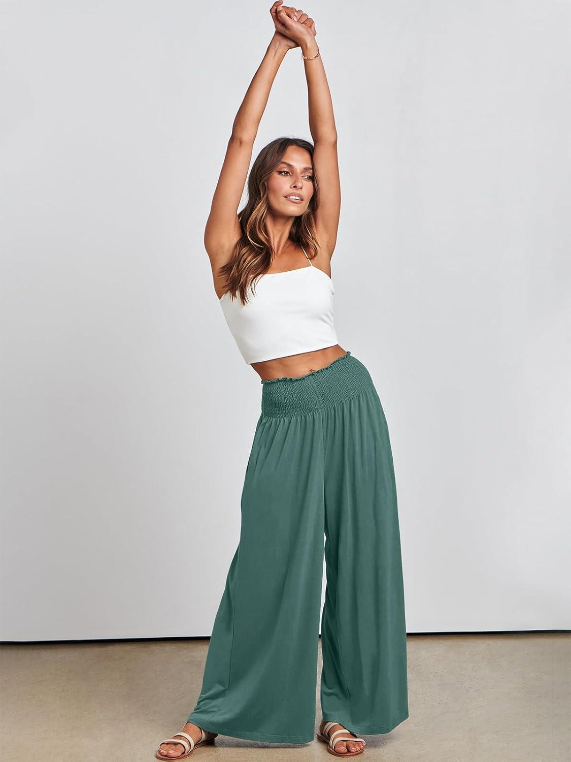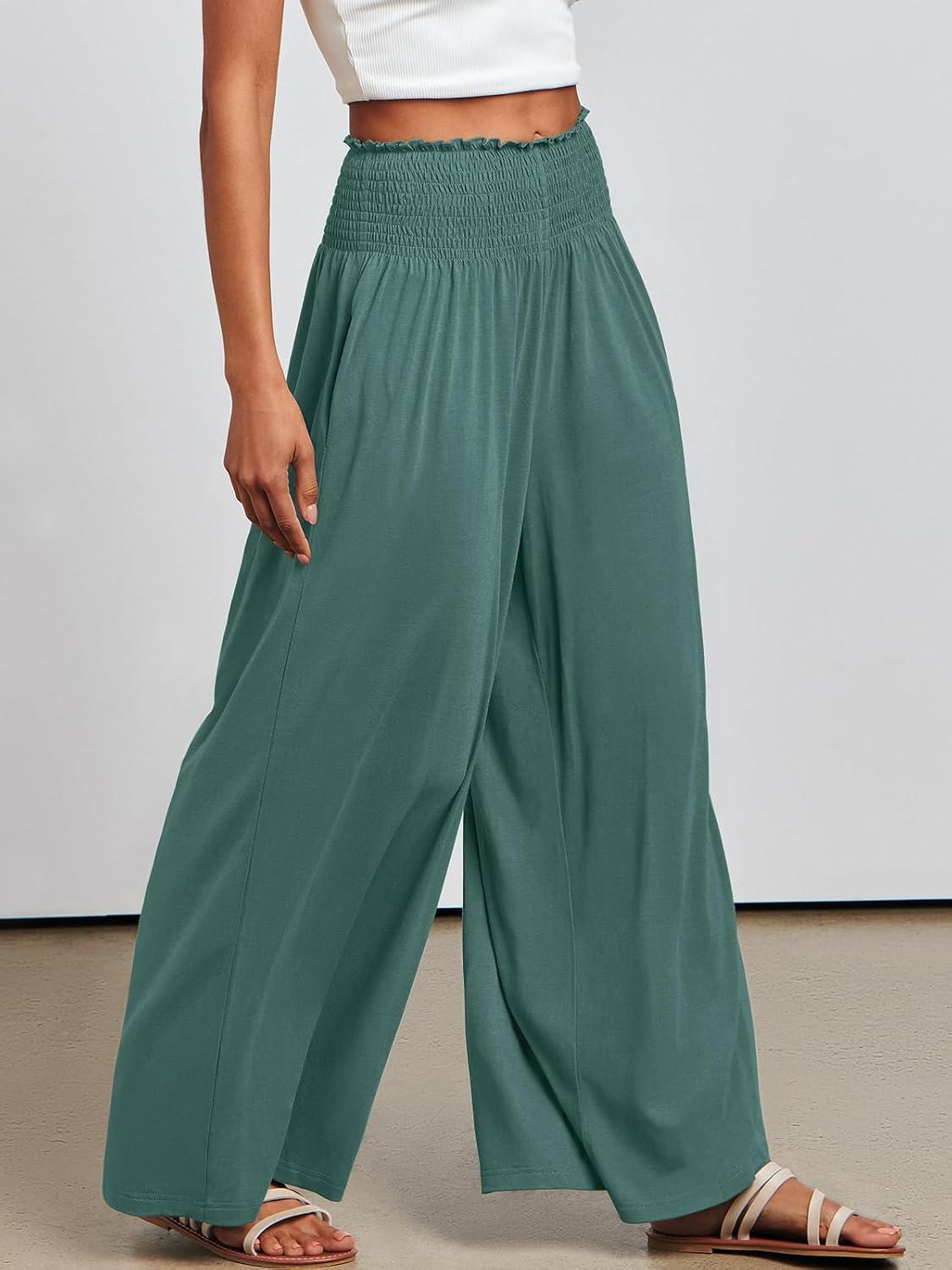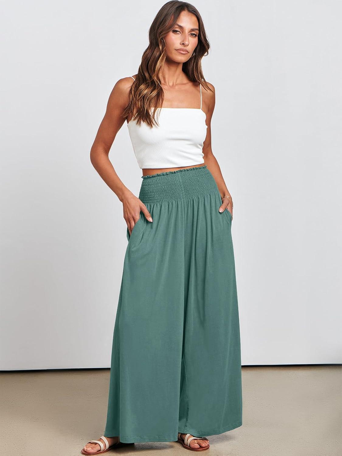 ANRABESS Women Palazzo Pants Summer Boho Bagyy Wide Leg High Smocked Waist Casual Loose Lounge Pant with Pocket(Grass)