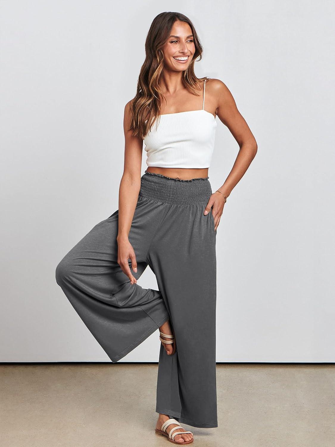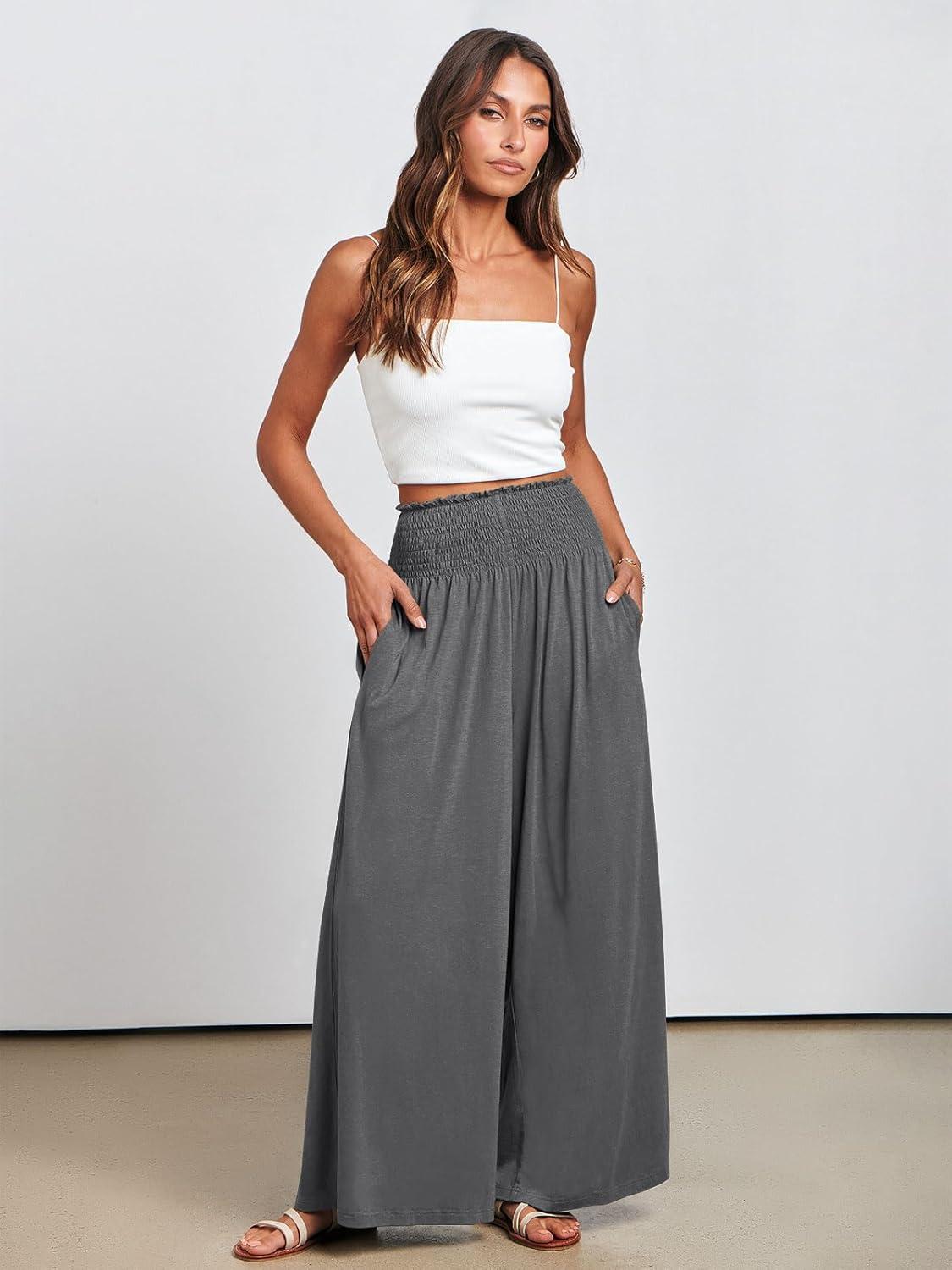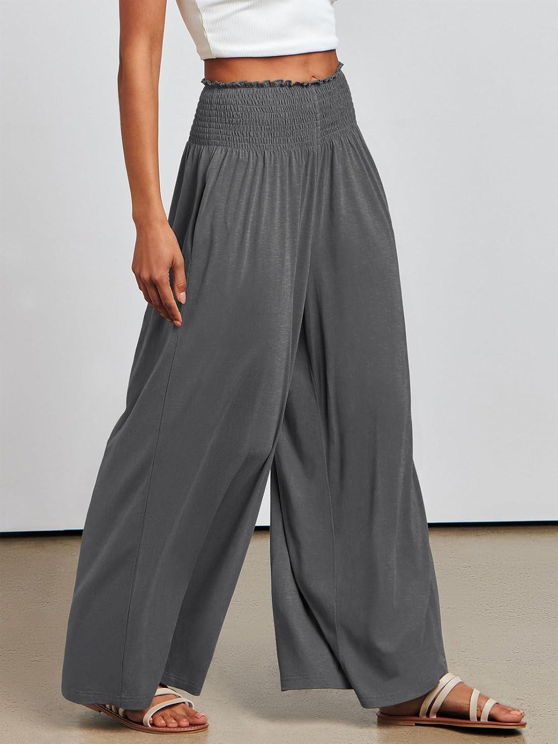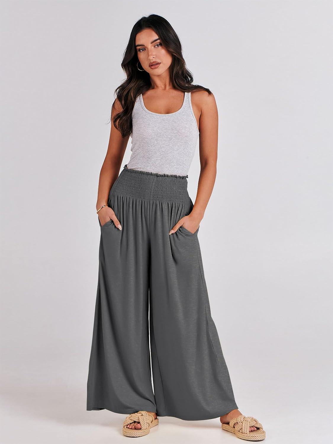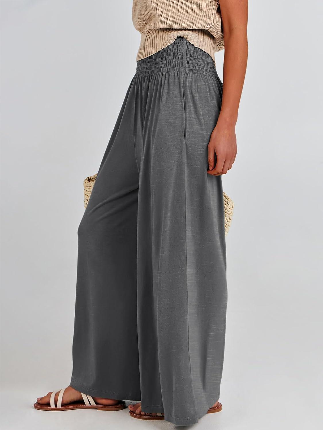 ANRABESS Women Palazzo Pants Summer Boho Bagyy Wide Leg High Smocked Waist Casual Loose Lounge Pant with Pocket(Grey)