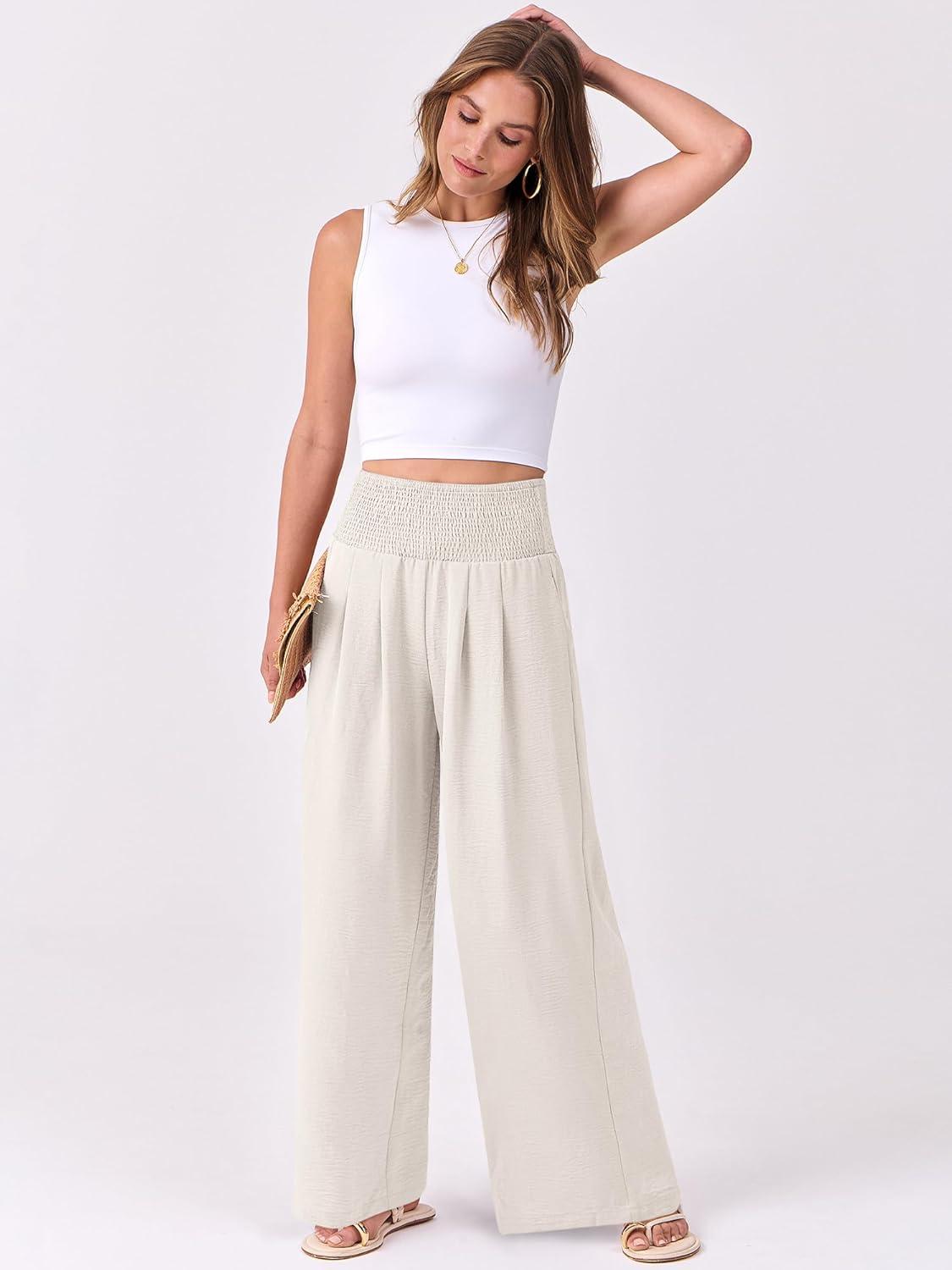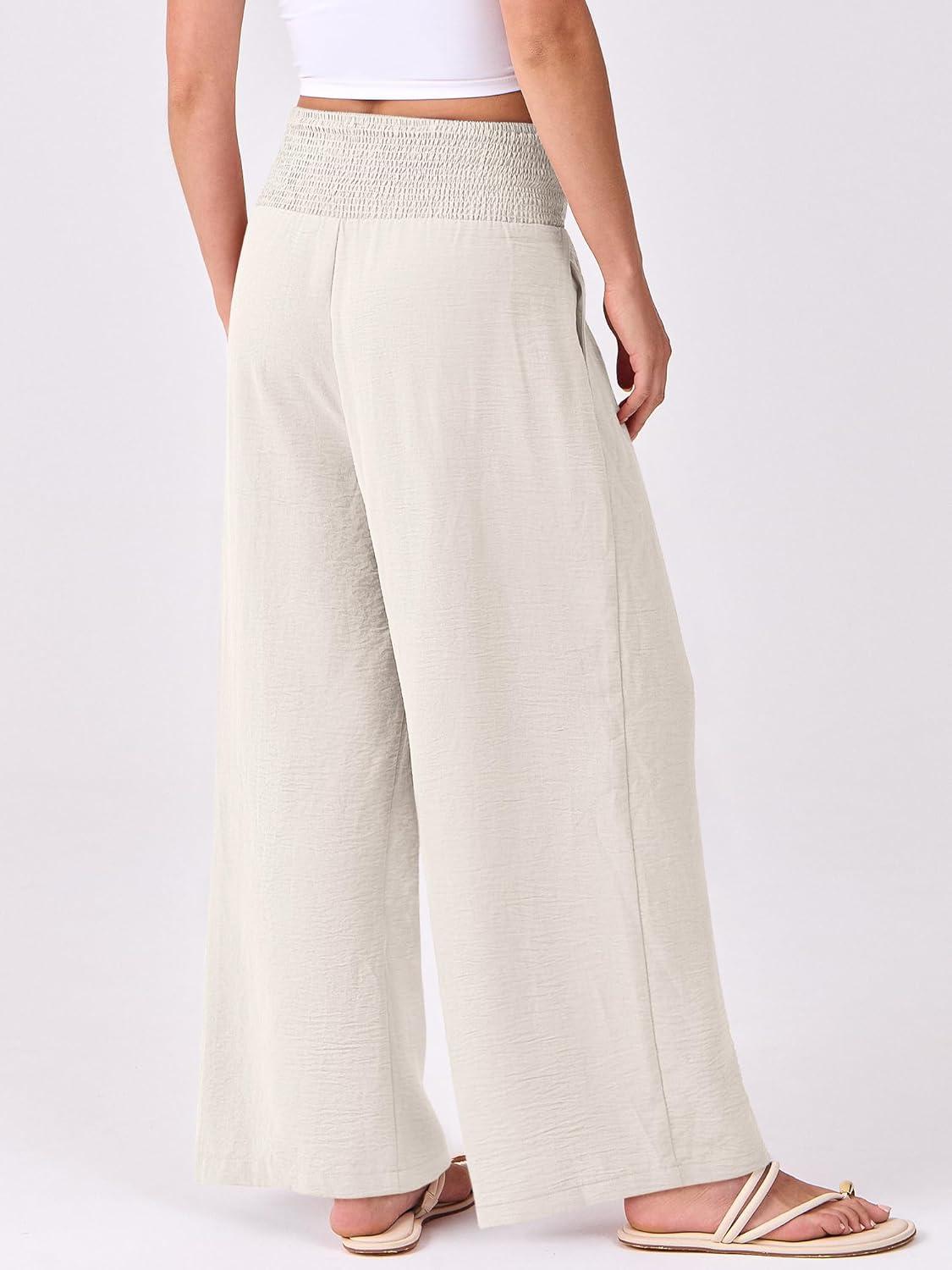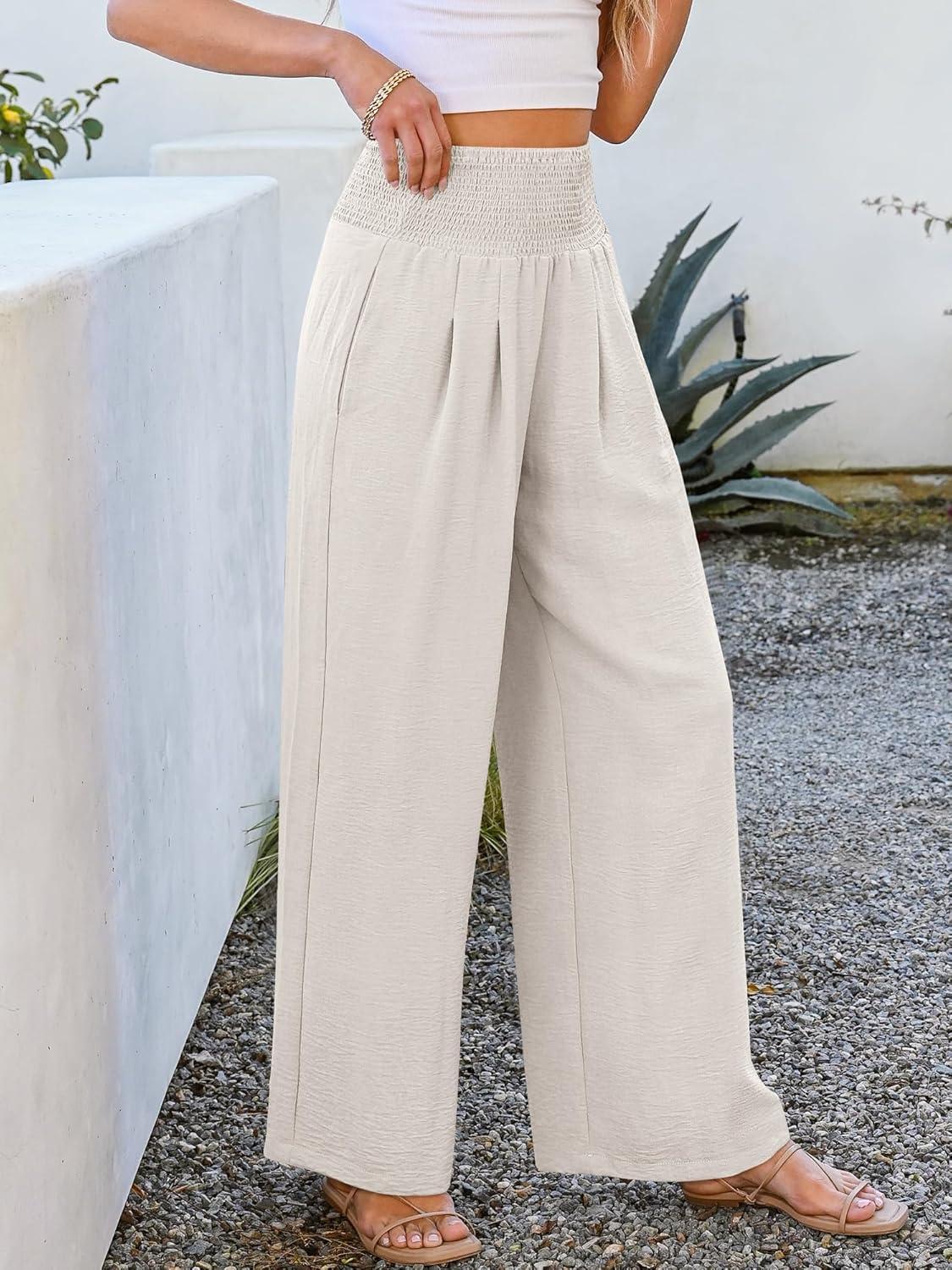ANRABESS Women Palazzo Pants Summer Flowy Wide Leg High Waist Lounge Trousers with Pockets 2025 Casual Beach Vacation Outfits(Beige)