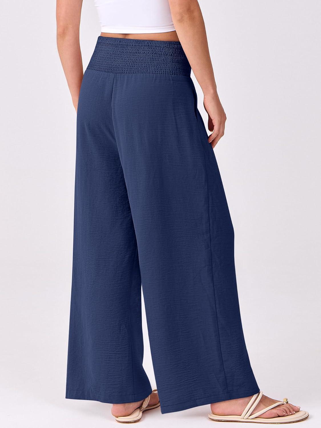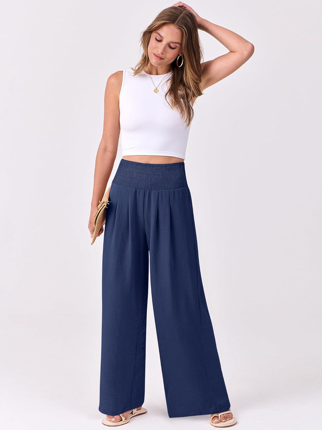ANRABESS Women Palazzo Pants Summer Flowy Wide Leg High Waist Lounge Trousers with Pockets 2025 Casual Beach Vacation Outfits(Navy Blue)