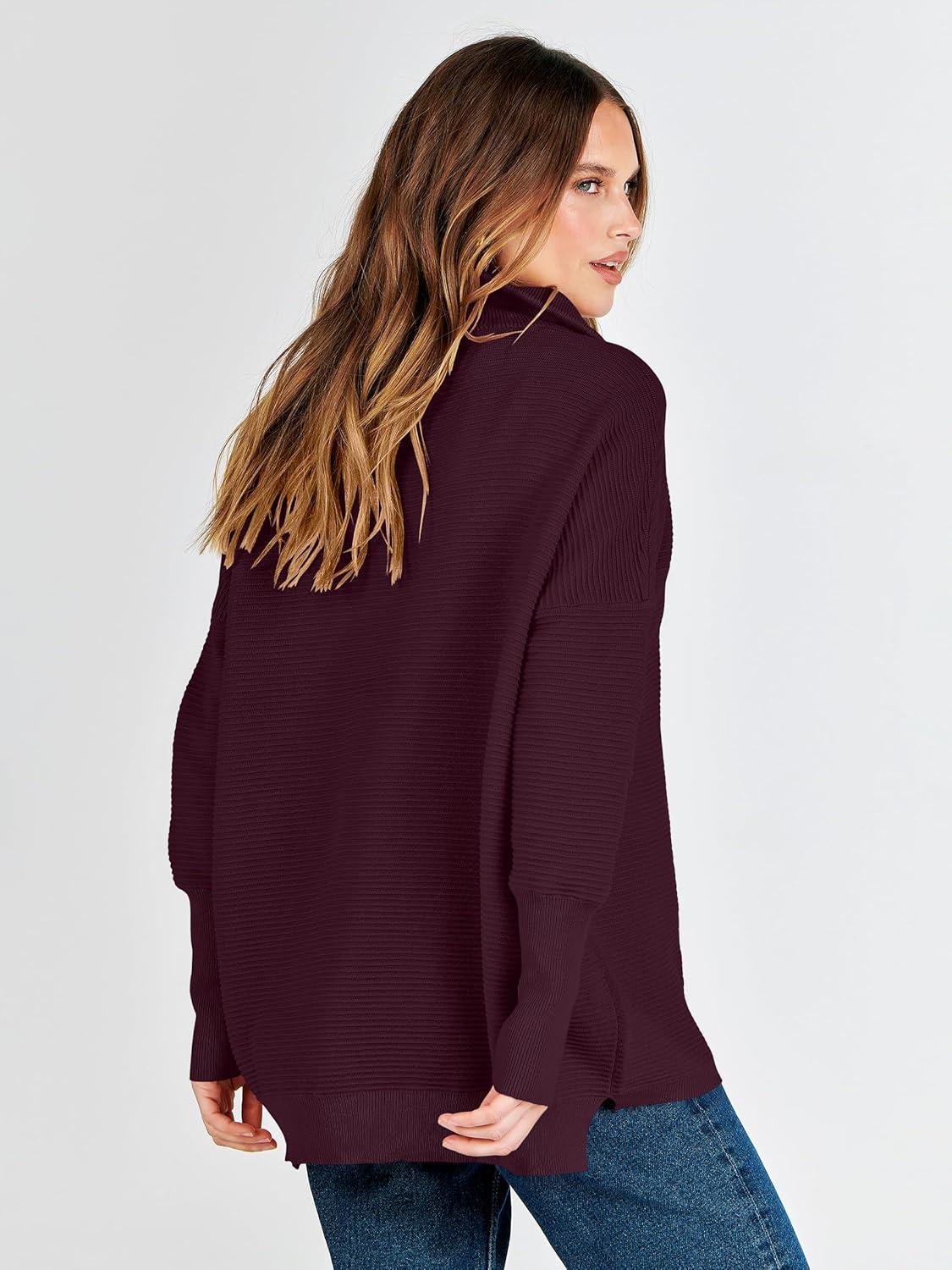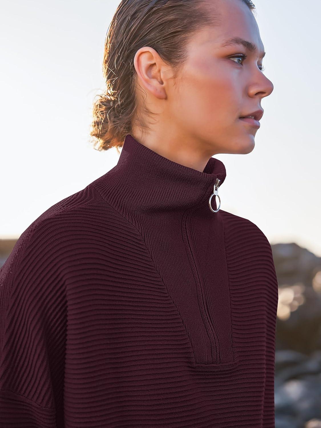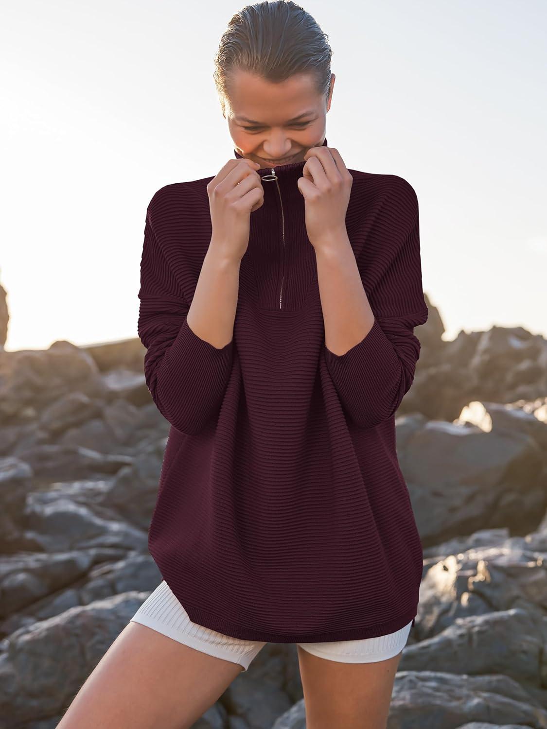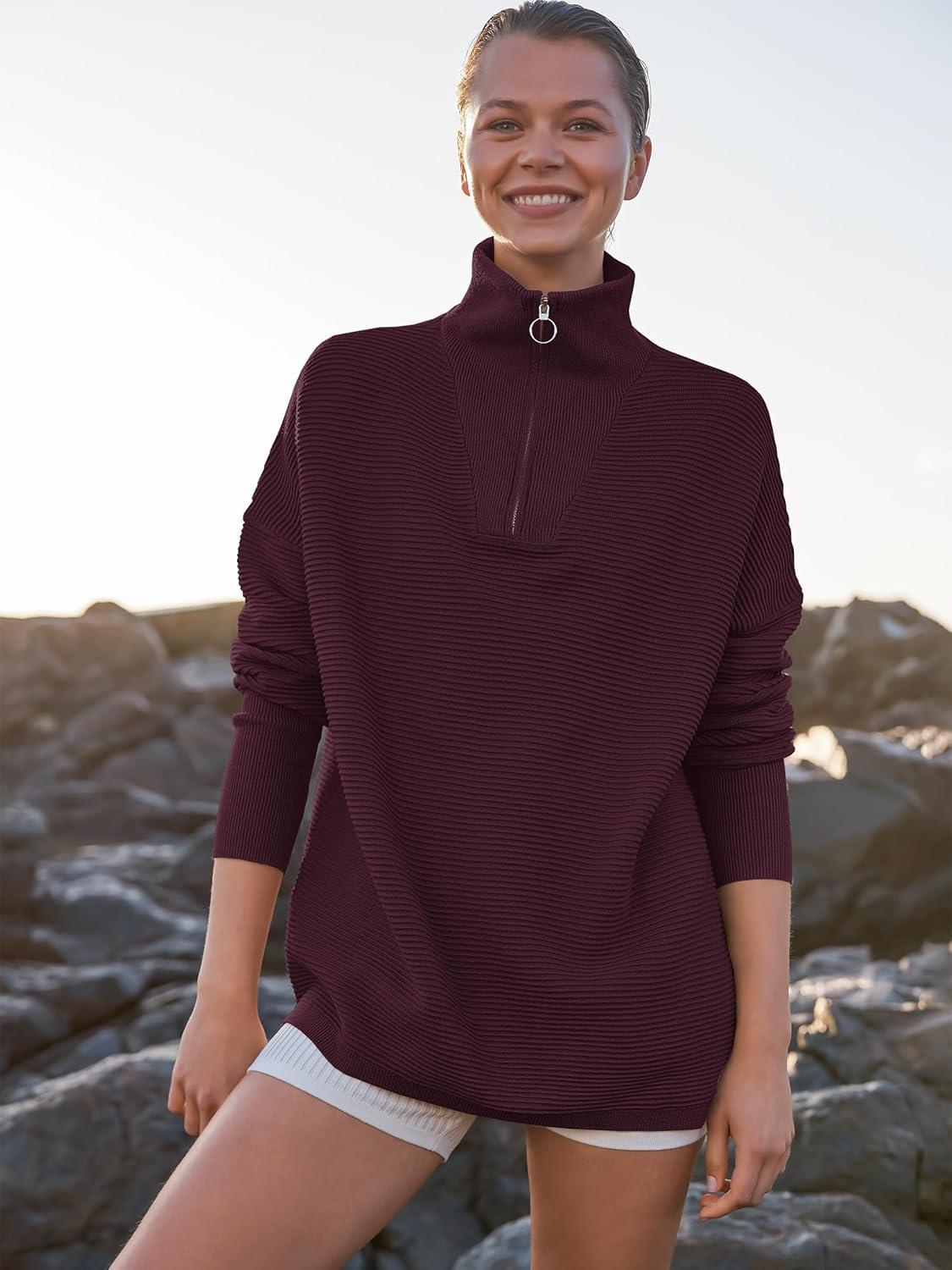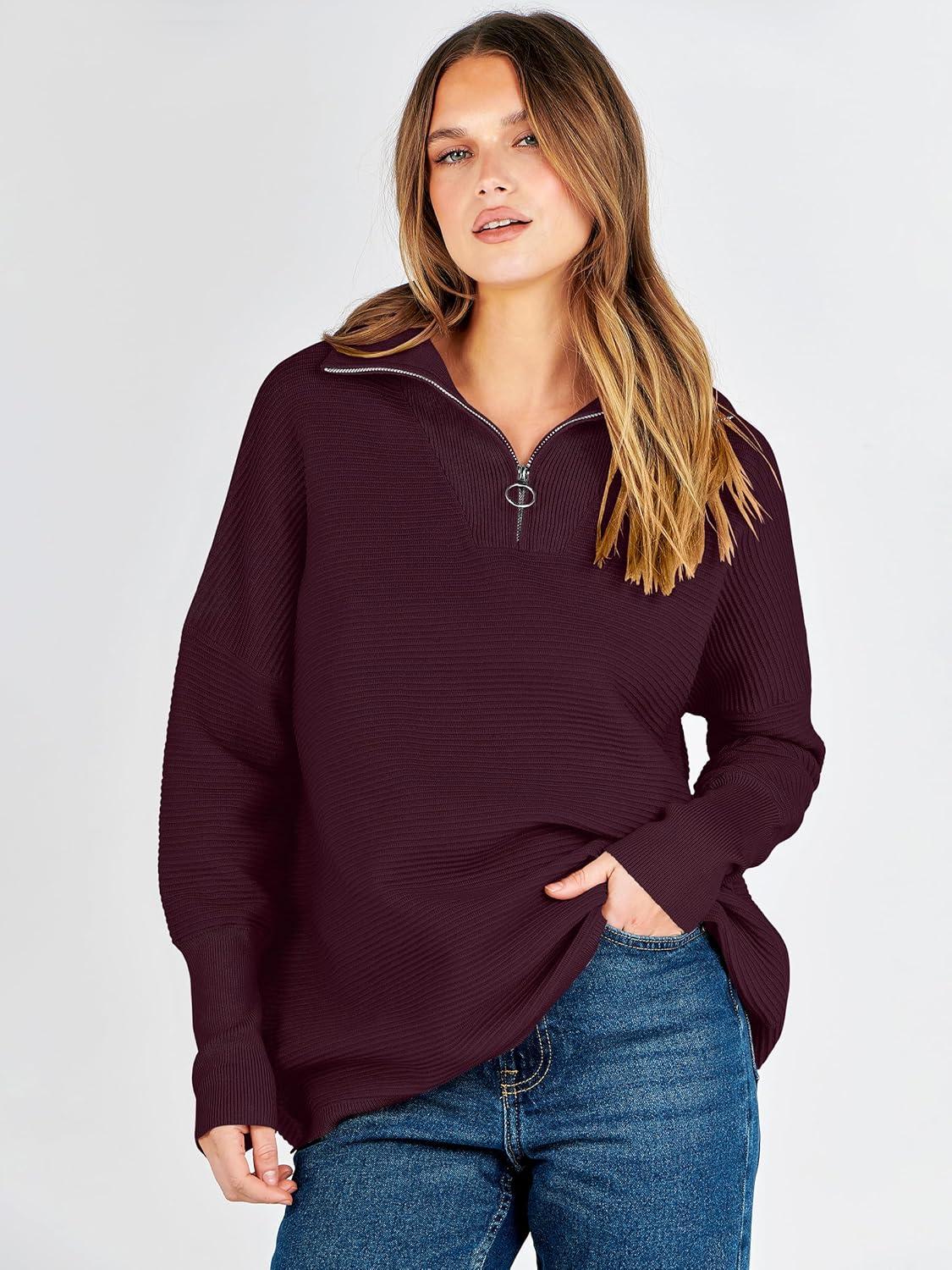 ANRABESS Women Quarter Zip Oversized Casual Loose Rib Knit Cozy Pullover Sweaters Top 2025 Fall Fashion Outfits Clothes(Wine Red)