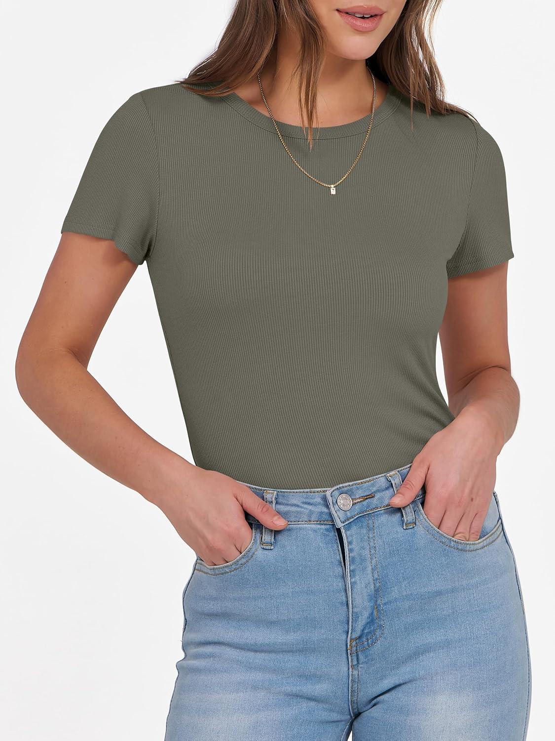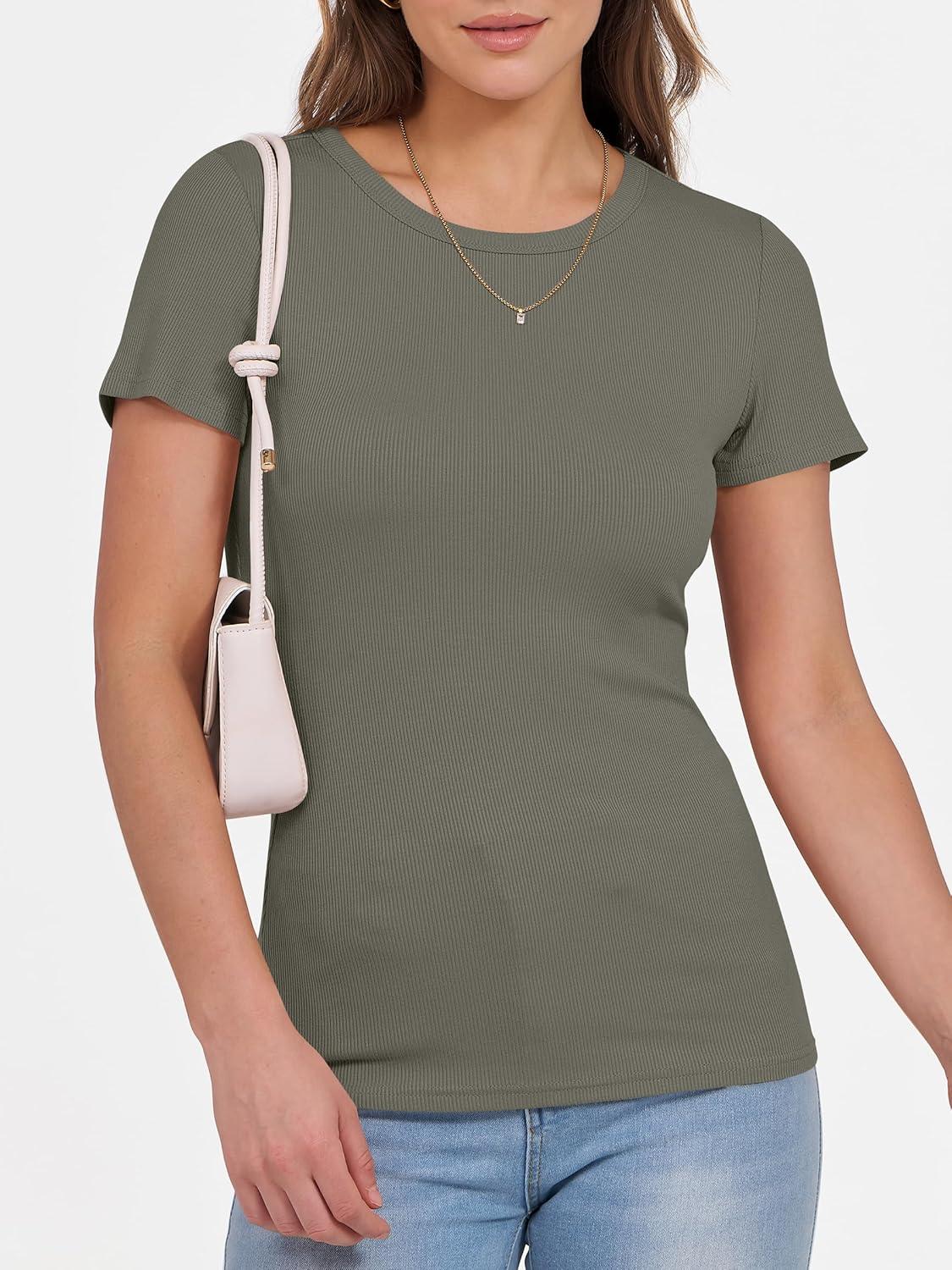 ANRABESS Women Short Sleeve Crewneck Ribbed Knit Slim Fitted Shirts Summer Tops Basic Tee Casual 2025 Fall Outfits Clothes(Army Green)
